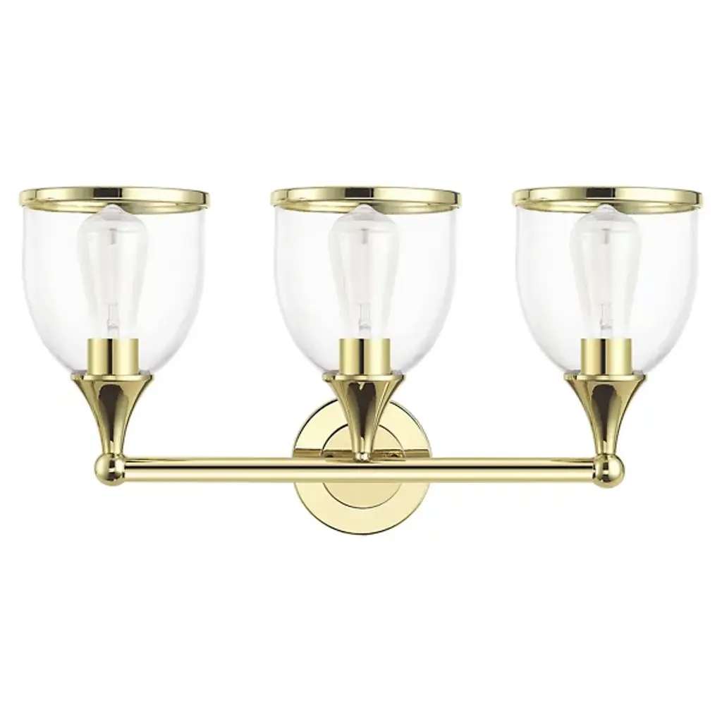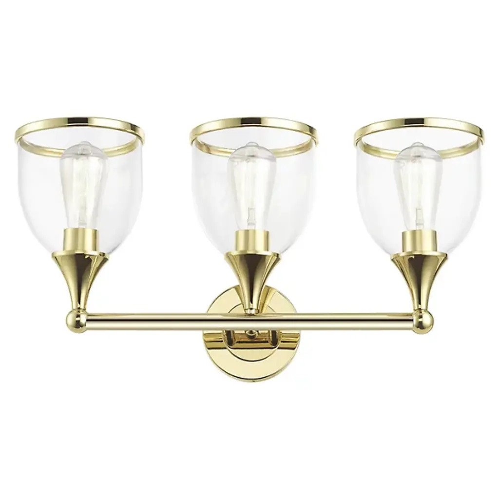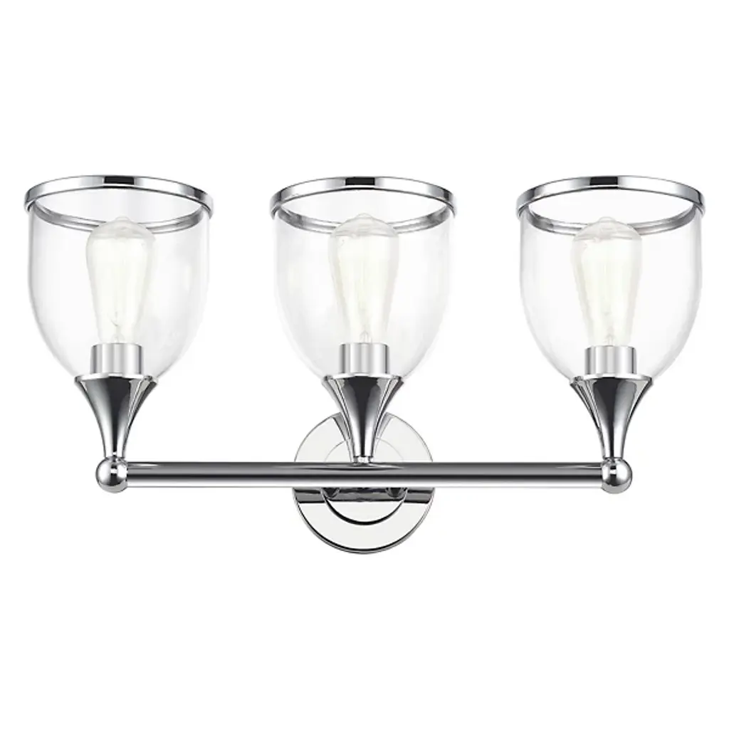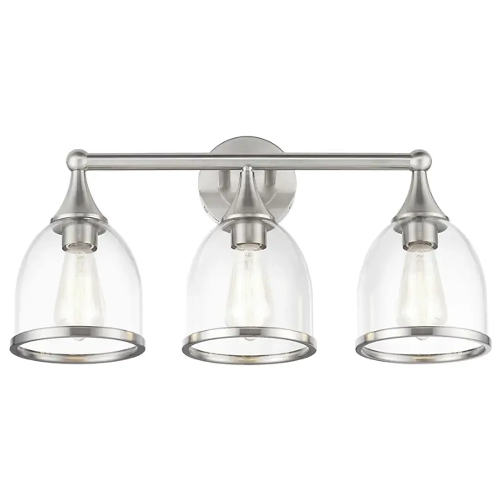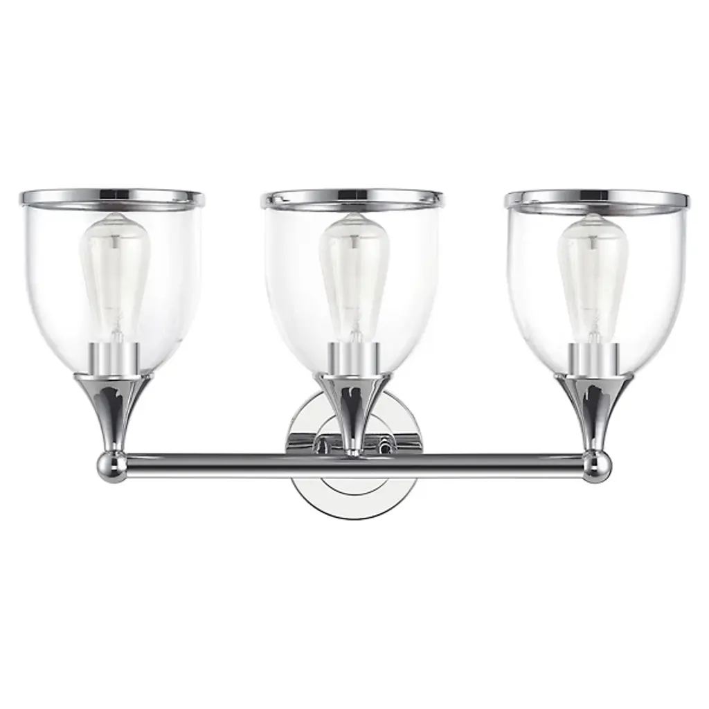 The Dyna Vanity Light from Alder & Ore infuses modern spaces with a touch of vintage sophistication. This transitional fixture features multiple mouth-blown clear glass shades, elegantly framed by metal bands and mounted on a sleek crossbar attached to a stepped circular wall plate. Its versatile design allows for installation above a bathroom mirror, either facing up for ambient light or down for task lighting. The durable steel construction and damp-listed rating ensure both resilience and style, making it a refined choice for more intricate decor.