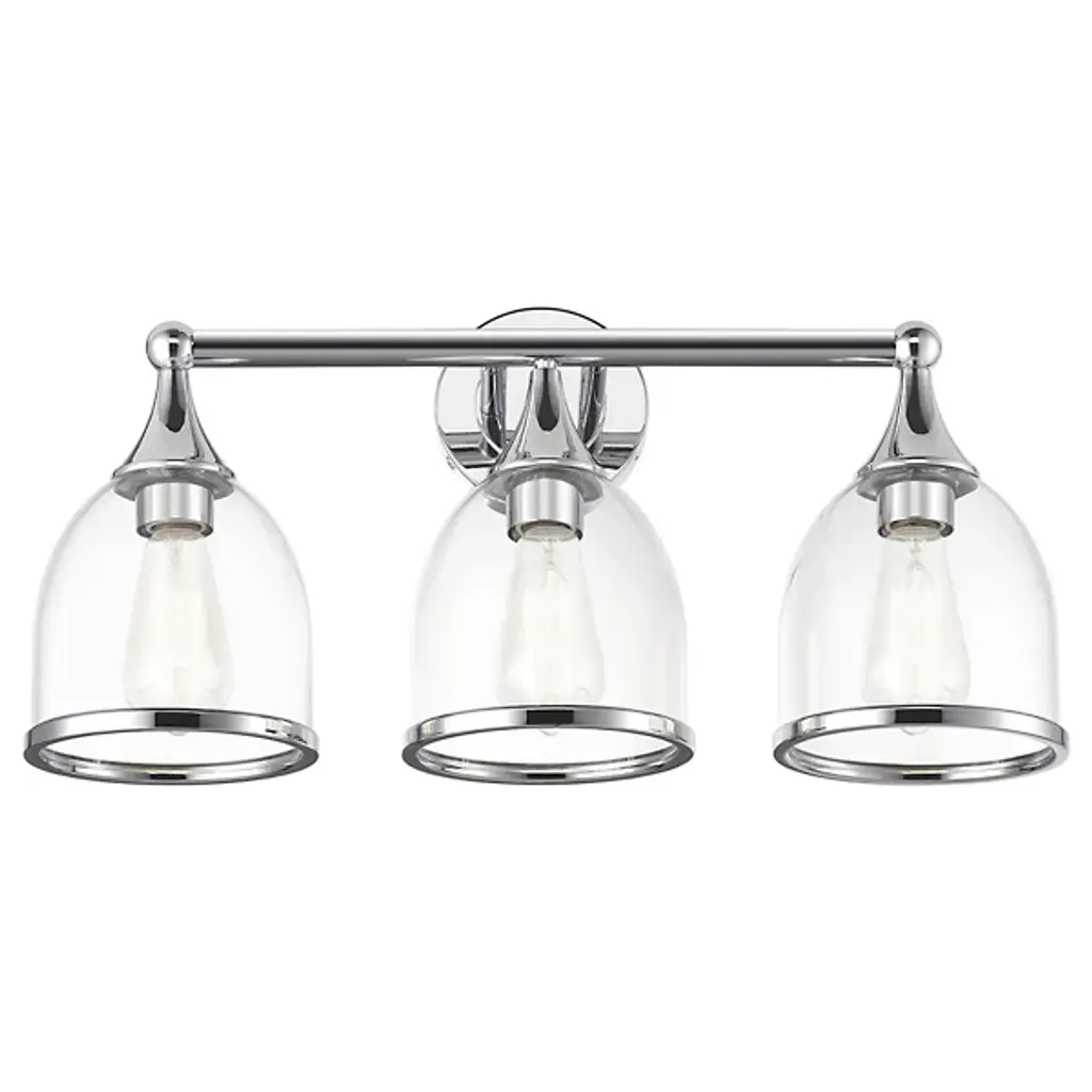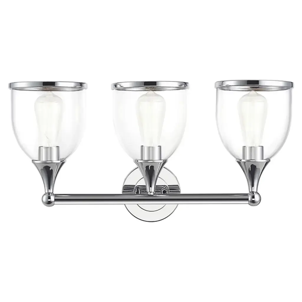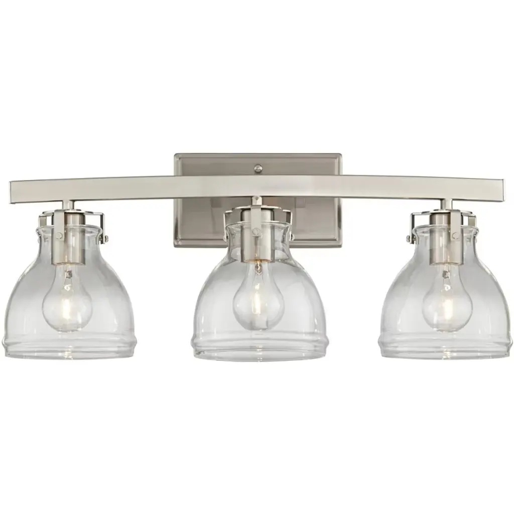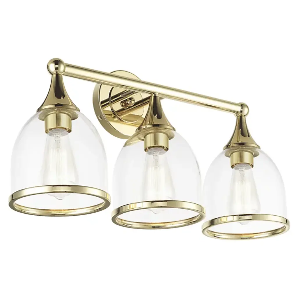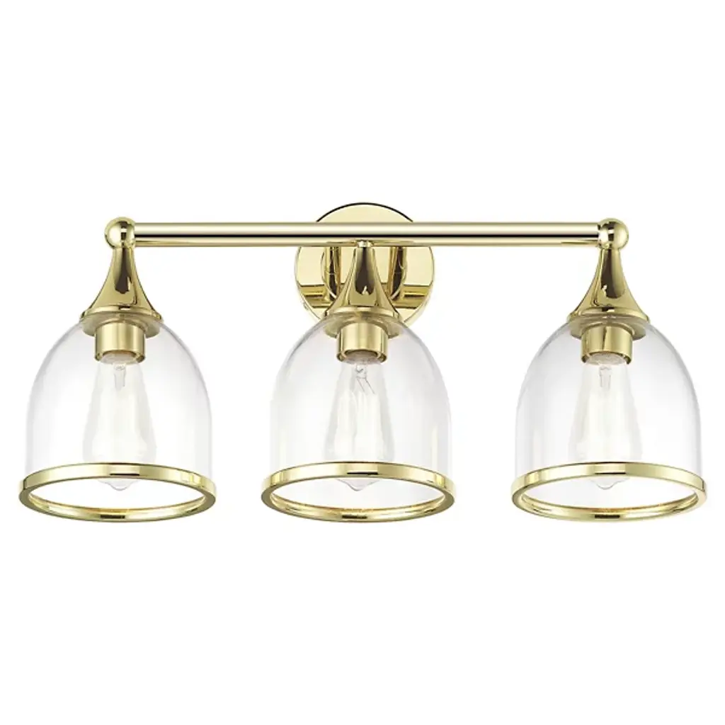 The Dyna Vanity Light from Alder & Ore infuses modern spaces with a touch of vintage sophistication. This transitional fixture features multiple mouth-blown clear glass shades, elegantly framed by metal bands and mounted on a sleek crossbar attached to a stepped circular wall plate. Its versatile design allows for installation above a bathroom mirror, either facing up for ambient light or down for task lighting. The durable steel construction and damp-listed rating ensure both resilience and style, making it a refined choice for more intricate decor.