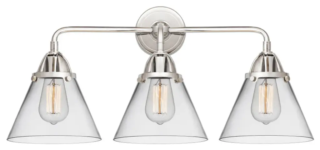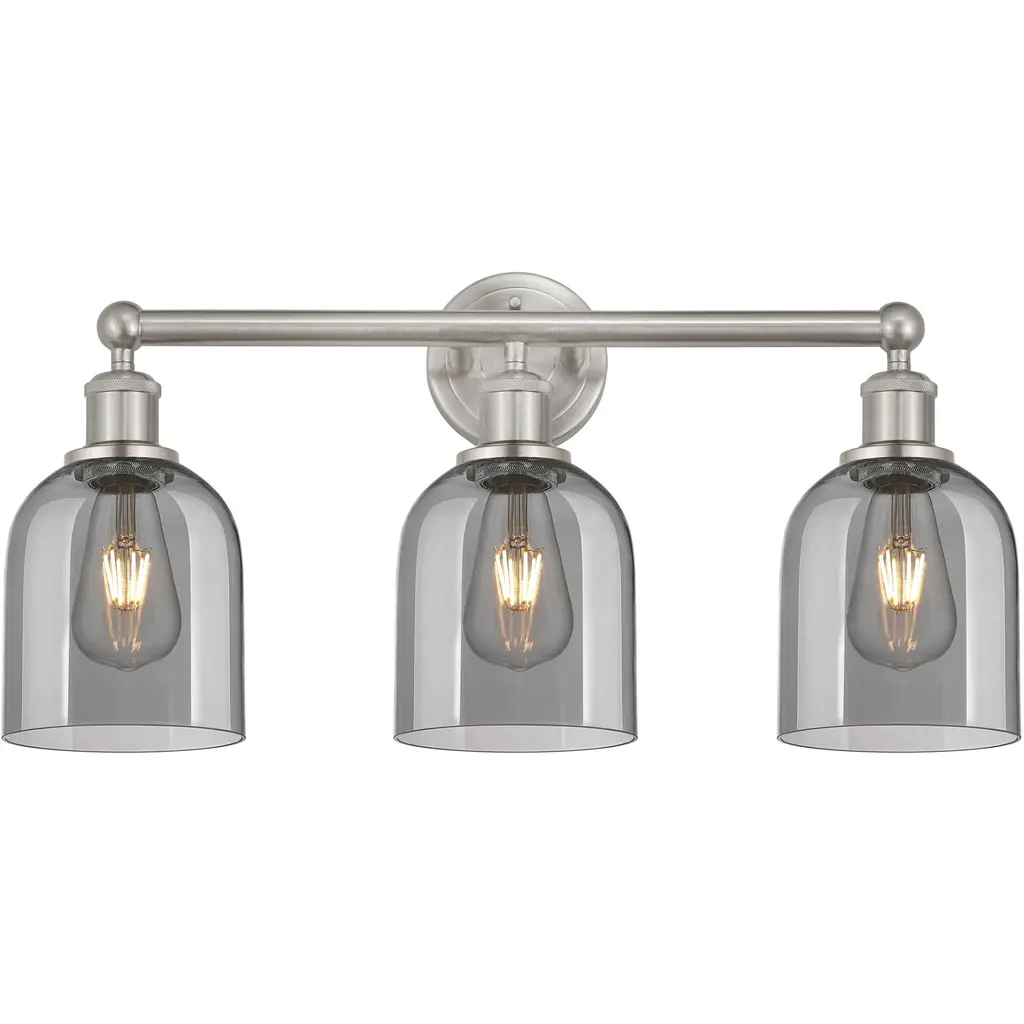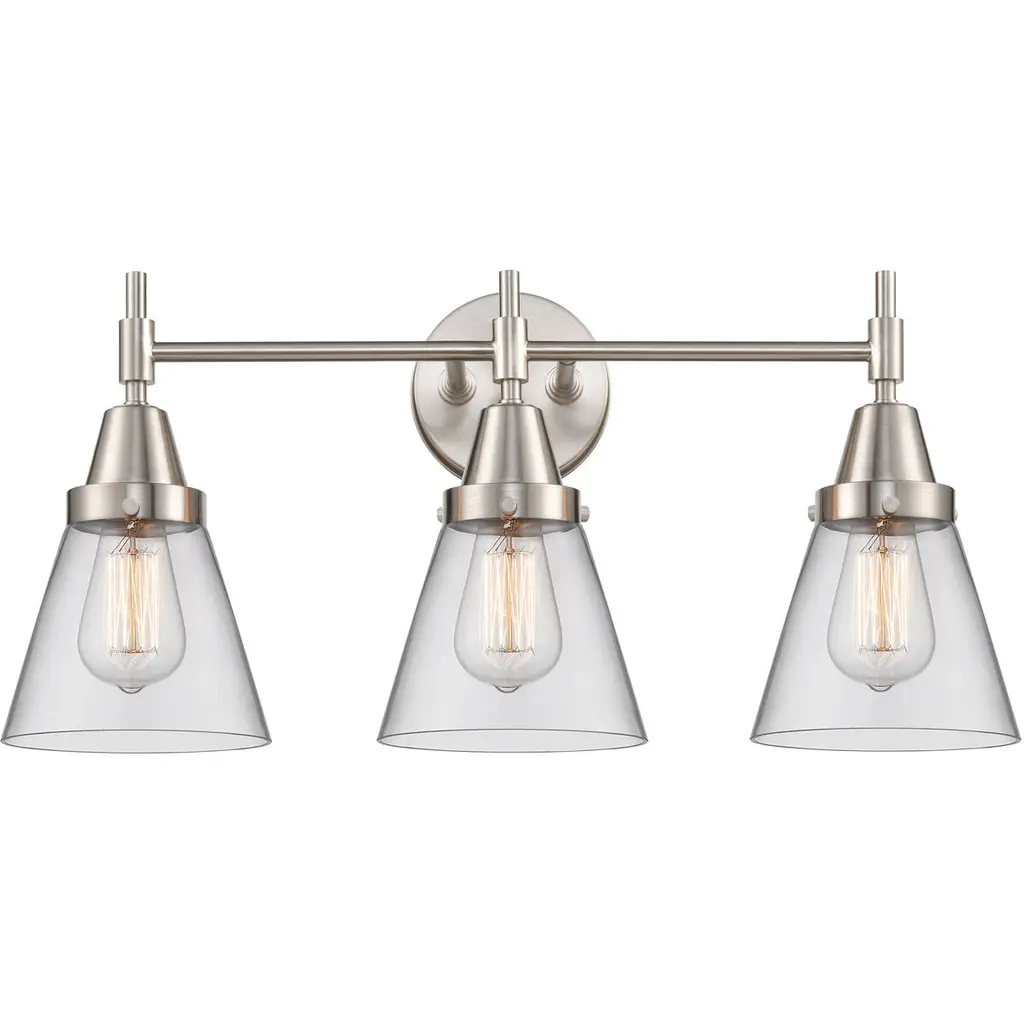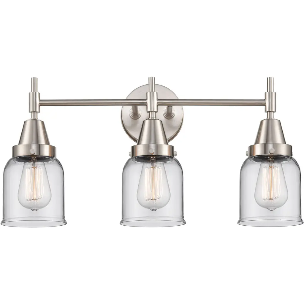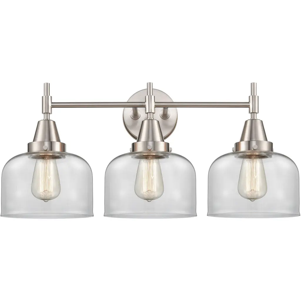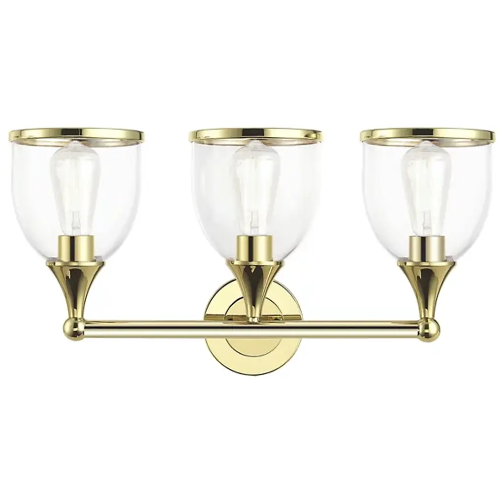 The Dyna Vanity Light from Alder & Ore infuses modern spaces with a touch of vintage sophistication. This transitional fixture features multiple mouth-blown clear glass shades, elegantly framed by metal bands and mounted on a sleek crossbar attached to a stepped circular wall plate. Its versatile design allows for installation above a bathroom mirror, either facing up for ambient light or down for task lighting. The durable steel construction and damp-listed rating ensure both resilience and style, making it a refined choice for more intricate decor.