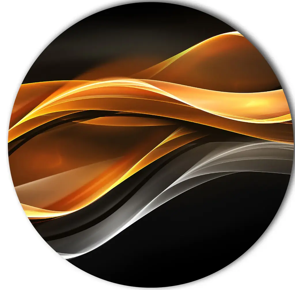 Bring Contemporary Abstraction to your home with this large Circle Metal wall art. This Dynamic Golden Waves Metal Artwork makes it the focal point of any room or office. - White Gloss Coating ensures colors are extra vibrant with light reflection.- Aluminum grade Sheet Metal with 1 inch mounting frame on the back giving the illusion that the artwork is floating on the wall..- Mounting Brackets are included along with instructions.- High Quality Digital images are created directly into a glossy aluminum panel producing a stunning and captivating print into the glossy finish of the metal.- Water, Fire and Scratch resistant HD Aluminum panels.- Looks better than any photo paper and guaranteed to last at least 20 years- Easy to clean with a microfiber cloth. Colors are far superior to regular Canvas Art. - Easy to Hang