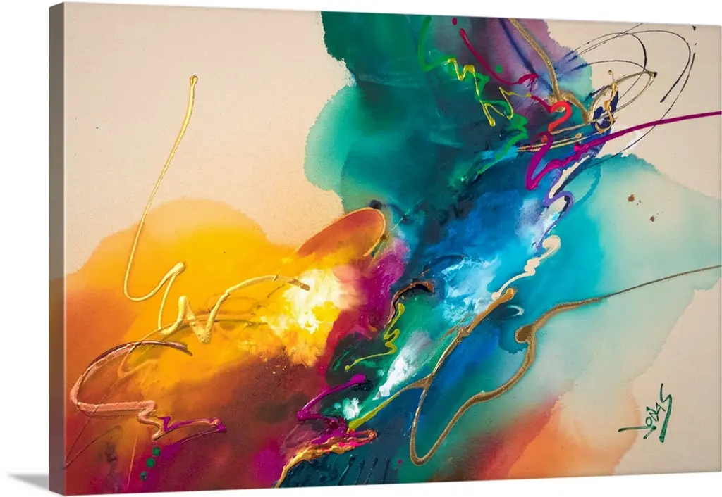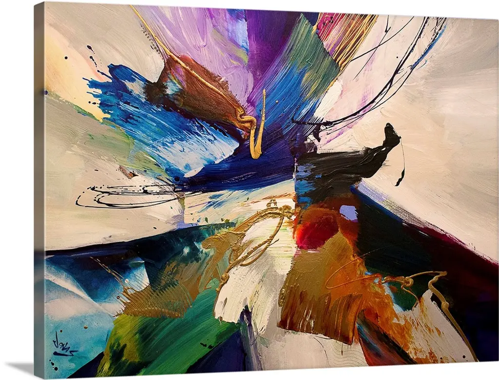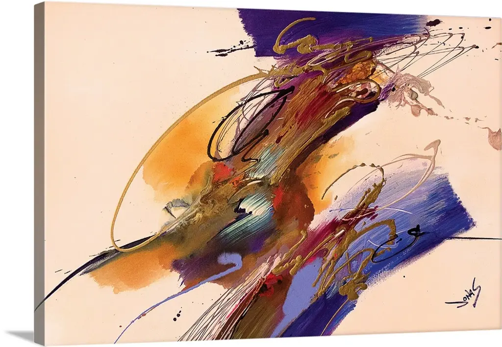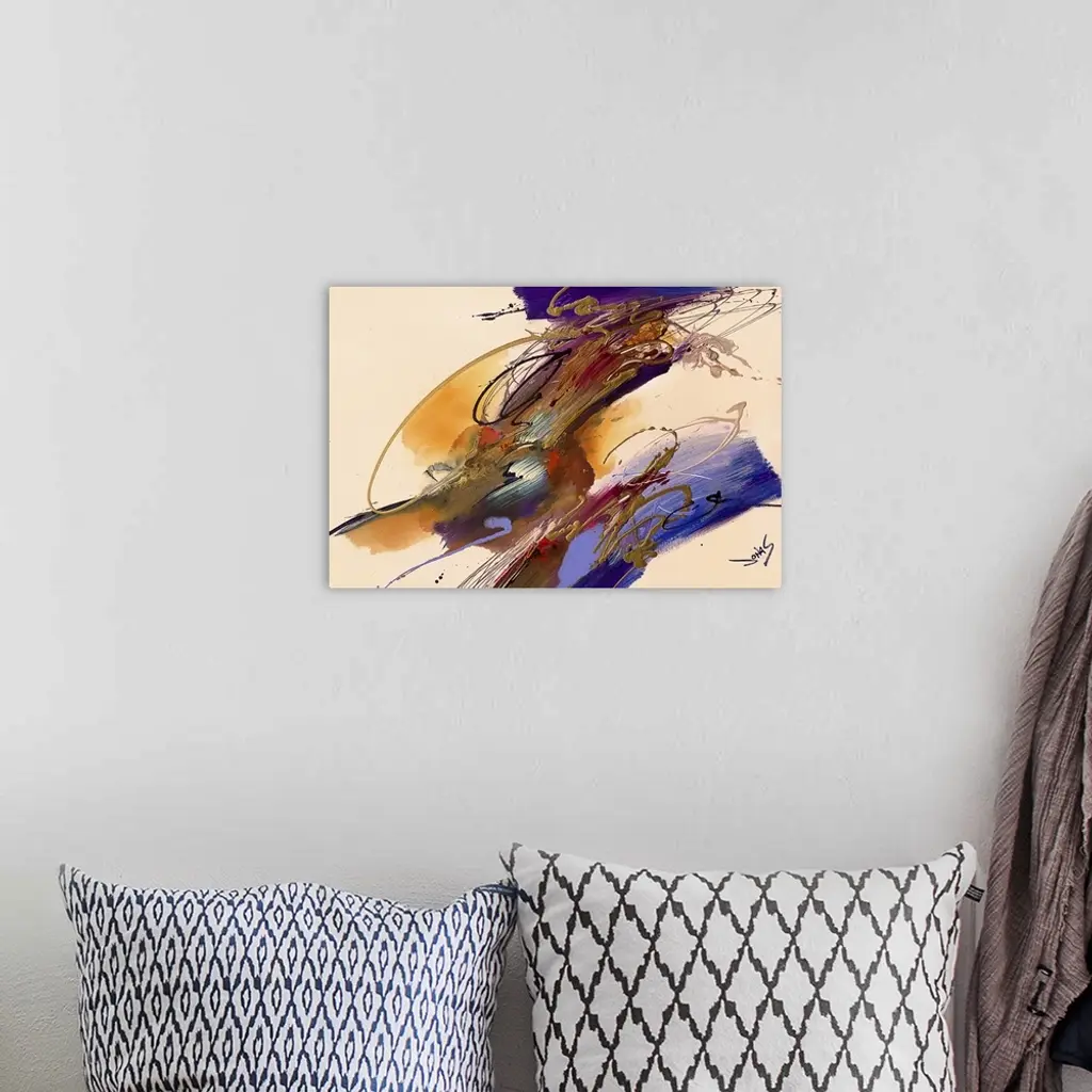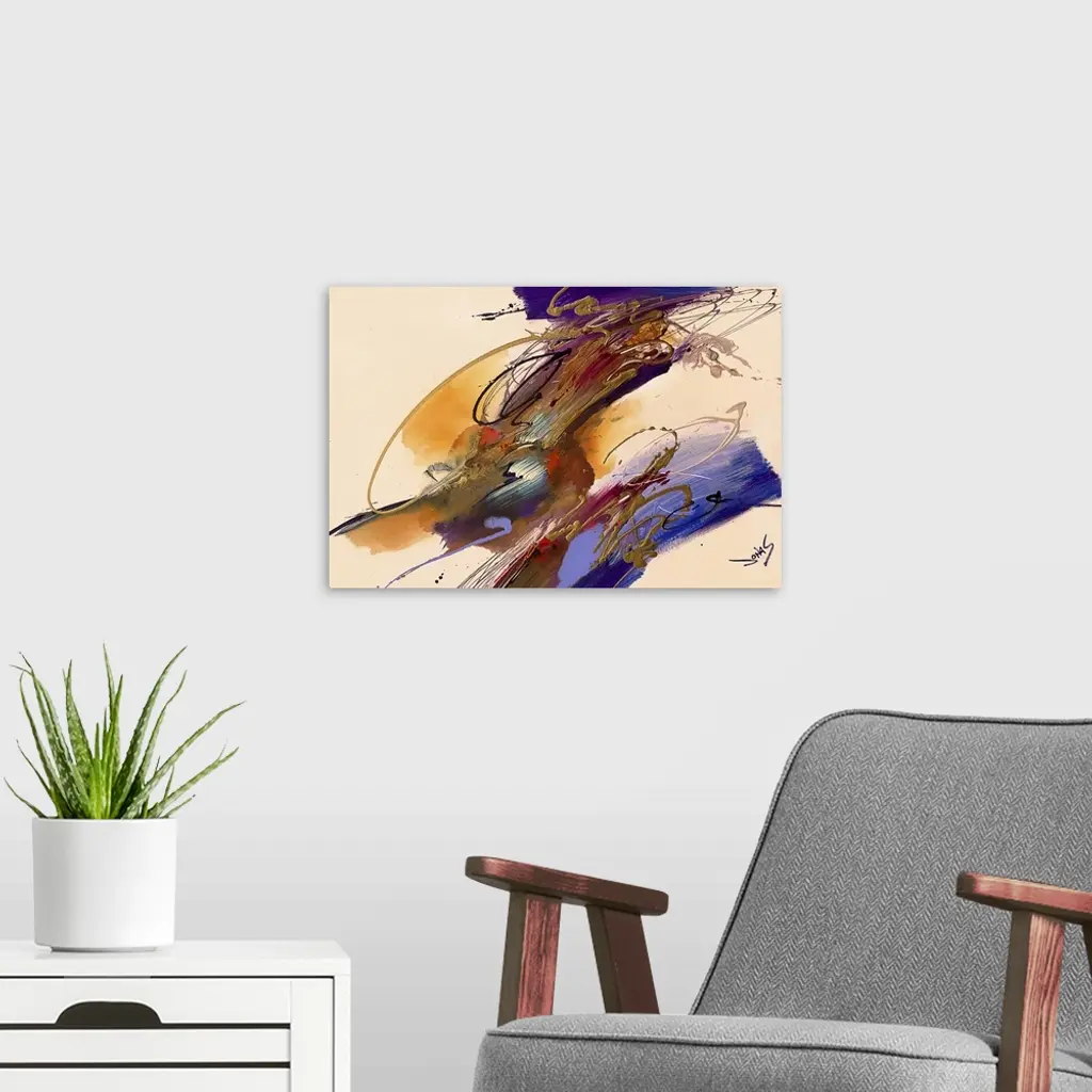 A contemporary abstract painting using earthy tones with splashes of purple and gold in zig zag strokes against a neutral background.