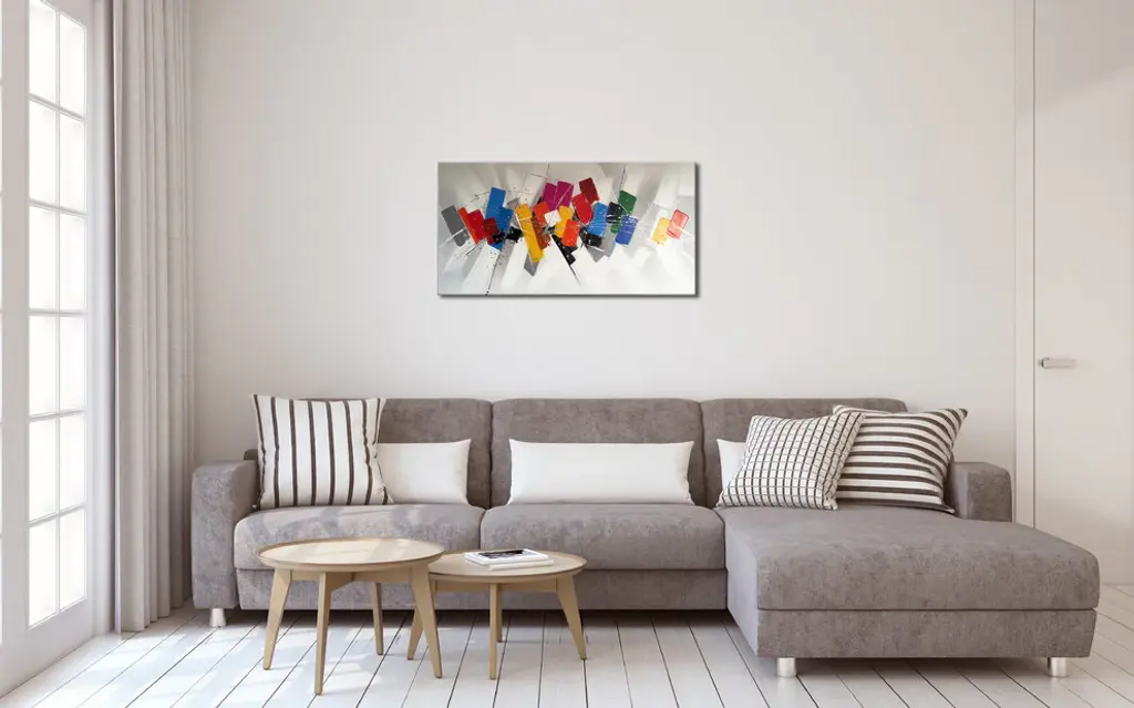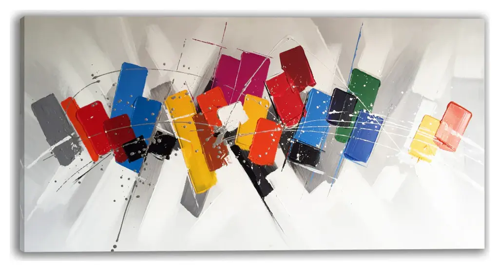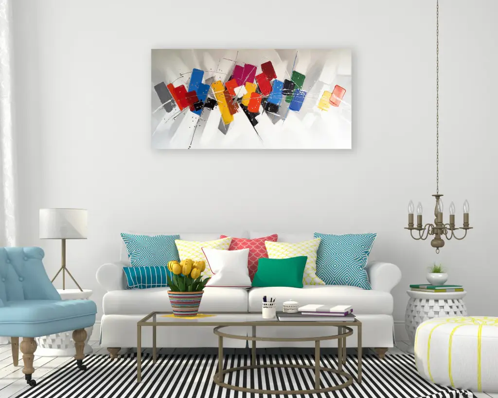 Elevate your space with "Dynamic Spectrum," a one-of-a-kind, 100% hand-painted abstract masterpiece. Each stroke on this canvas was meticulously crafted by our skilled artist, ensuring that you receive a unique piece of art that can''t be replicated. The vibrant rectangles burst across the canvas in a controlled explosion of color, bringing life and movement into any room.Features:Original hand-painted acrylic artwork.A diverse color palette featuring bold reds, blues, yellows, and greens.Dynamic composition with geometric and gestural elements.High-quality canvas stretched over a sturdy wooden frame.Benefits:Adds a vibrant focal point to your living space or office.Complements a wide range of interior decors, from modern to traditional.The interplay of colors and forms stimulates conversation and interest.100% hand-painted guarantee ensures you have an exclusive artwork.