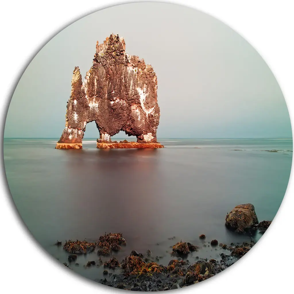 Bring Contemporary Abstraction to your home with this large Circle Metal wall art. This Dyrholaey View Unto Reynisfjara Metal Artwork makes it the focal point of any room or office. - White Gloss Coating ensures colors are extra vibrant with light reflection.- Aluminum grade Sheet Metal with 1 inch mounting frame on the back giving the illusion that the artwork is floating on the wall..- Mounting Brackets are included along with instructions.- High Quality Digital images are created directly into a glossy aluminum panel producing a stunning and captivating print into the glossy finish of the metal.- Water, Fire and Scratch resistant HD Aluminum panels.- Looks better than any photo paper and guaranteed to last at least 20 years- Easy to clean with a microfiber cloth. Colors are far superior to regular Canvas Art. - Easy to Hang