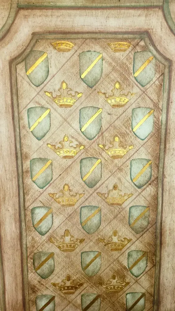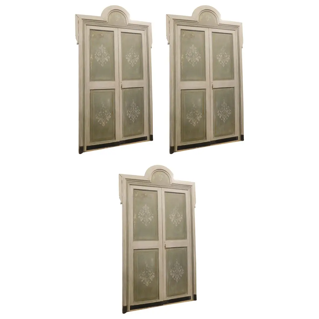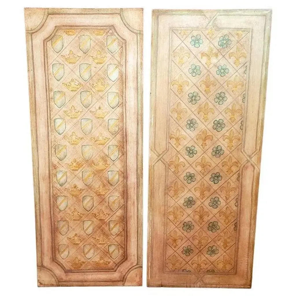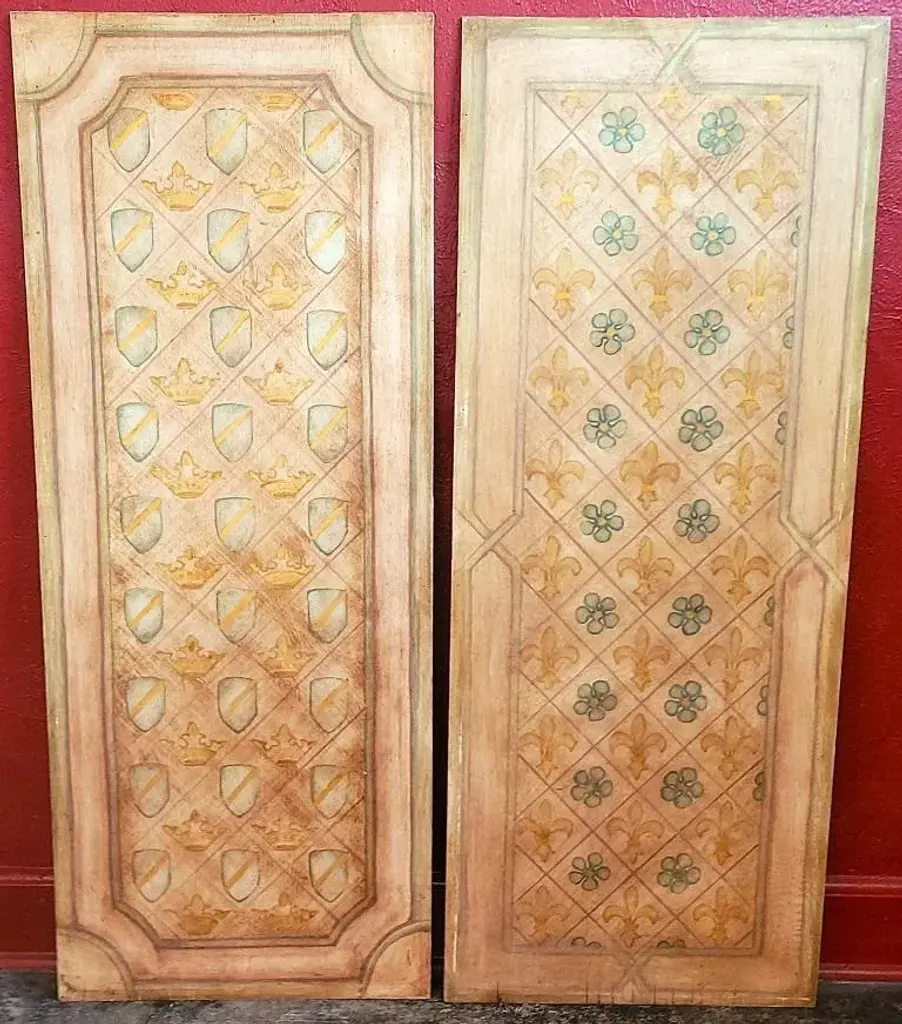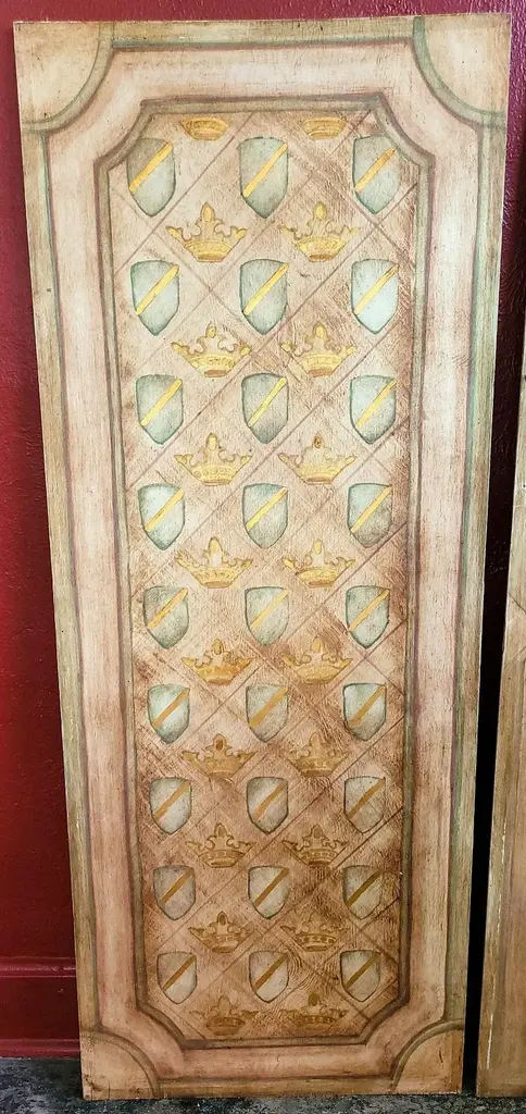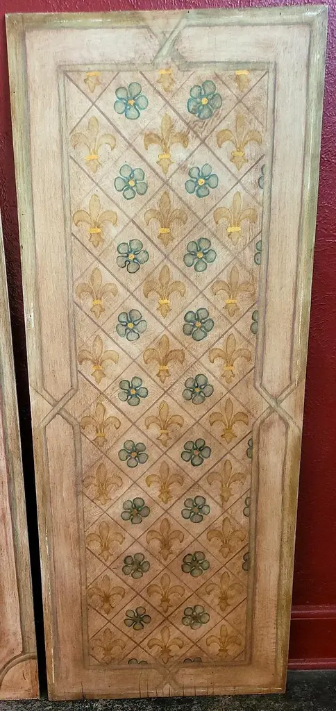 Presenting a unique set of early 20C hand painted large sized ceiling or wall panels by Nena Claiborne. Art Nouveau/Deco Era hand-painted ceiling or wall panels by Dallas Interior Design Legend……..Nena Claiborne…… circa 1929/30. These panels are in great original condition. They were custom designed and hand-gilded and hand-painted by Nena Claiborne for the Obenchain Family when they built their Mansion on Armstrong Parkway in Highland Park, TX in 1929. Ms. Claiborne was the interior designer for that home and she was also attached to early Neiman Marcus. She also did an original hand-painted mirror (also in our collection). These panels were on the Ceiling of the Library in the Armstrong Pkwy Mansion. There are 2 different designs and sizes of these panels. There are these larger ones (61 x 24 ) and medium sized ones ( 48 x 24) … listed separately on this site. The panel on the left features a series of turquoise armorial shields with a gold cross band and French Royal Golden Crowns, all contained within diamond shaped sections and hand painted borders. The panel on the right features a series of golden Fleur de Lis and Green Flower heads with gold central stem, all contained within diamond shaped sections and hand painted borders. We have 12 of the larger and 10 of the medium panels (22 in total) ….. 6 sets of each pattern in the large size and 5 sets of the medium. We are selling them in pairs of both designs. Pieces of early Dallas history ! Nena Claiborne: Nena Claiborne is regarded as a Dallas Legend in Interior Design. She was one of the first Interior Designers in Dallas and she soon came to the attention of Neiman Marcus and became attached to them. She specialized in the interior design of some of the earlier and finest homes in Highland Park, Dallas in the 1920’s, 30’s and 40’s. Many of the most prominent Dallas Interior Designers of today still name Nena Claiborne as one of their main influencer’s in the business.