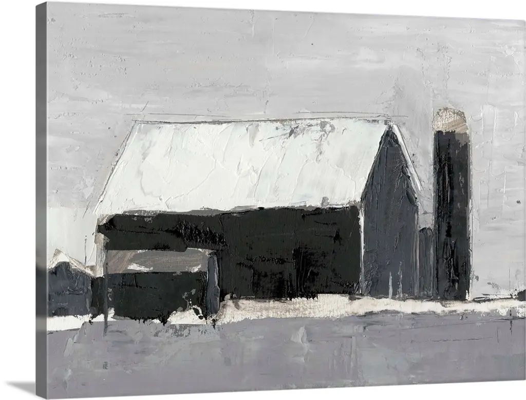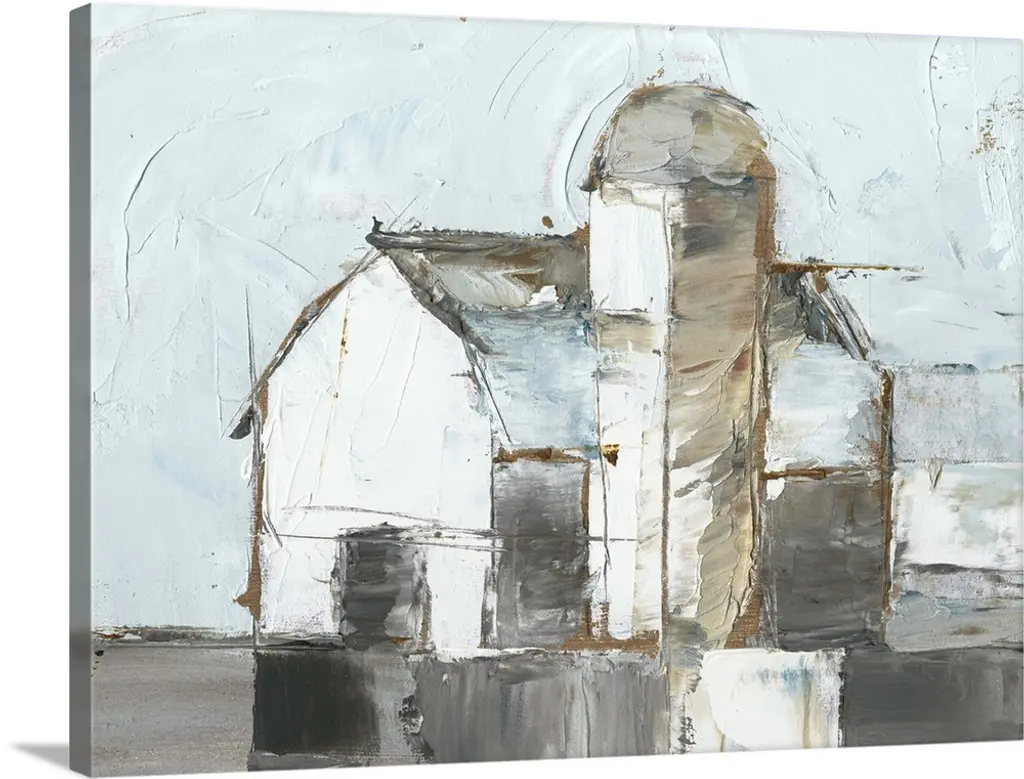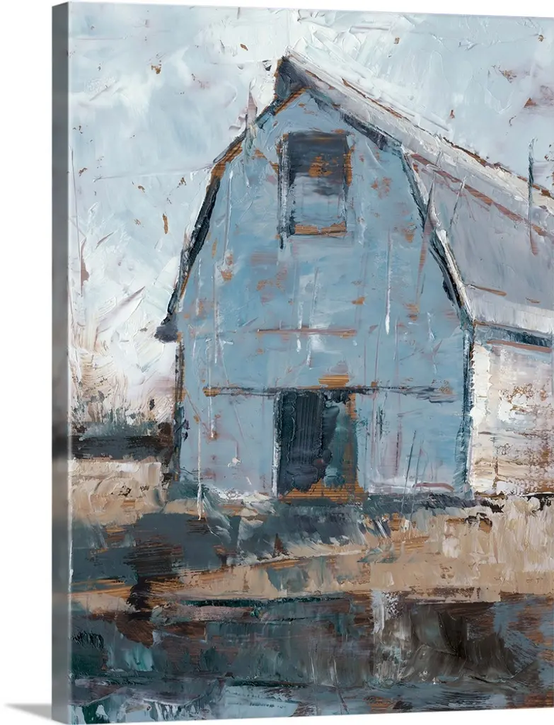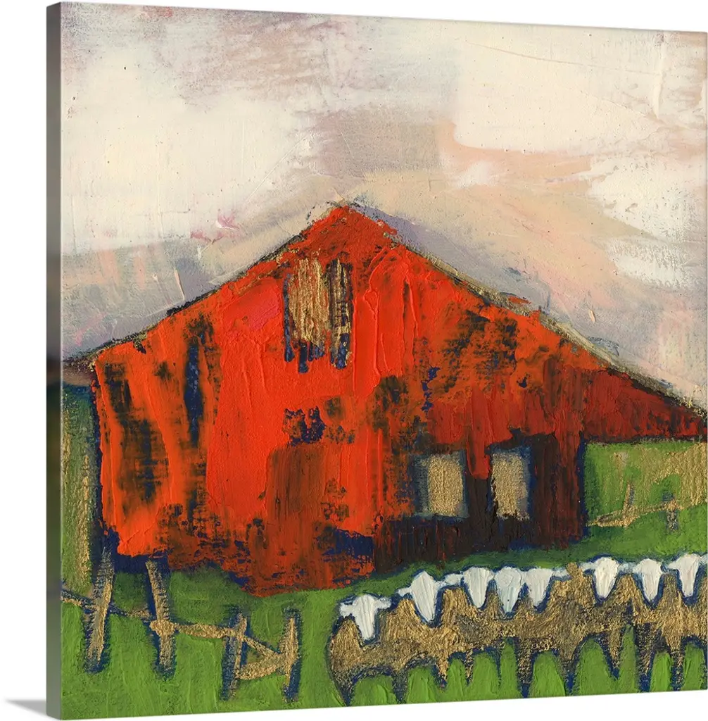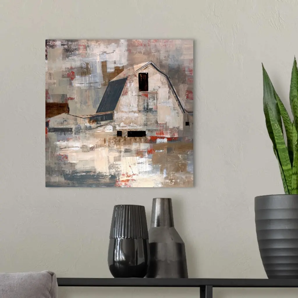 Contemporary artwork of a barn with blocks of colors painted all around it.