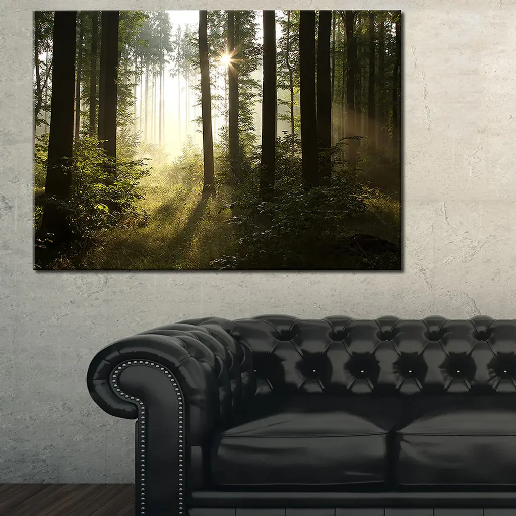 The Early Morning Sun in Misty Forest canvas art print is sure to make an impression on anyone who sees it. This artwork is gallery wrapped around a 1-inch solid wood frame and arrives carefully packaged and entirely ready to hang on the wall. Design Art only uses the highest resolution and pigments to ensure a crisp colorful print that is never faded or pixelated. This artwork is sure to be a conversation starter in any home or office.
