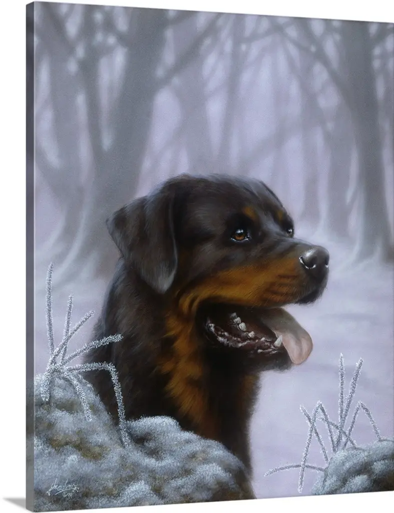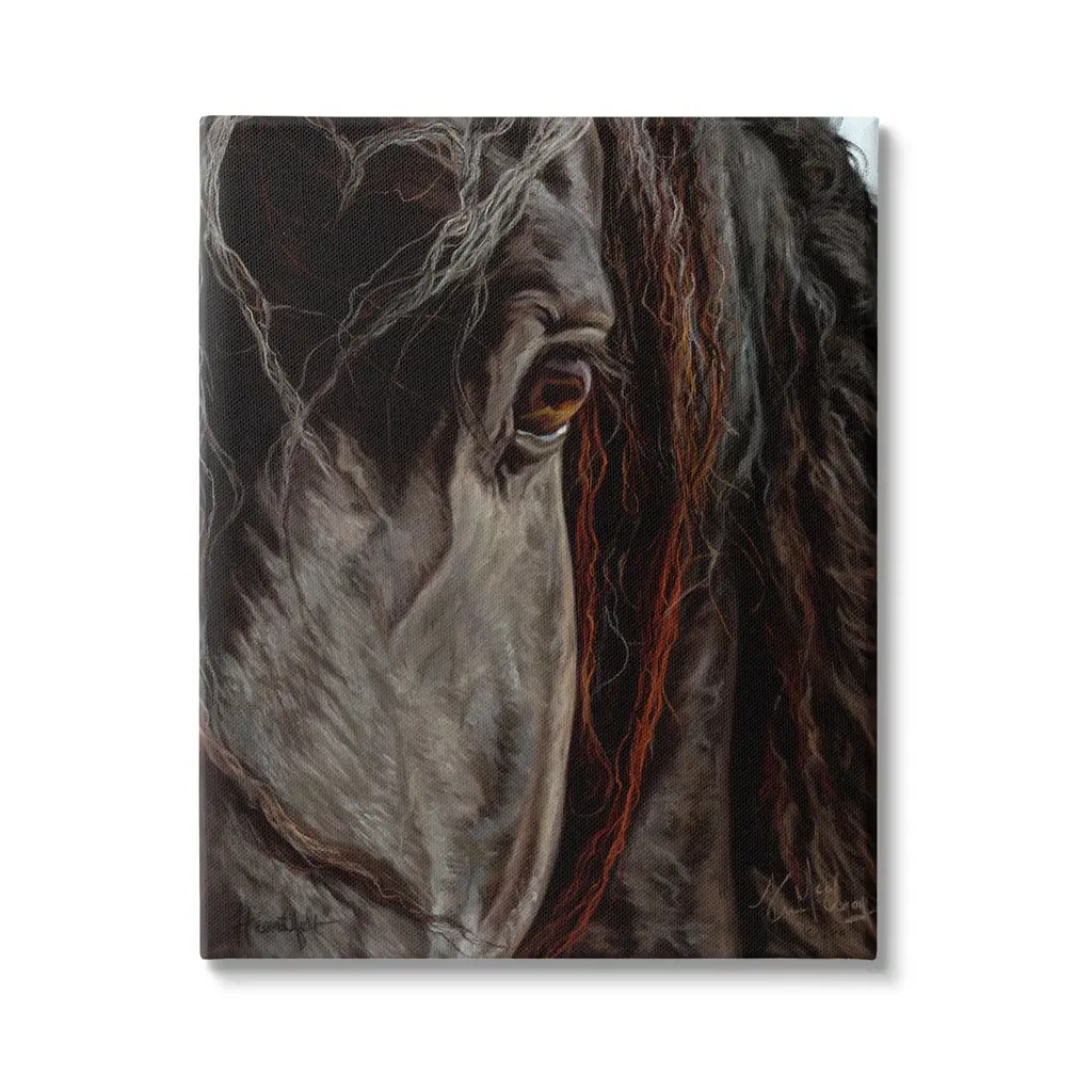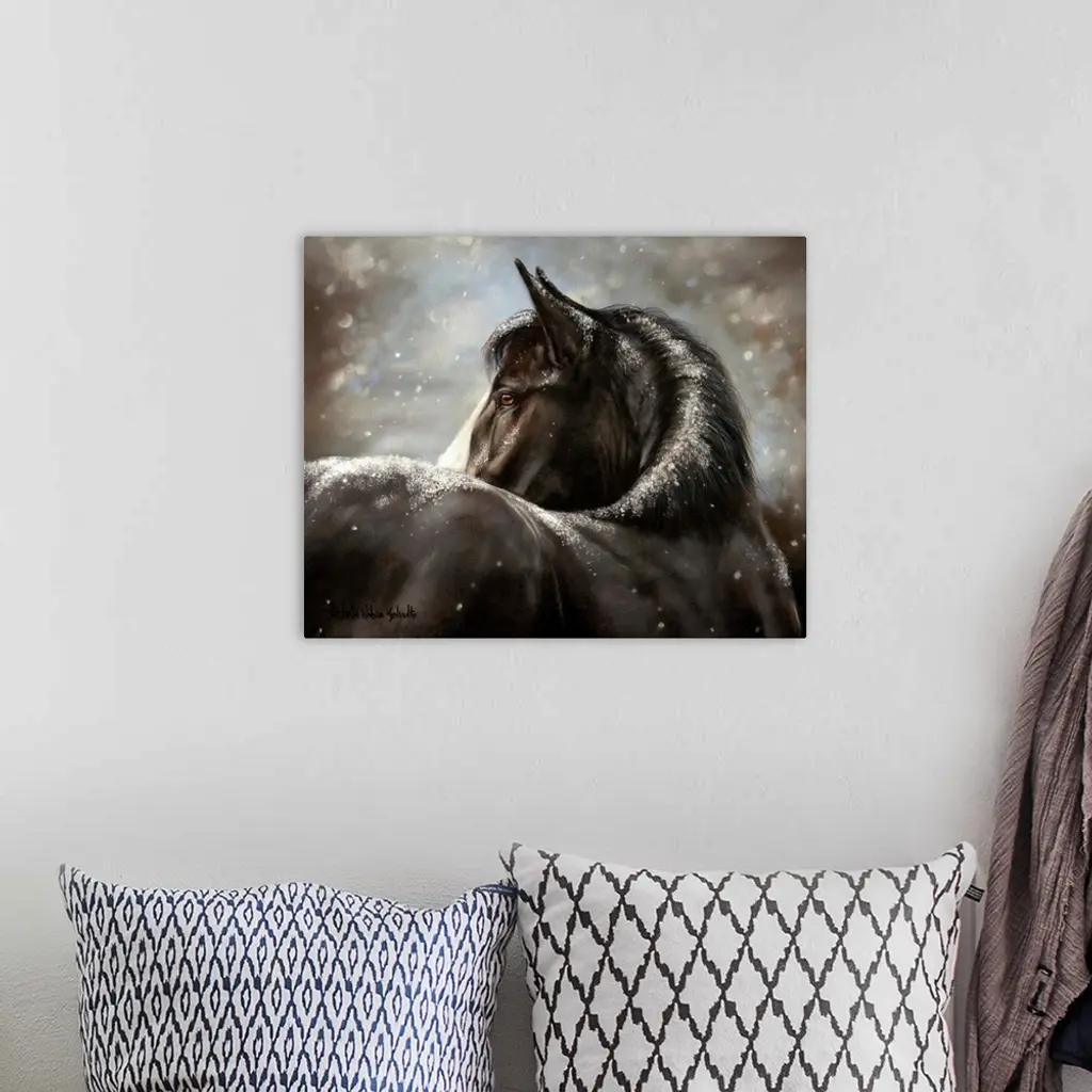 Painting of a dark colored horse with light snow falling on it's mane and back.