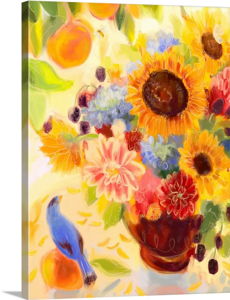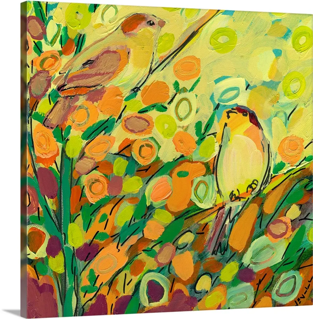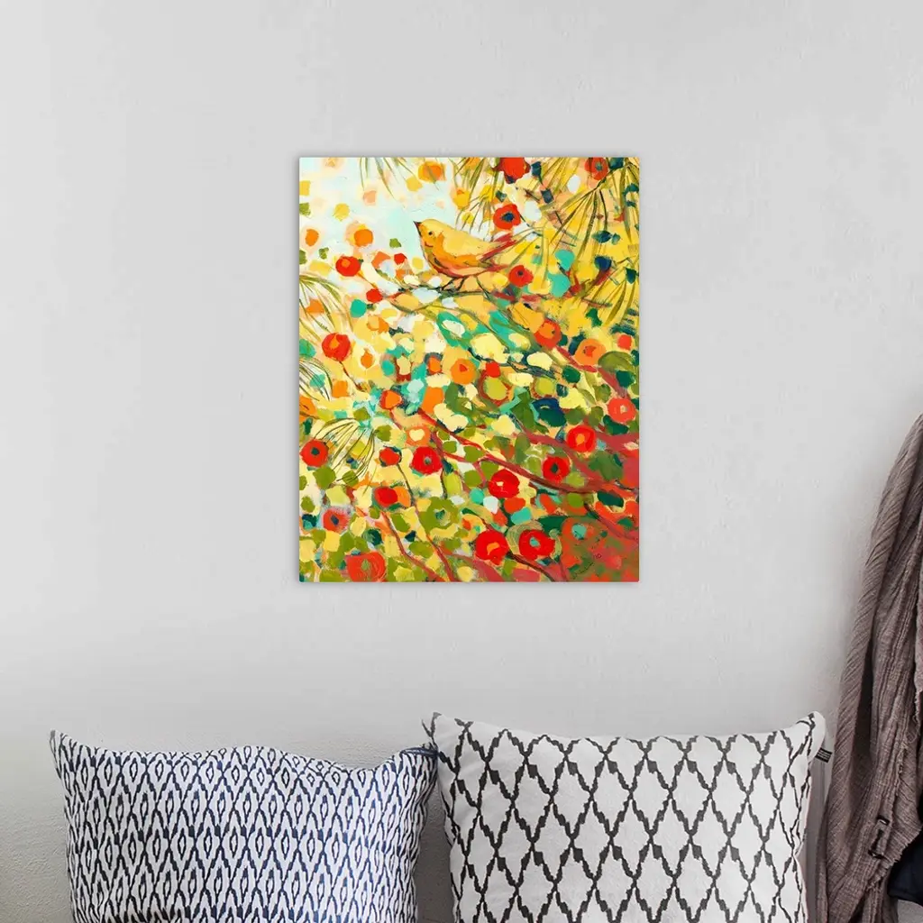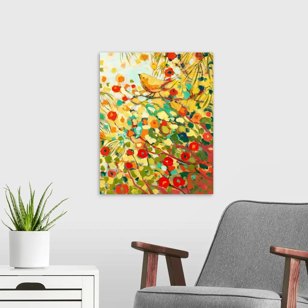This contemporary painting is a colorful blast of abstract and organic dabs of paint create a scene of a bird resting on a tree branch surrounded by blooms and leaves.