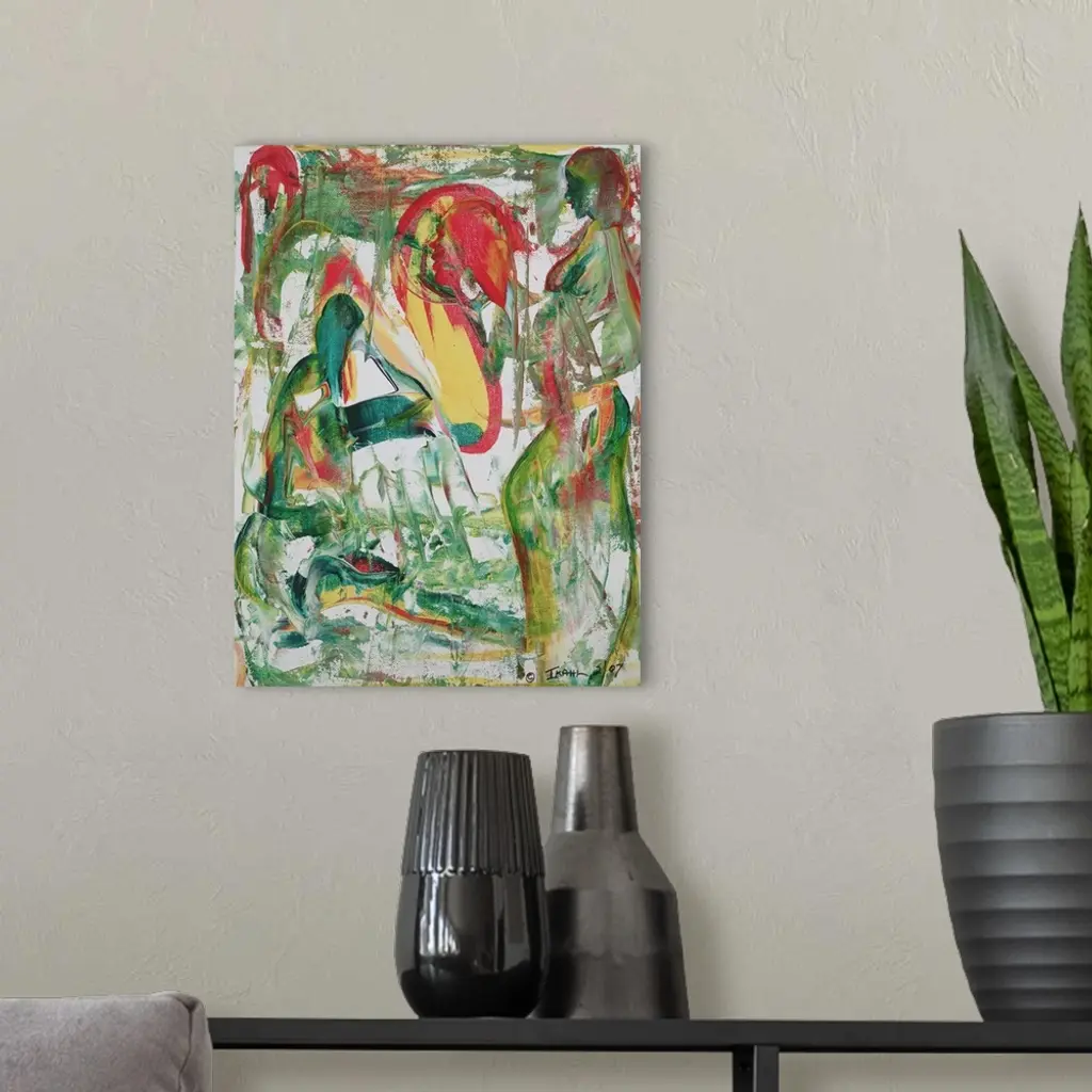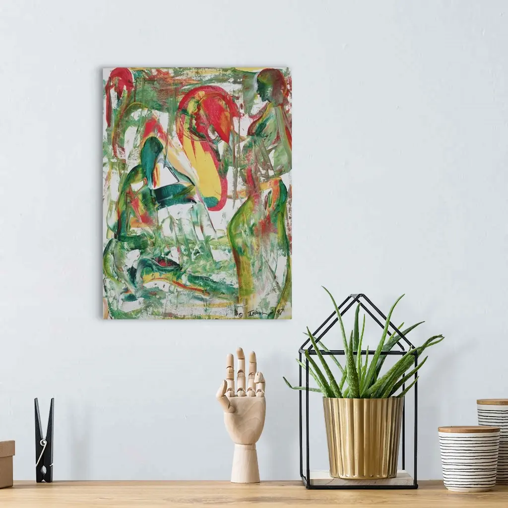 Abstract painting on canvas of two people made up of long loose brush strokes.