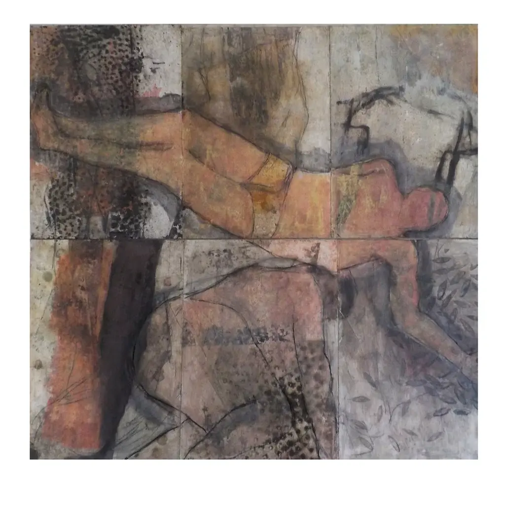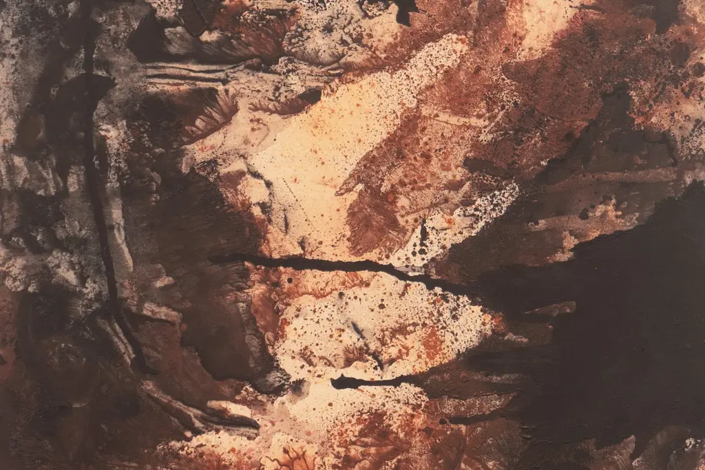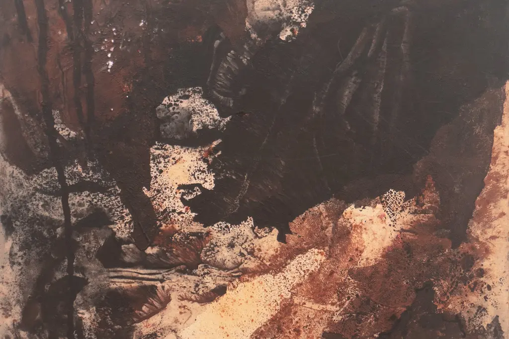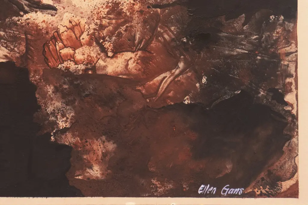 A substantial, mid-century gouache abstract showing organic forms in autumnal shades of onyx, umber and brick red over a parchment ground. A warm piece composed with great textural sensitivity and signed by this notable American artist, psychic and spiritual medium. Signed lower right, 'Ellen Gans' (American, 20th century) and dated 1965. Card dimensions: 26.75 x 16.75 inches.