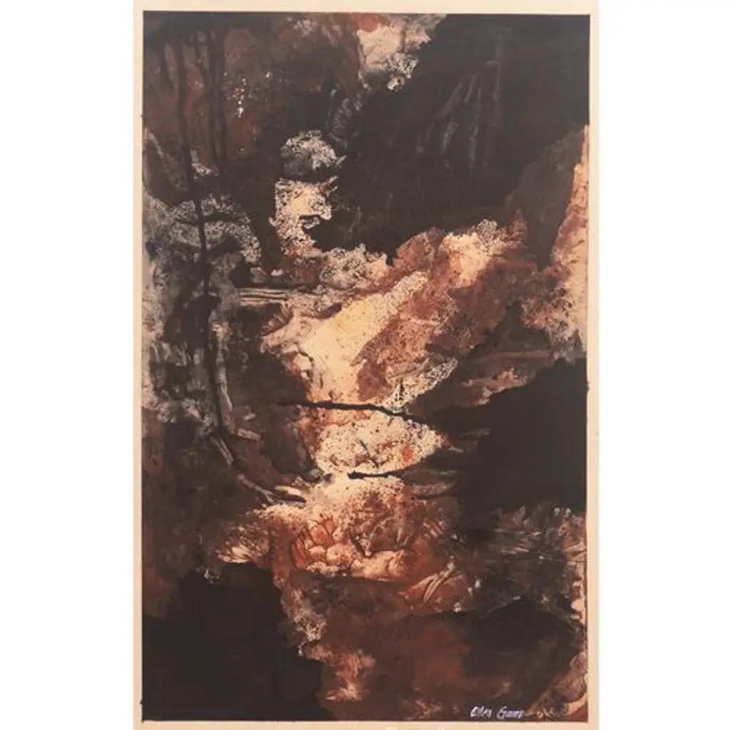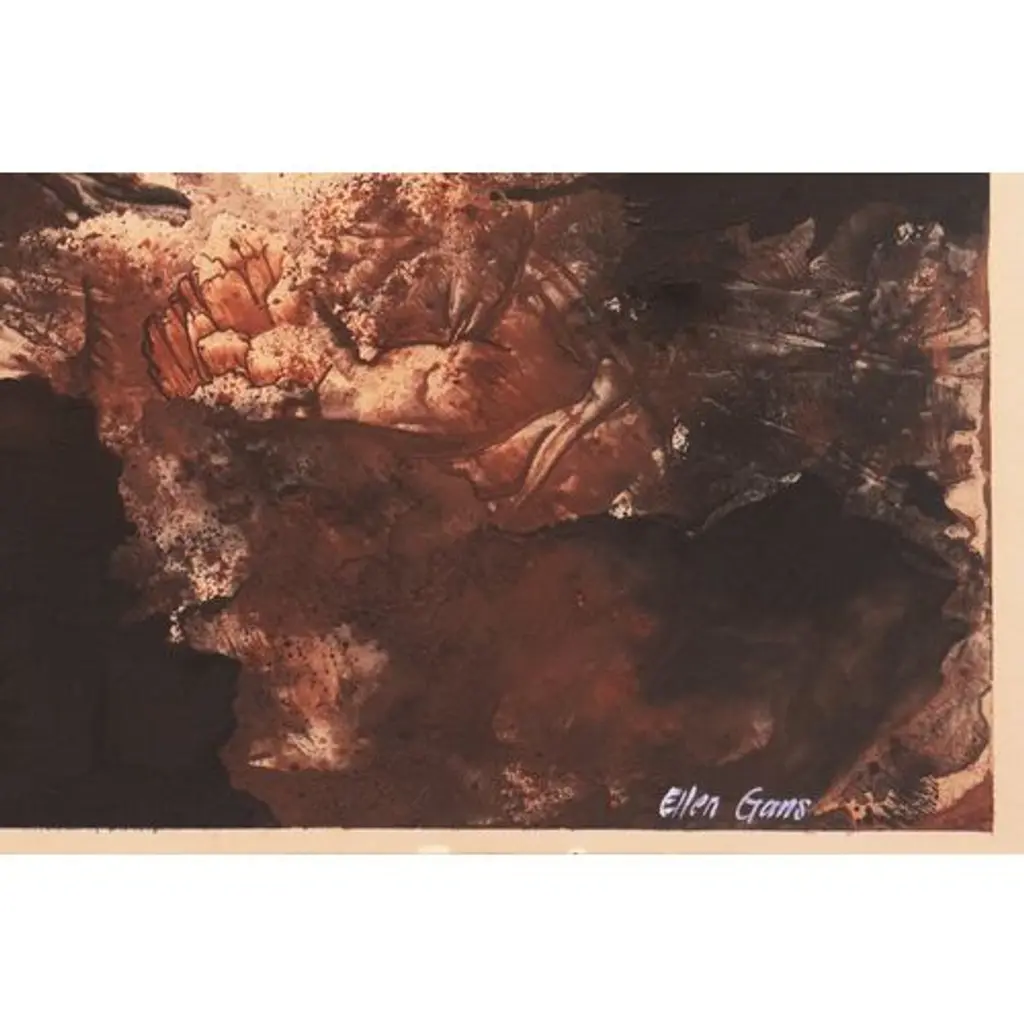 A substantial, mid-century gouache abstract showing organic forms in autumnal shades of onyx, umber and brick red over a parchment ground. A warm piece composed with great textural sensitivity and signed by this notable American artist, psychic and spiritual medium. Signed lower right, 'Ellen Gans' (American, 20th century) and dated 1965. Card dimensions: 26.75 x 16.75 inches.