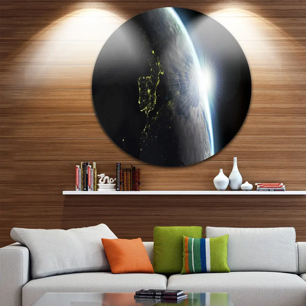 Bring Contemporary Abstraction to your home with this large Circle Metal wall art. This Earth View with Day and Night Effect Metal Artwork makes it the focal point of any room or office. - White Gloss Coating ensures colors are extra vibrant with light reflection.- Aluminum grade Sheet Metal with 1 inch mounting frame on the back giving the illusion that the artwork is floating on the wall..- Mounting Brackets are included along with instructions.- High Quality Digital images are created directly into a glossy aluminum panel producing a stunning and captivating print into the glossy finish of the metal.- Water, Fire and Scratch resistant HD Aluminum panels.- Looks better than any photo paper and guaranteed to last at least 20 years- Easy to clean with a microfiber cloth. Colors are far superior to regular Canvas Art. - Easy to Hang