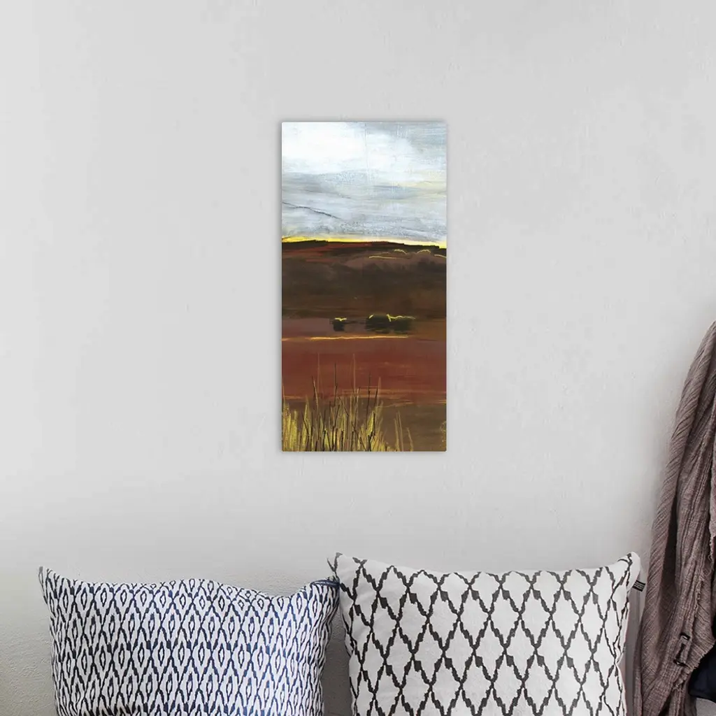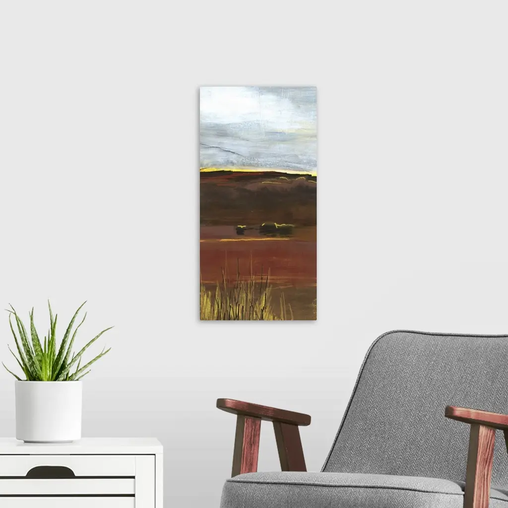 A long vertical painting of an abstract landscape of a prairie field in textured earth tones.