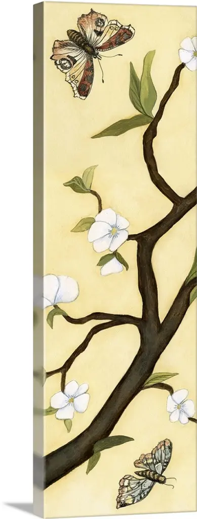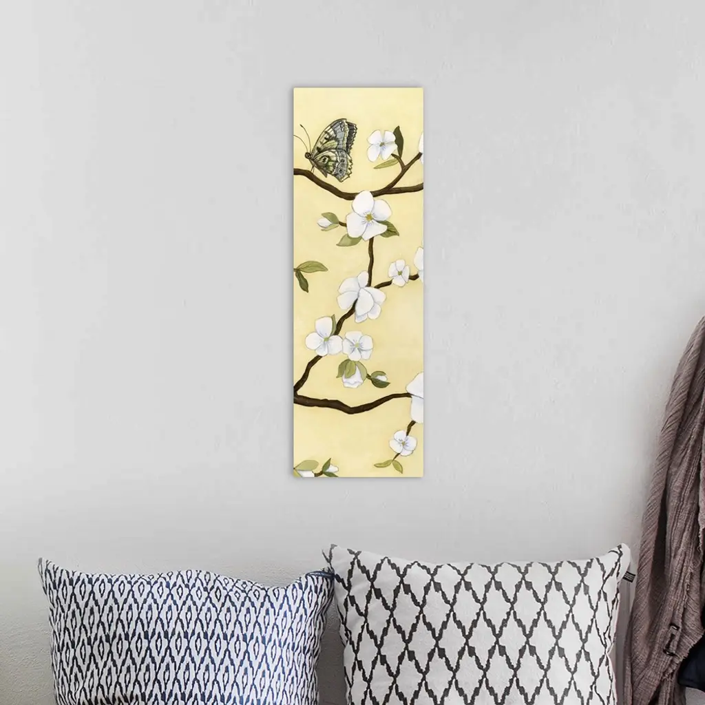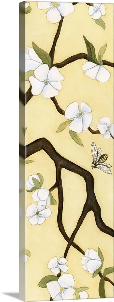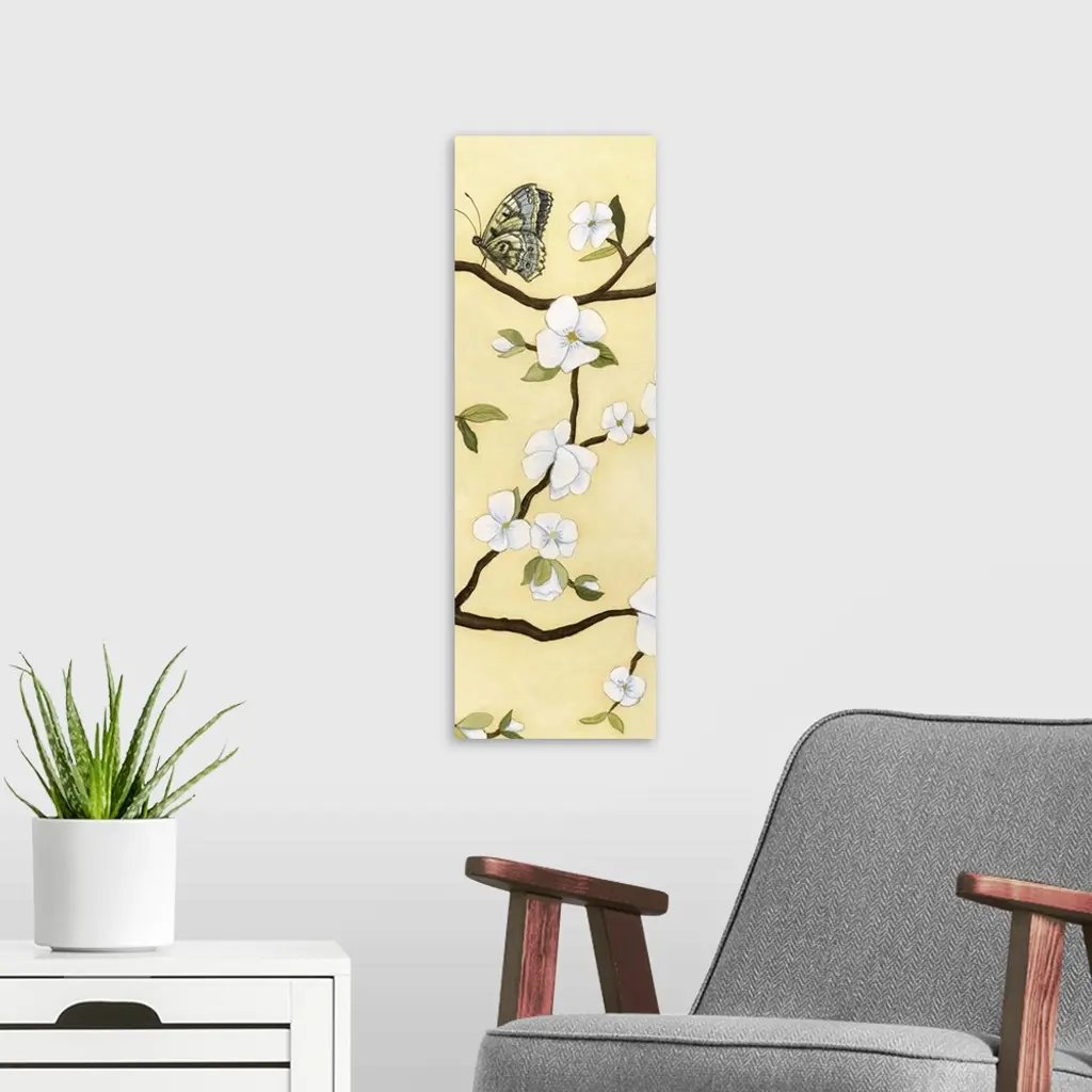 Contemporary decor artwork of white flowers on a dark brown tree branch against a pale yellow background.