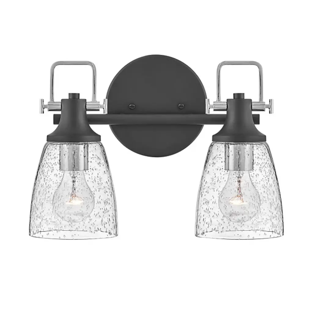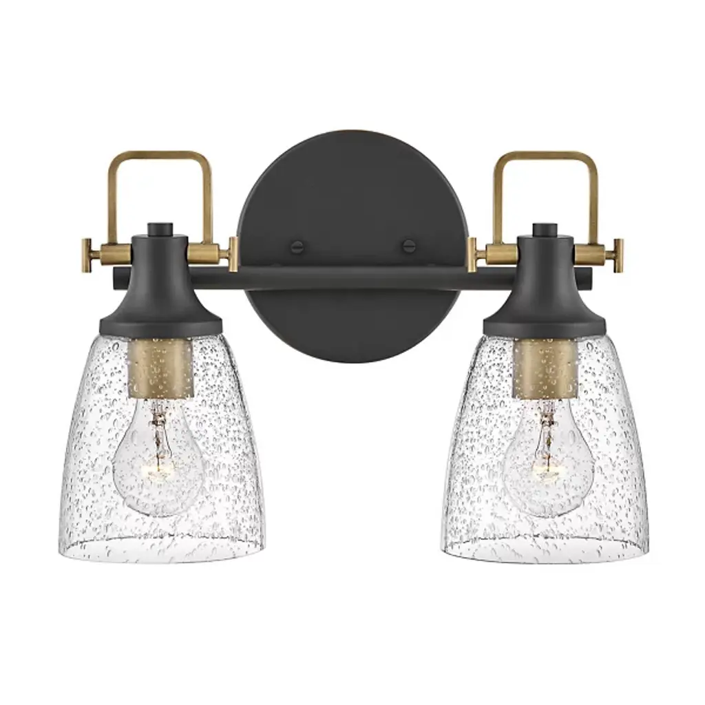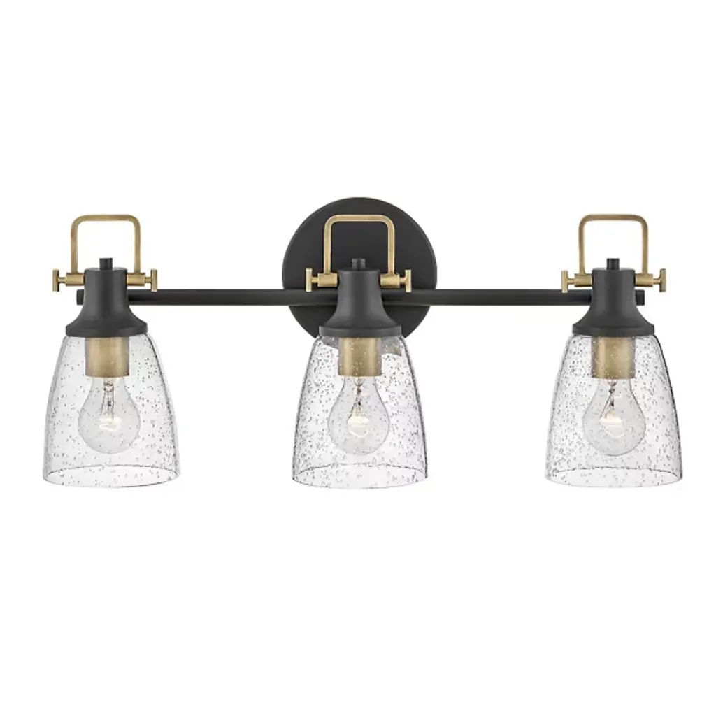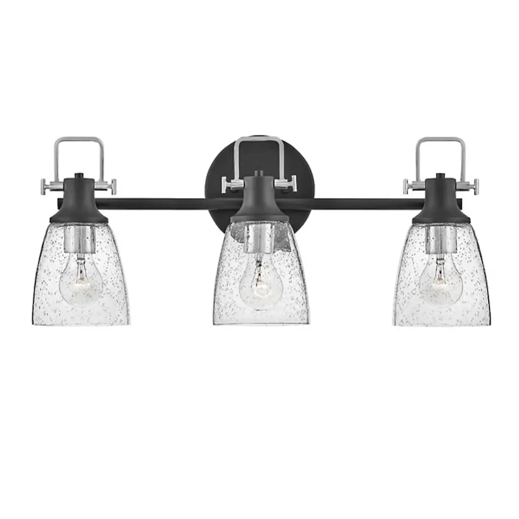 An industrial construction with a hip aesthetic. Complement the blend of styles in your bathroom with the handsome Easton Vanity Light from Hinkley. It’s a real looker mounted atop the bathroom mirror. It gives off a sophisticated look with its two-toned finish. Industrial knobs and yoke accents add complexity to the piece that translates to a bold silhouette. The bath bar’s vintage character comes through clearly with the clear seeded glass shade. It’s easy to get lost in the shade’s myriad of details. A flip of the switch transforms the seeded notes into delicate highlights. Light pours out evenly for a clean, comfortable glow.