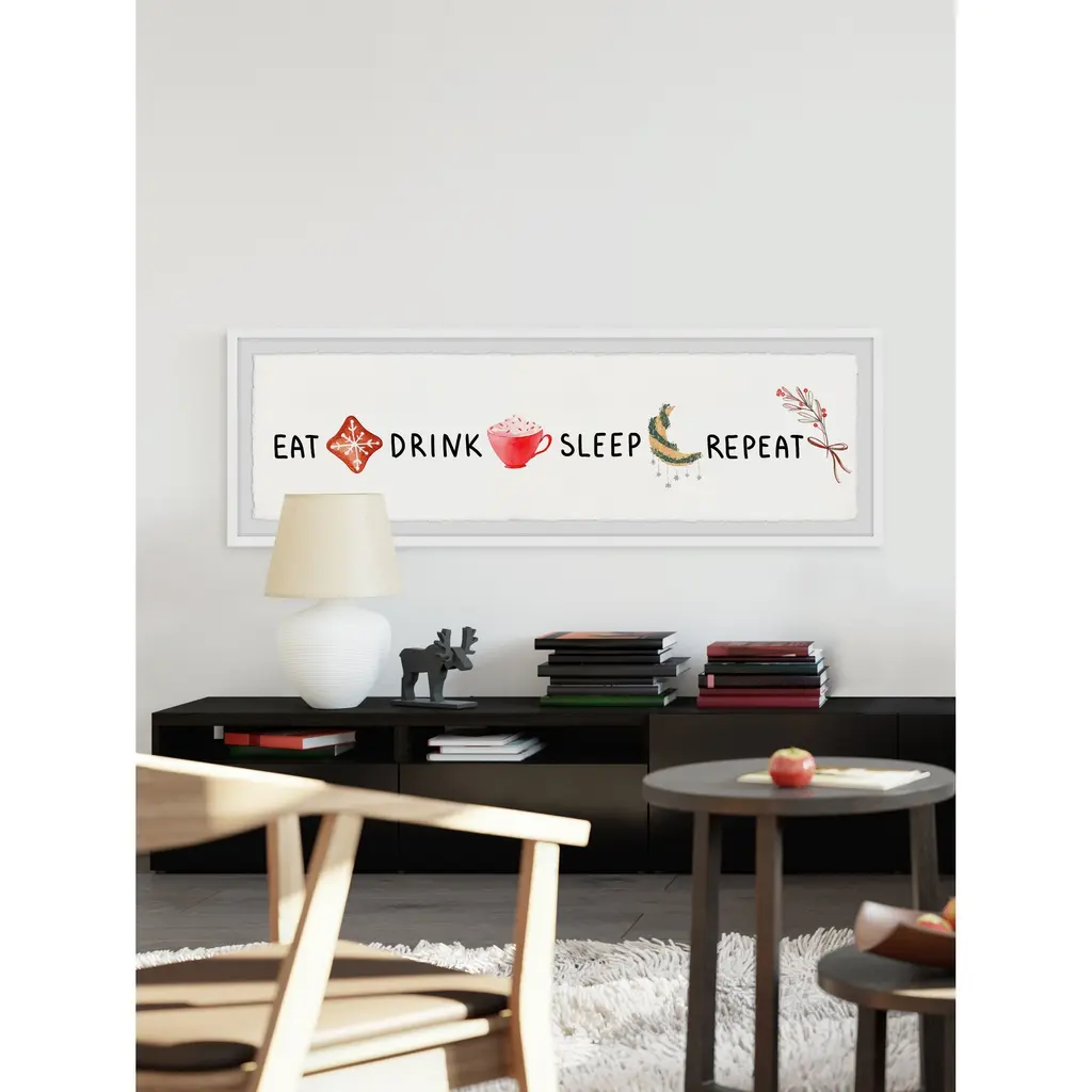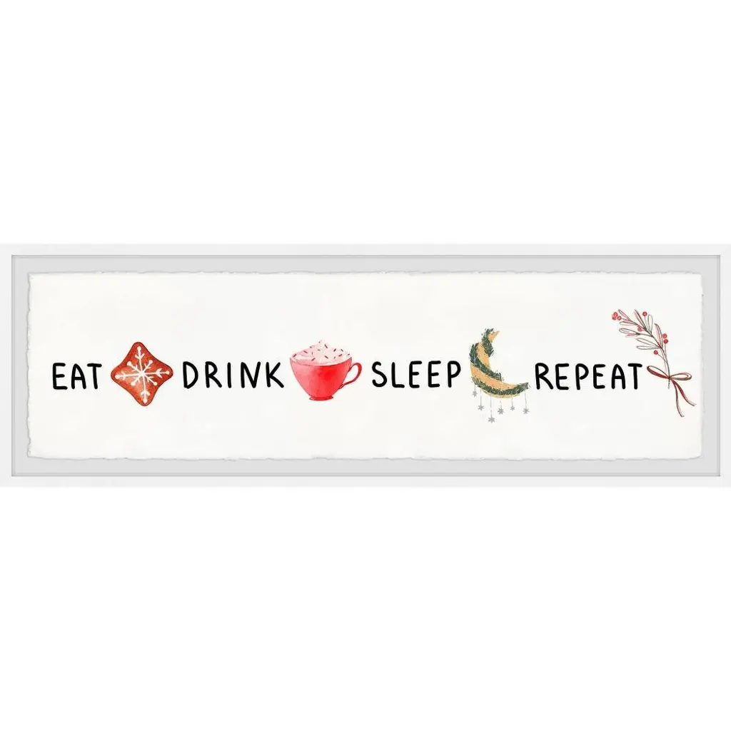 Spend the holidays leisurely and put up this watercolor painting print that says "eat, drink, sleep, repeat" with a holiday symbol in between each word. Proudly printed in the USA, this piece is printed on high quality archive paper and professionally hand-framed. With wall-mounting hooks included, this artful accent is ready to hang up as soon as it reaches your front door. • Top quality Giclee print on high resolution Archive Paper • Hand cut deckled edges • High quality durable non-warping frame • Finished under shatter resistant plexiglass • Arrives ready to hang • Includes a certificate of authenticity • Printed in the USA