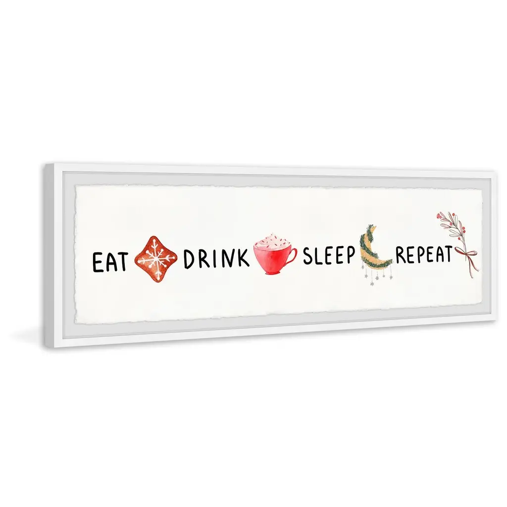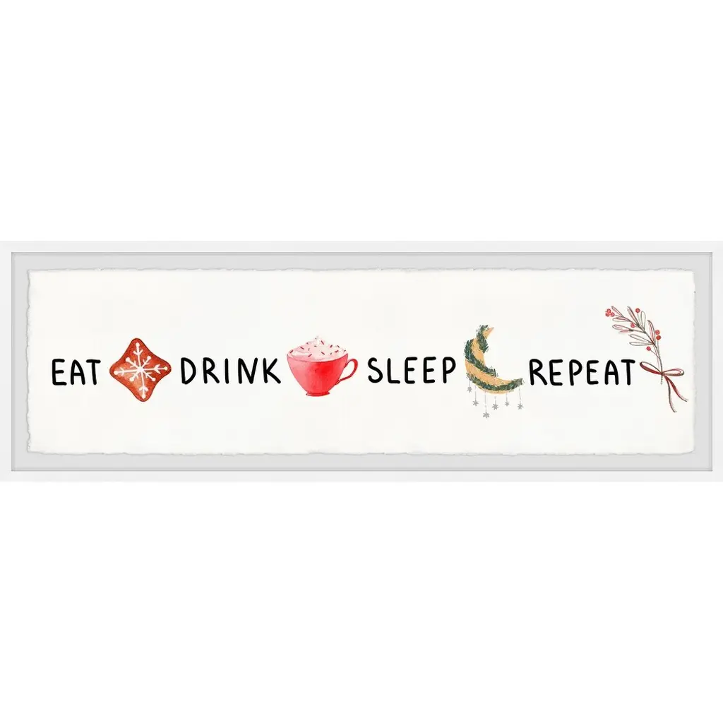 Spend the holidays leisurely and put up this watercolor painting print that says "eat, drink, sleep, repeat" with a holiday symbol in between each word. Proudly printed in the USA, this piece is printed on high quality archive paper and professionally hand-framed. With wall-mounting hooks included, this artful accent is ready to hang up as soon as it reaches your front door. • Top quality Giclee print on high resolution Archive Paper • Hand cut deckled edges • High quality durable non-warping frame • Finished under shatter resistant plexiglass • Arrives ready to hang • Includes a certificate of authenticity • Printed in the USA