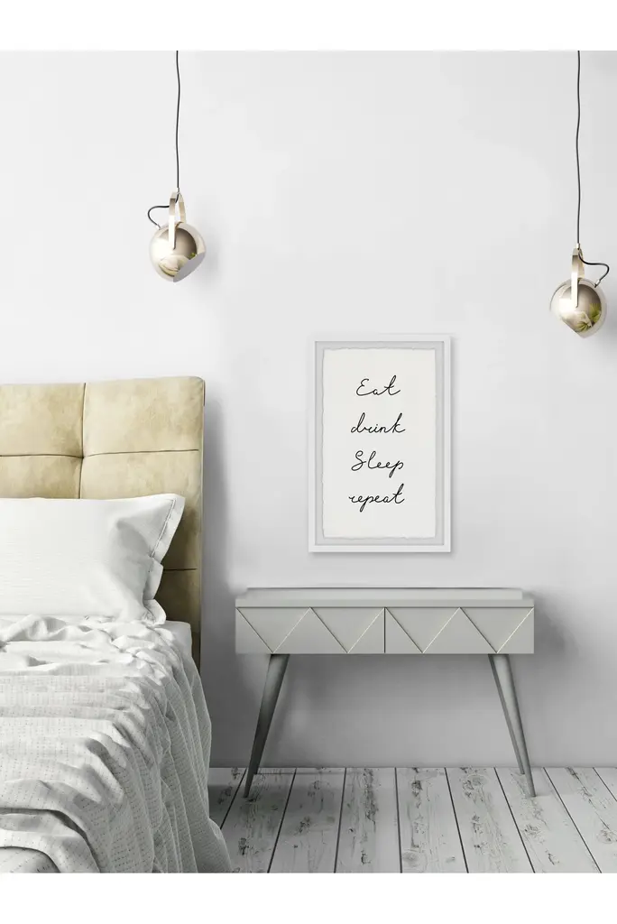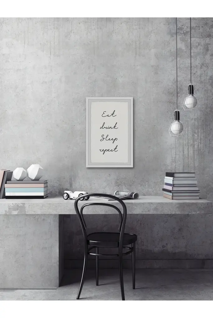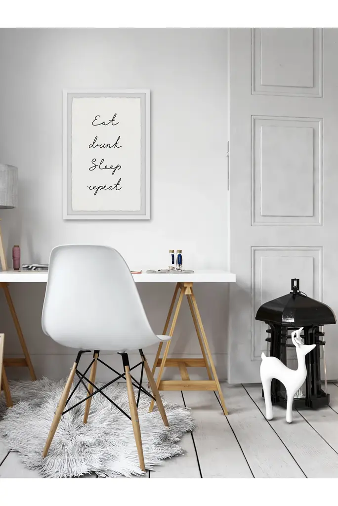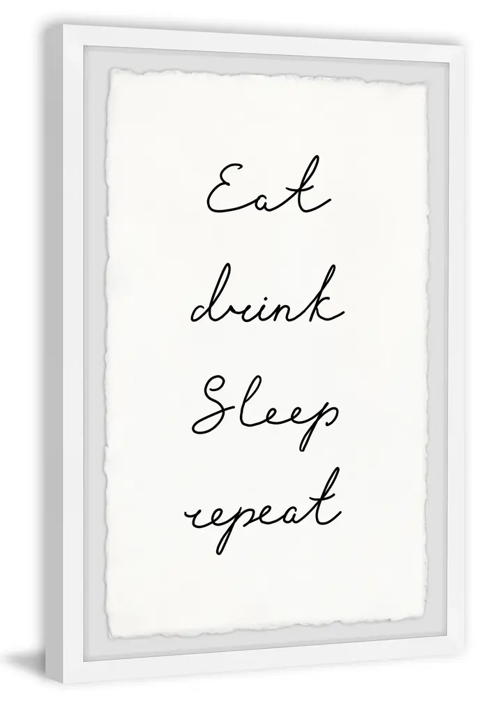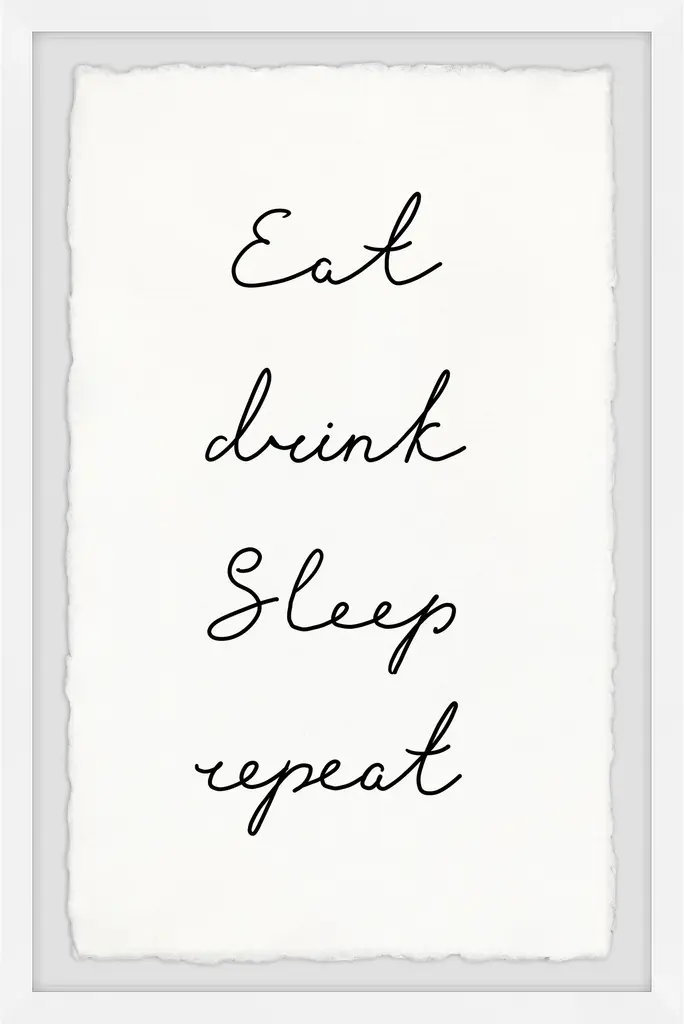 This textual art print will complement any interior style. Featuring tasteful but simple cursive black text that says "Eat, drink, sleep, repeat". Proudly printed in the USA, this piece is printed on high quality archive paper and professionally hand-framed. With wall-mounting hooks included, this artful accent is ready to hang up as soon as it reaches your front door.Top quality Giclee print on high resolution Archive PaperHand cut deckled edgesHigh quality durable non-warping frameFinished under shatter resistant plexiglassArrives ready to hangIncludes a certificate of authenticityPrinted in the USA