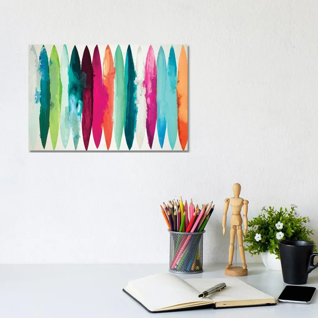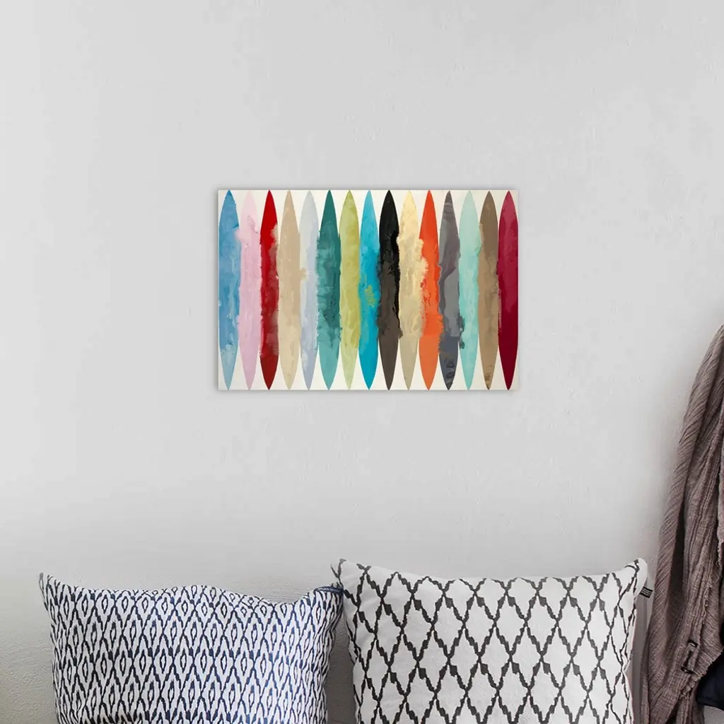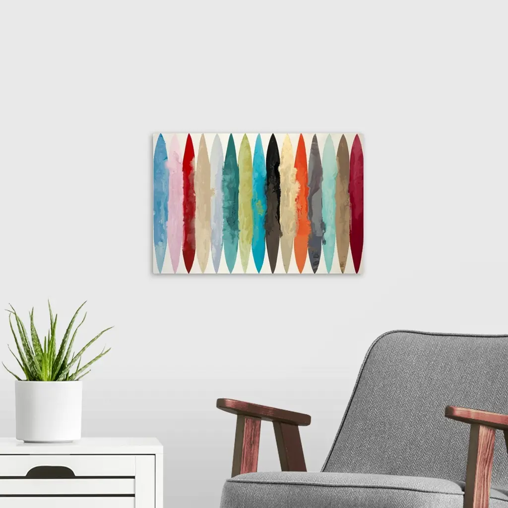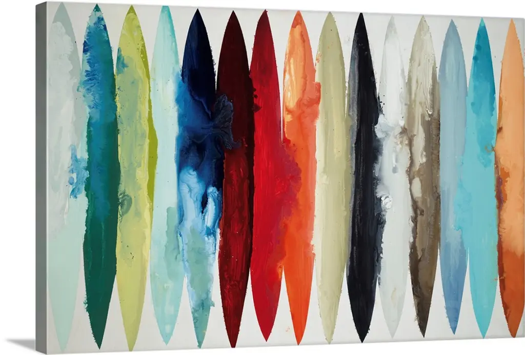 Large abstract painting with different colored oblong shapes lined up together going across the center with their colors bleeding in to each other.