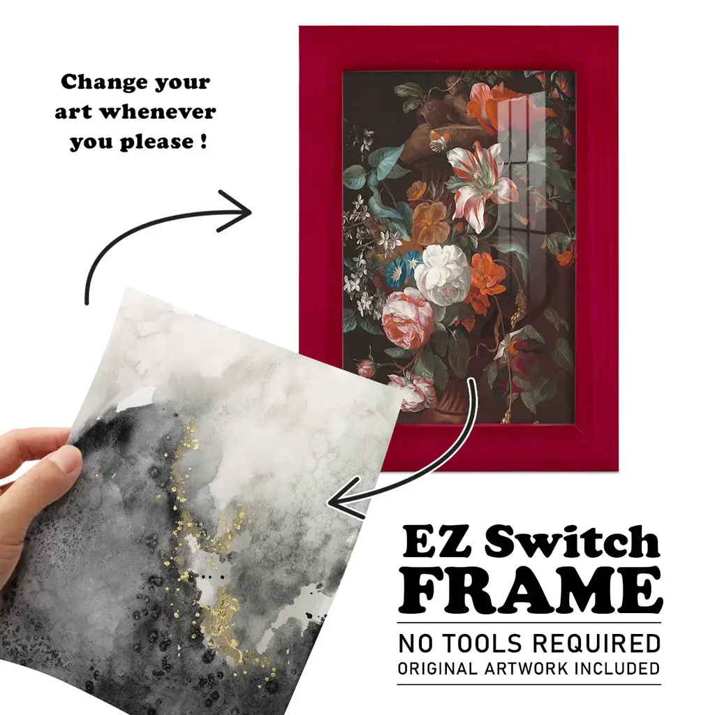 Ebony & Gold I -EZ SWITCH Framed Print w/glass-Cherry Red A delightful, framed print. Featuring a solid wood frame with real wood glass. This premium print is giclee quality. In addition, every frame features a removable back and table top stand. This allows you to change your art in the future or to just stand the art on a table for a new look. We are sure you'll enjoy our new series of EZ SWITCH Framed Art. Solid Wood Frame Real Glass Removable / Replaceable Art Built in Tabletop Stand Sizes range from 4x6 up to 12x15 - buy just one or pair them up as sets as you see fit.