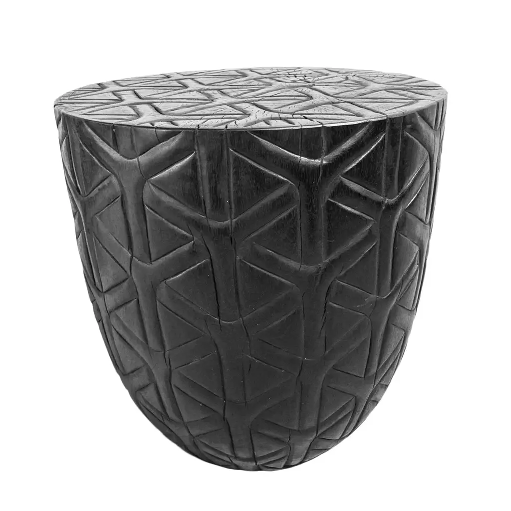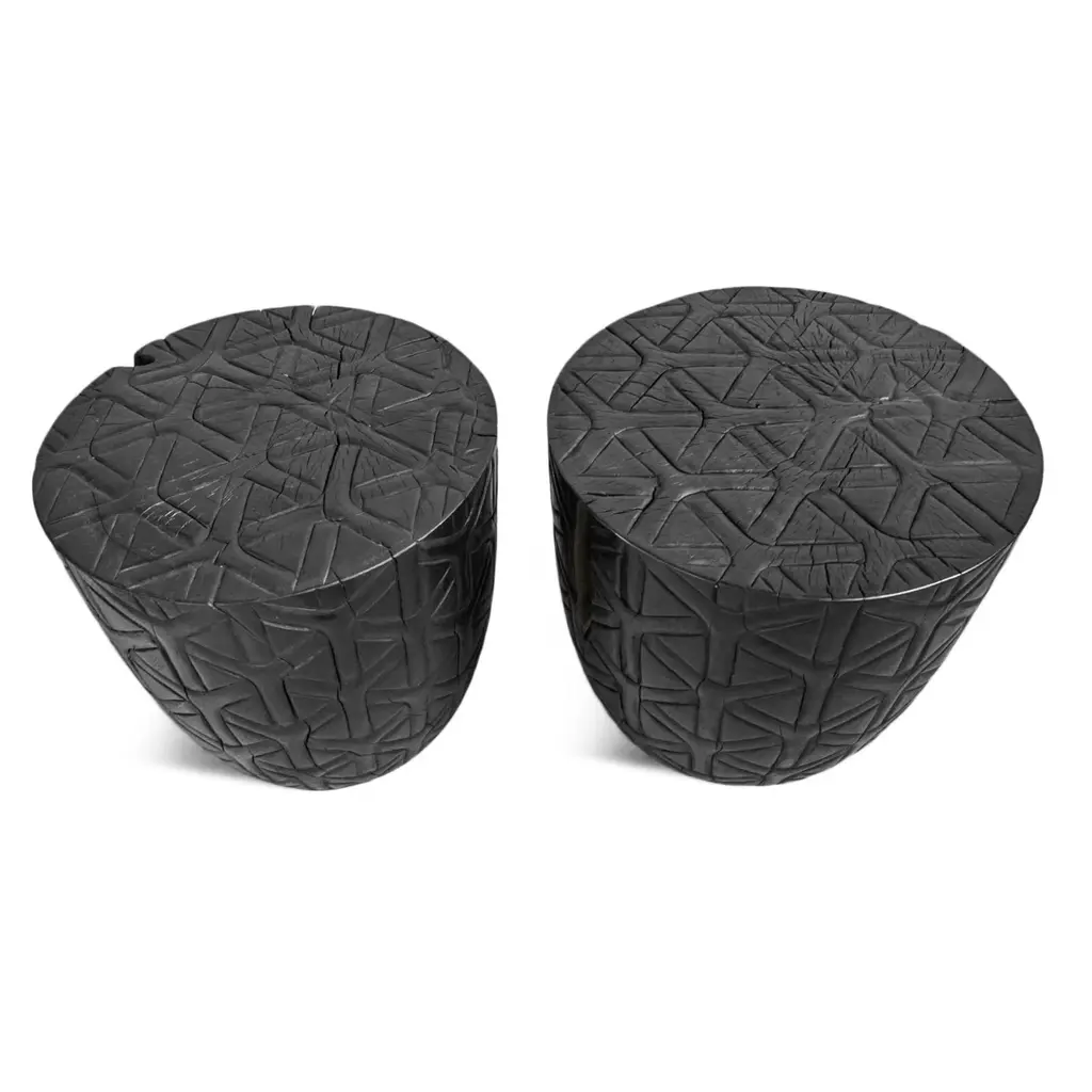 Solid acacia wood stump stool / side table with rich ebony stain and hand carved cane pattern surface. Wonderful unique handmade piece. Each will vary in natural grain / imperfections and handmade differences. Each is sold individually.