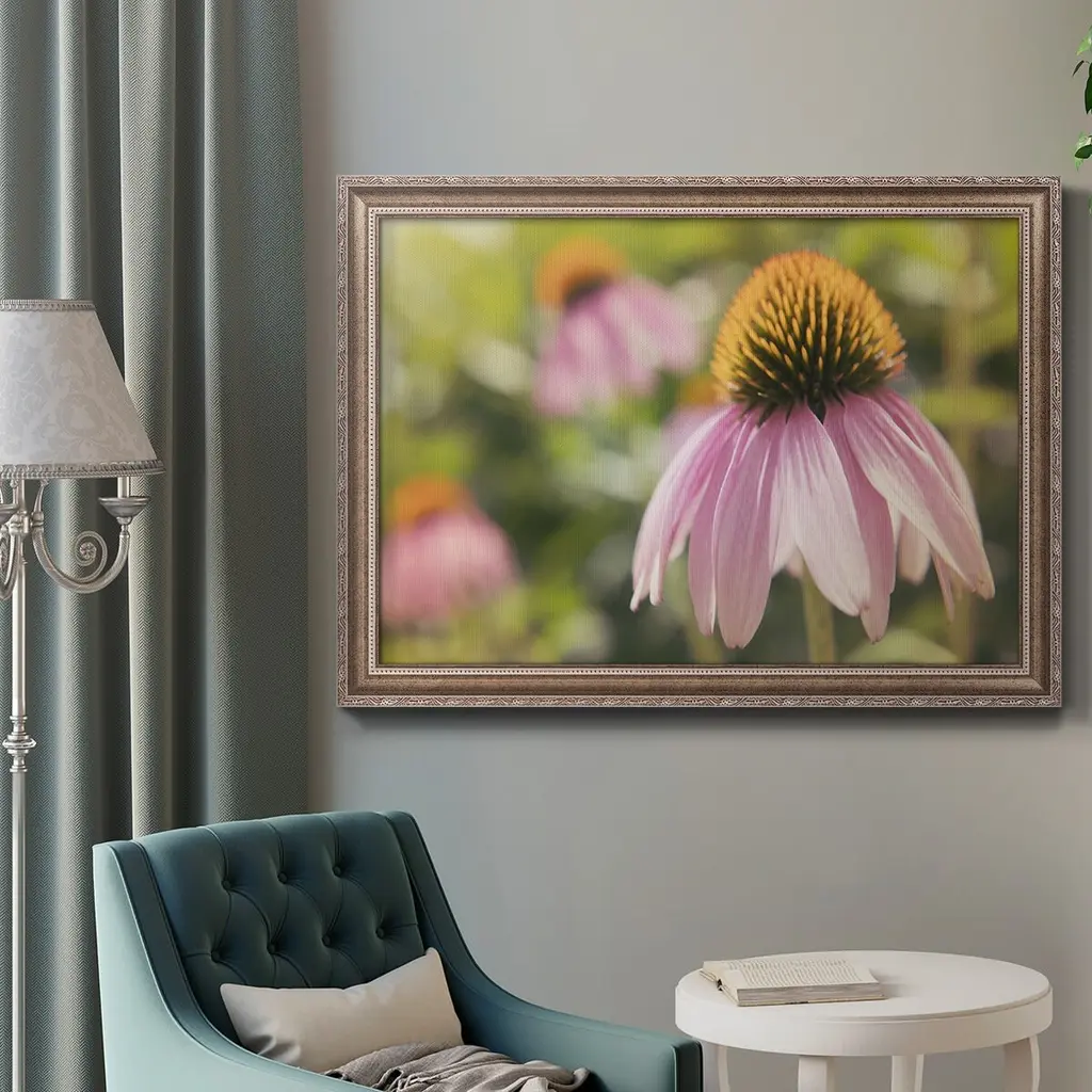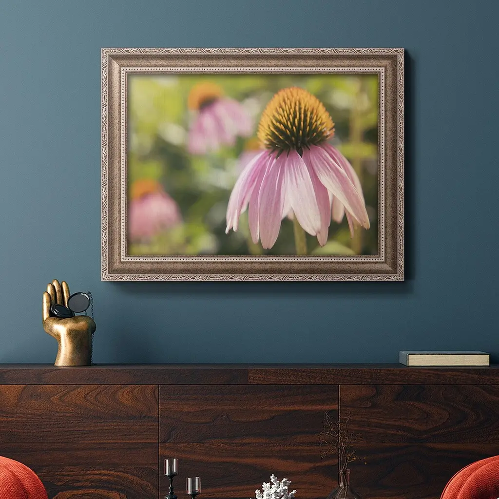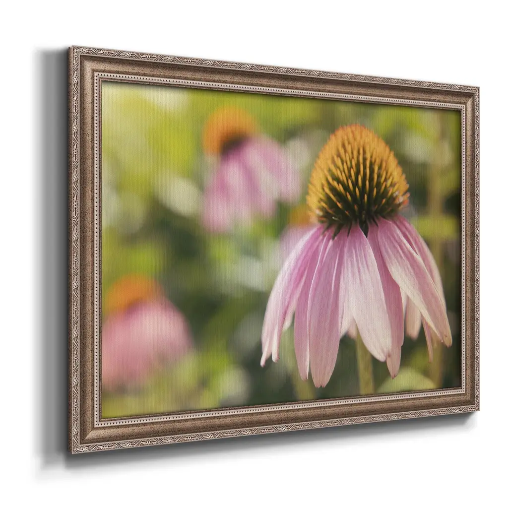 Echinacea Study I Premium Framed Canvas- Ready to Hang A Premium Framed Canvas created to last. Framed in distressed wood and available in an array of sizes and colors Featuring a beveled a solid wood stretcher bar, each piece comes ready to hand 3 SIZES AVAILABLE 16''X20'' - Overall Size 18'X27'' - Overall Size 24''x36'' - Overall Size Each piece is made to order. Each piece comes with hanging hardware. Made in the USA Ready to Hang Giclee Paper Print Acrylic Glass Beveled Matt Board