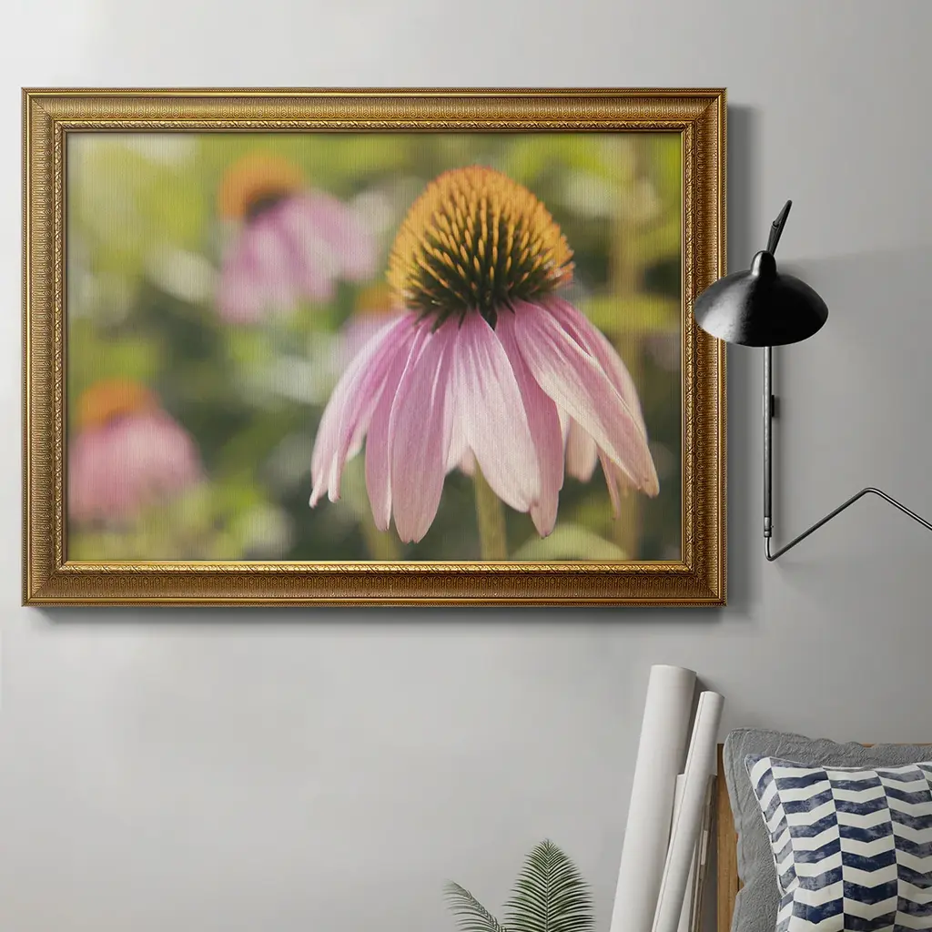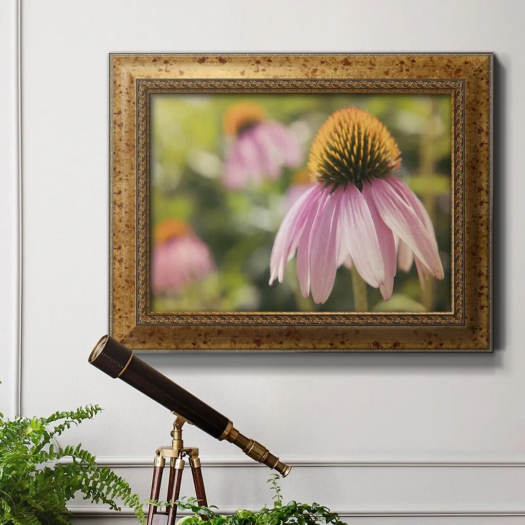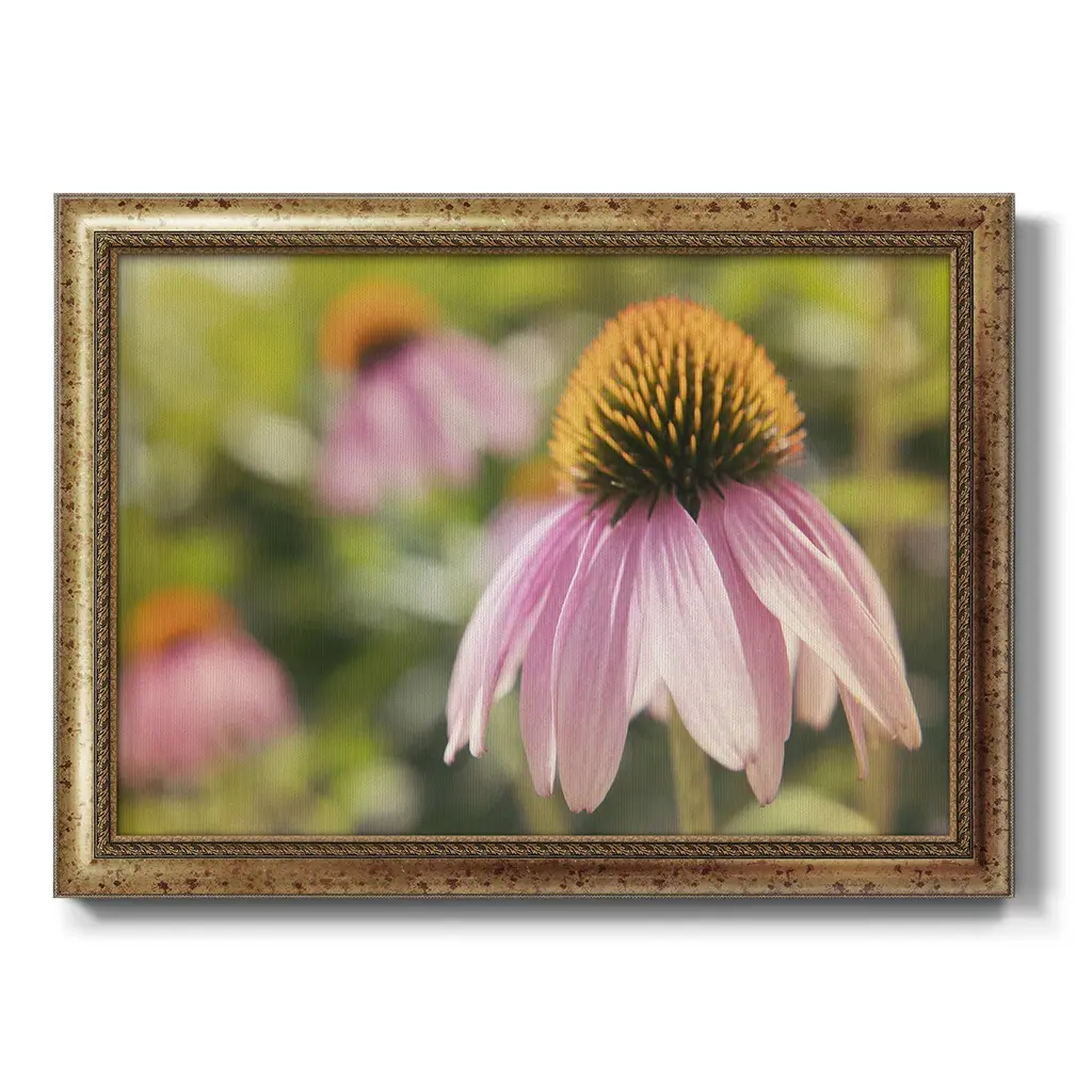 Echinacea Study I Premium Framed Canvas- Ready to Hang A Premium Framed Canvas created to last. Framed in distressed wood and available in an array of sizes and colors Featuring a beveled a solid wood stretcher bar, each piece comes ready to hand 3 SIZES AVAILABLE 16''X20'' - Overall Size 18'X27'' - Overall Size 24''x36'' - Overall Size Each piece is made to order. Each piece comes with hanging hardware. Made in the USA Ready to Hang Giclee Paper Print Acrylic Glass Beveled Matt Board