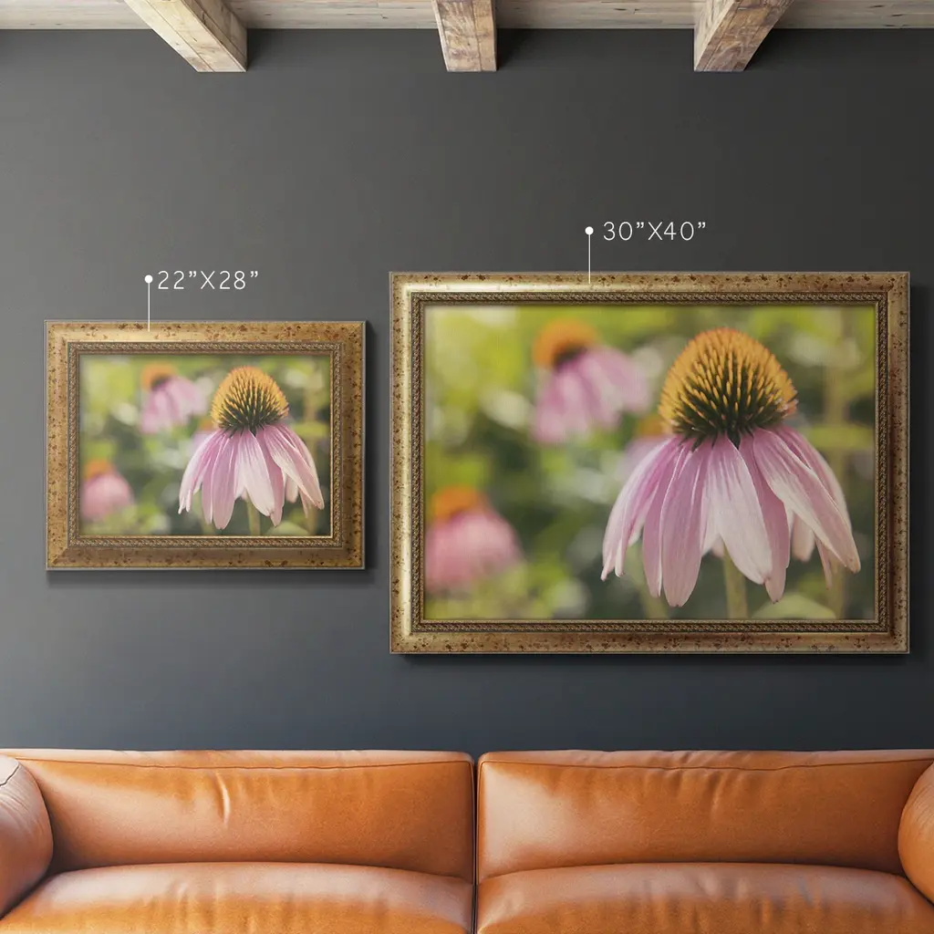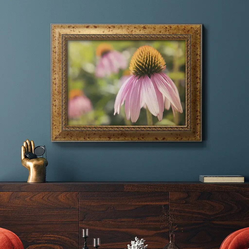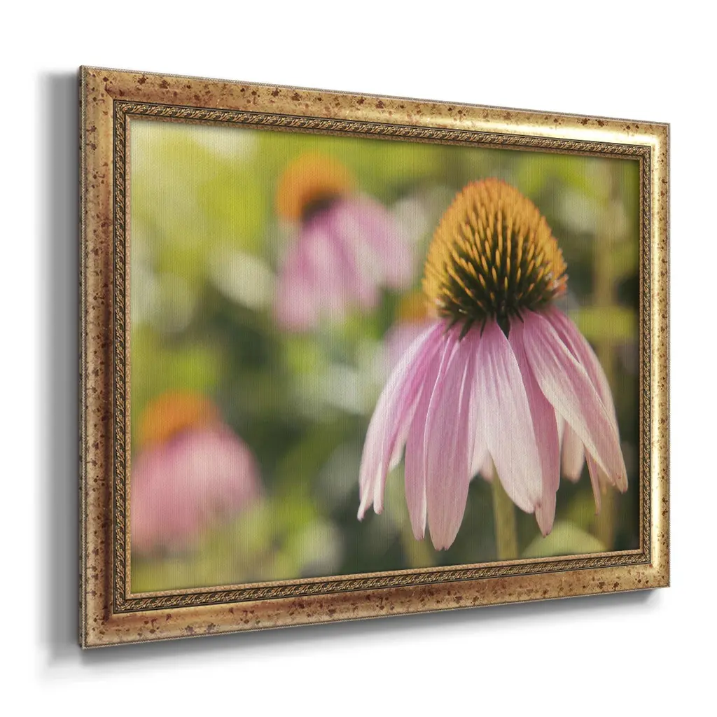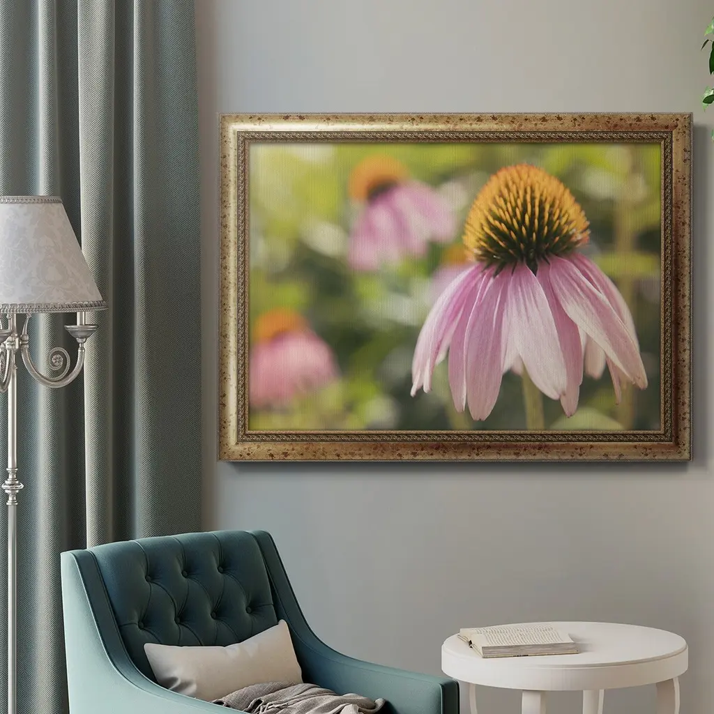 Echinacea Study I Premium Framed Canvas- Ready to Hang A Premium Framed Canvas created to last. Framed in distressed wood and available in an array of sizes and colors Featuring a beveled a solid wood stretcher bar, each piece comes ready to hand 3 SIZES AVAILABLE 16''X20'' - Overall Size 18'X27'' - Overall Size 24''x36'' - Overall Size Each piece is made to order. Each piece comes with hanging hardware. Made in the USA Ready to Hang Giclee Paper Print Acrylic Glass Beveled Matt Board