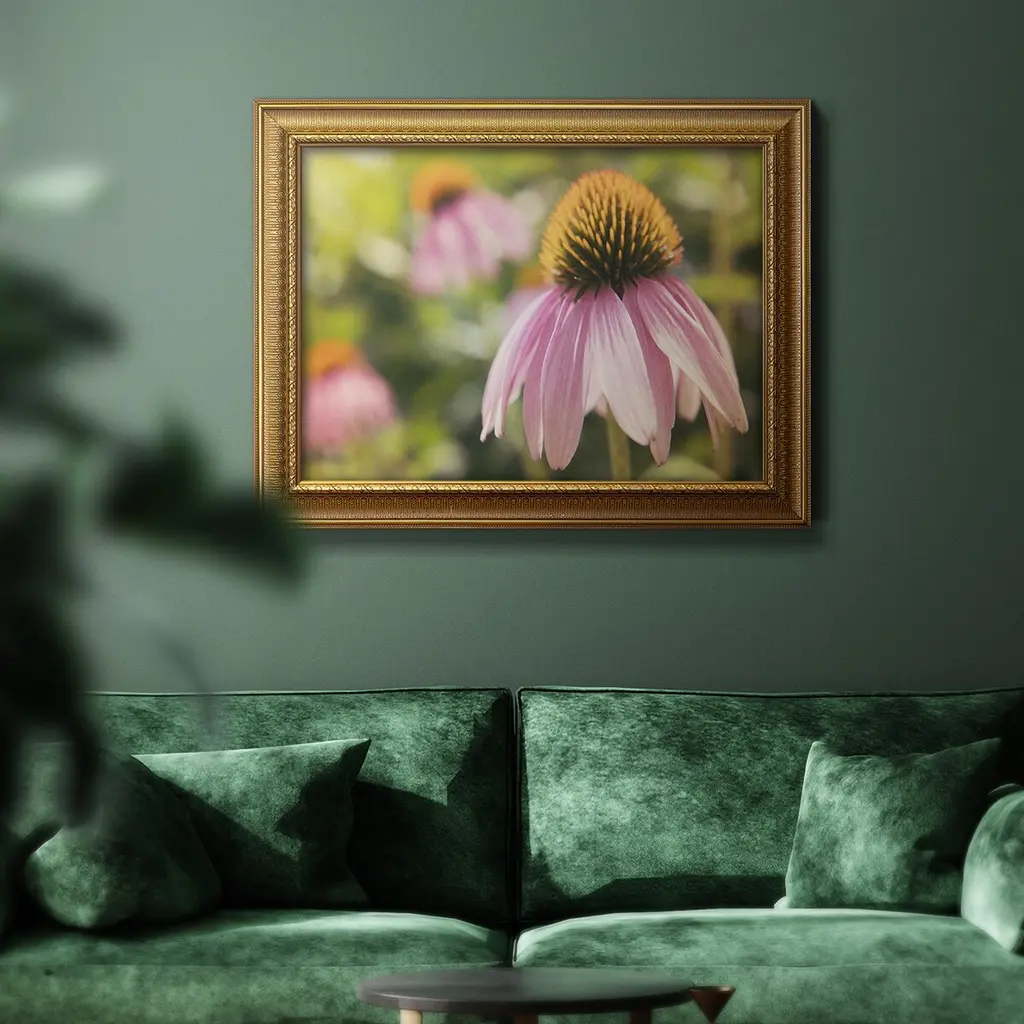 Echinacea Study I Premium Framed Canvas- Ready to Hang A Premium Framed Canvas created to last. Framed in distressed wood and available in an array of sizes and colors Featuring a beveled a solid wood stretcher bar, each piece comes ready to hand 3 SIZES AVAILABLE 16''X20'' - Overall Size 18'X27'' - Overall Size 24''x36'' - Overall Size Each piece is made to order. Each piece comes with hanging hardware. Made in the USA Ready to Hang Giclee Paper Print Acrylic Glass Beveled Matt Board
