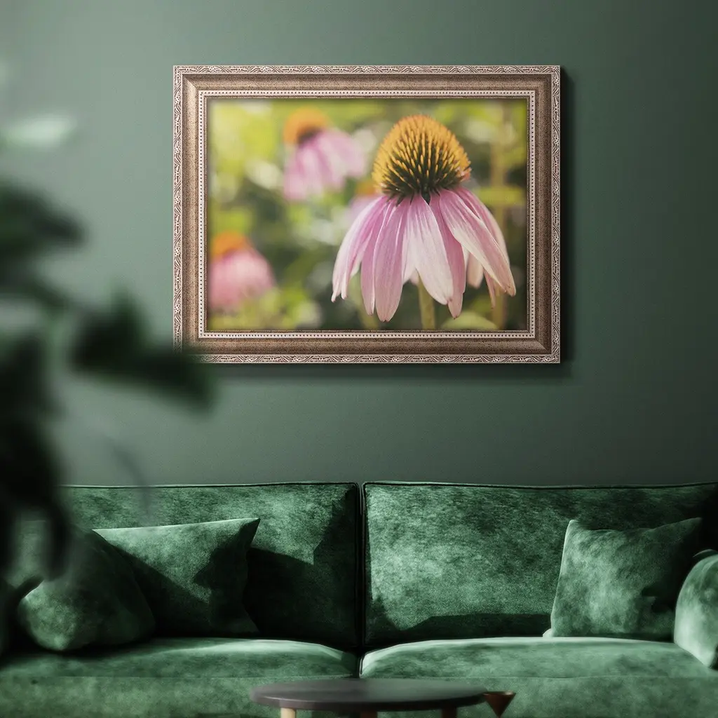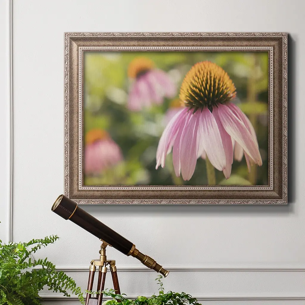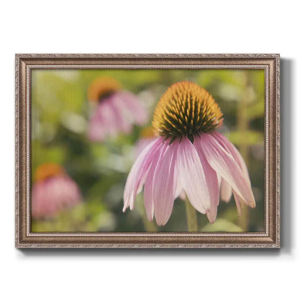 Echinacea Study I Premium Framed Canvas- Ready to Hang A Premium Framed Canvas created to last. Framed in distressed wood and available in an array of sizes and colors Featuring a beveled a solid wood stretcher bar, each piece comes ready to hand 3 SIZES AVAILABLE 16''X20'' - Overall Size 18'X27'' - Overall Size 24''x36'' - Overall Size Each piece is made to order. Each piece comes with hanging hardware. Made in the USA Ready to Hang Giclee Paper Print Acrylic Glass Beveled Matt Board
