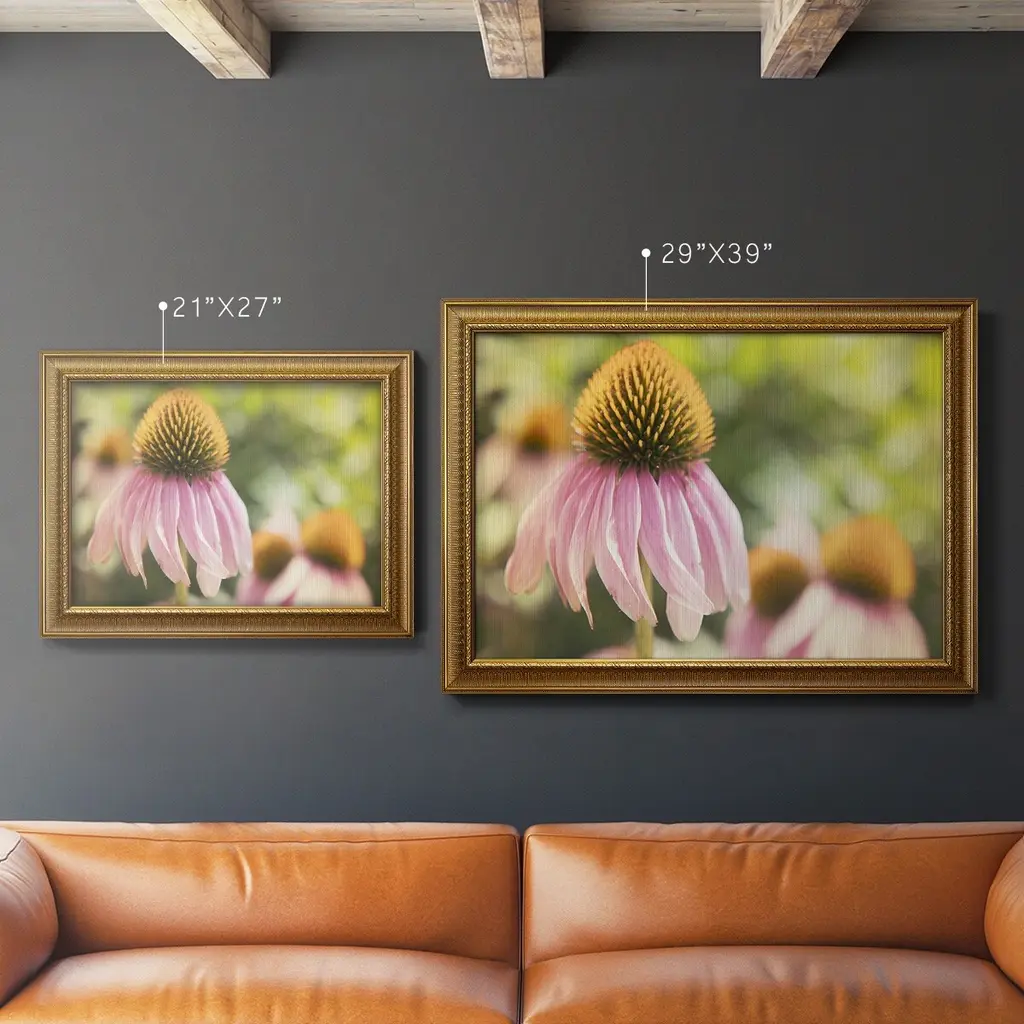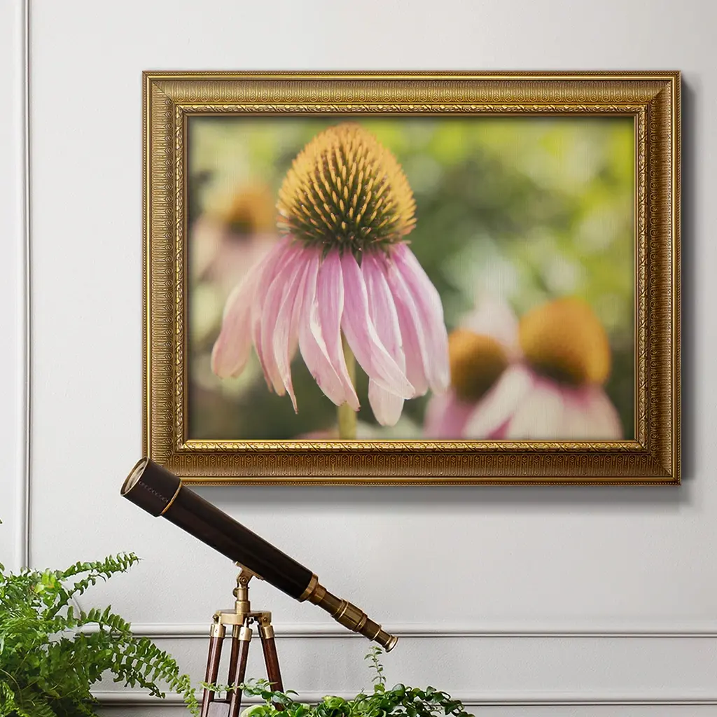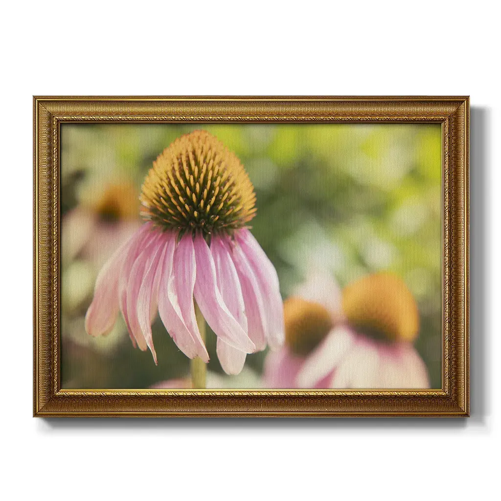 Echinacea Study II Premium Framed Canvas- Ready to Hang A Premium Framed Canvas created to last. Framed in distressed wood and available in an array of sizes and colors Featuring a beveled a solid wood stretcher bar, each piece comes ready to hand 3 SIZES AVAILABLE 16''X20'' - Overall Size 18'X27'' - Overall Size 24''x36'' - Overall Size Each piece is made to order. Each piece comes with hanging hardware. Made in the USA Ready to Hang Giclee Paper Print Acrylic Glass Beveled Matt Board