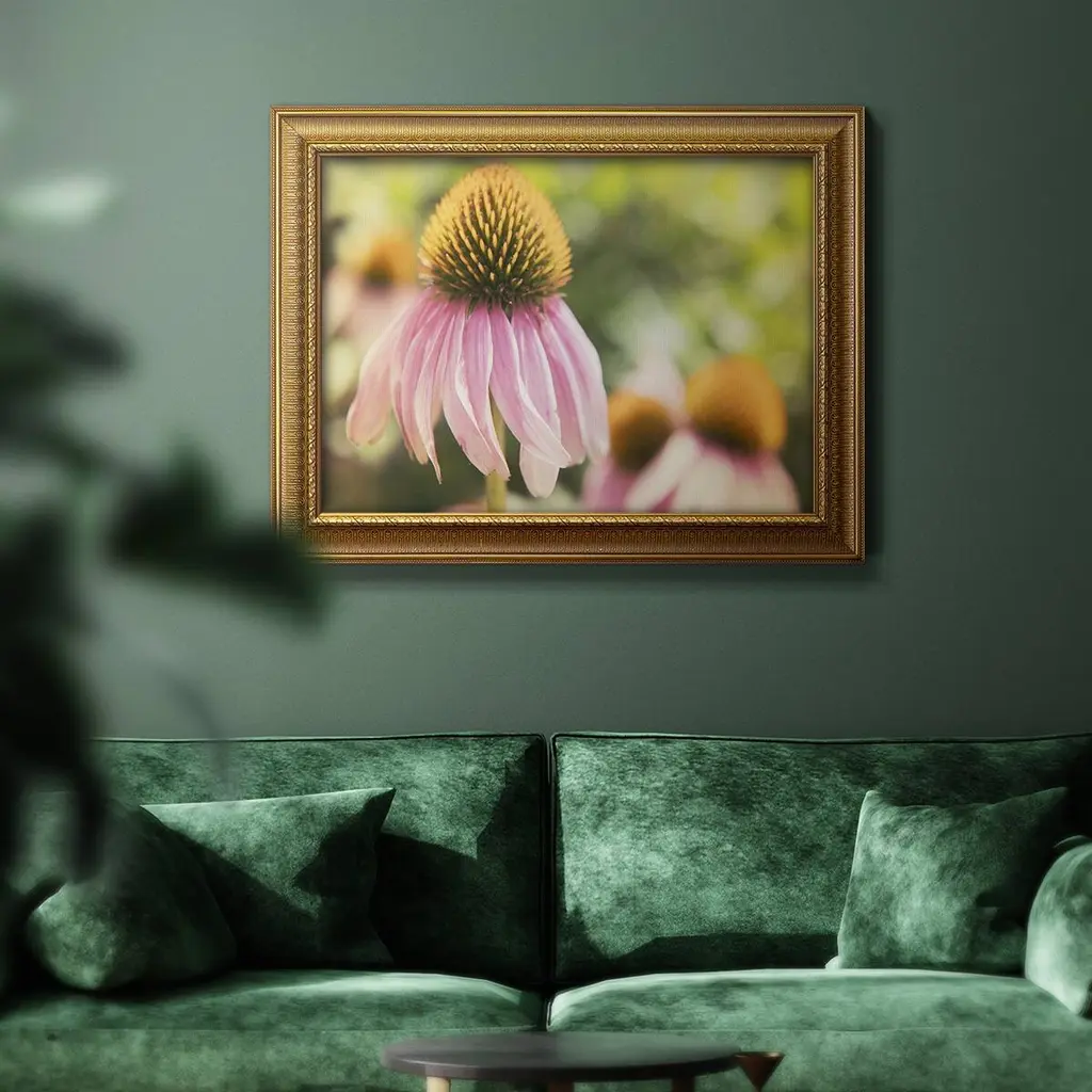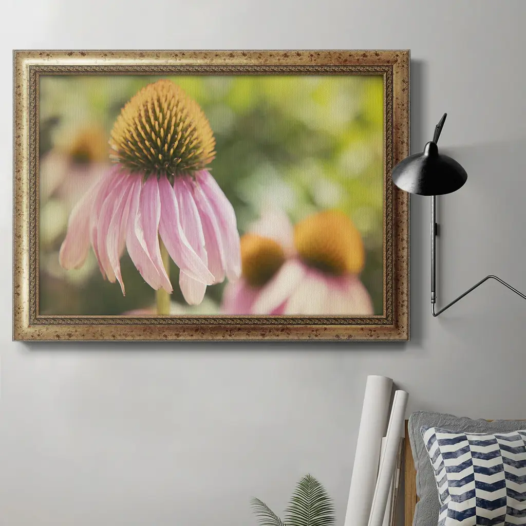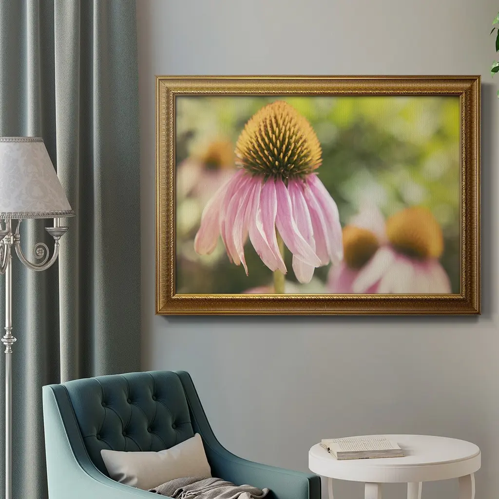 Echinacea Study II Premium Framed Canvas- Ready to Hang A Premium Framed Canvas created to last. Framed in distressed wood and available in an array of sizes and colors Featuring a beveled a solid wood stretcher bar, each piece comes ready to hand 3 SIZES AVAILABLE 16''X20'' - Overall Size 18'X27'' - Overall Size 24''x36'' - Overall Size Each piece is made to order. Each piece comes with hanging hardware. Made in the USA Ready to Hang Giclee Paper Print Acrylic Glass Beveled Matt Board