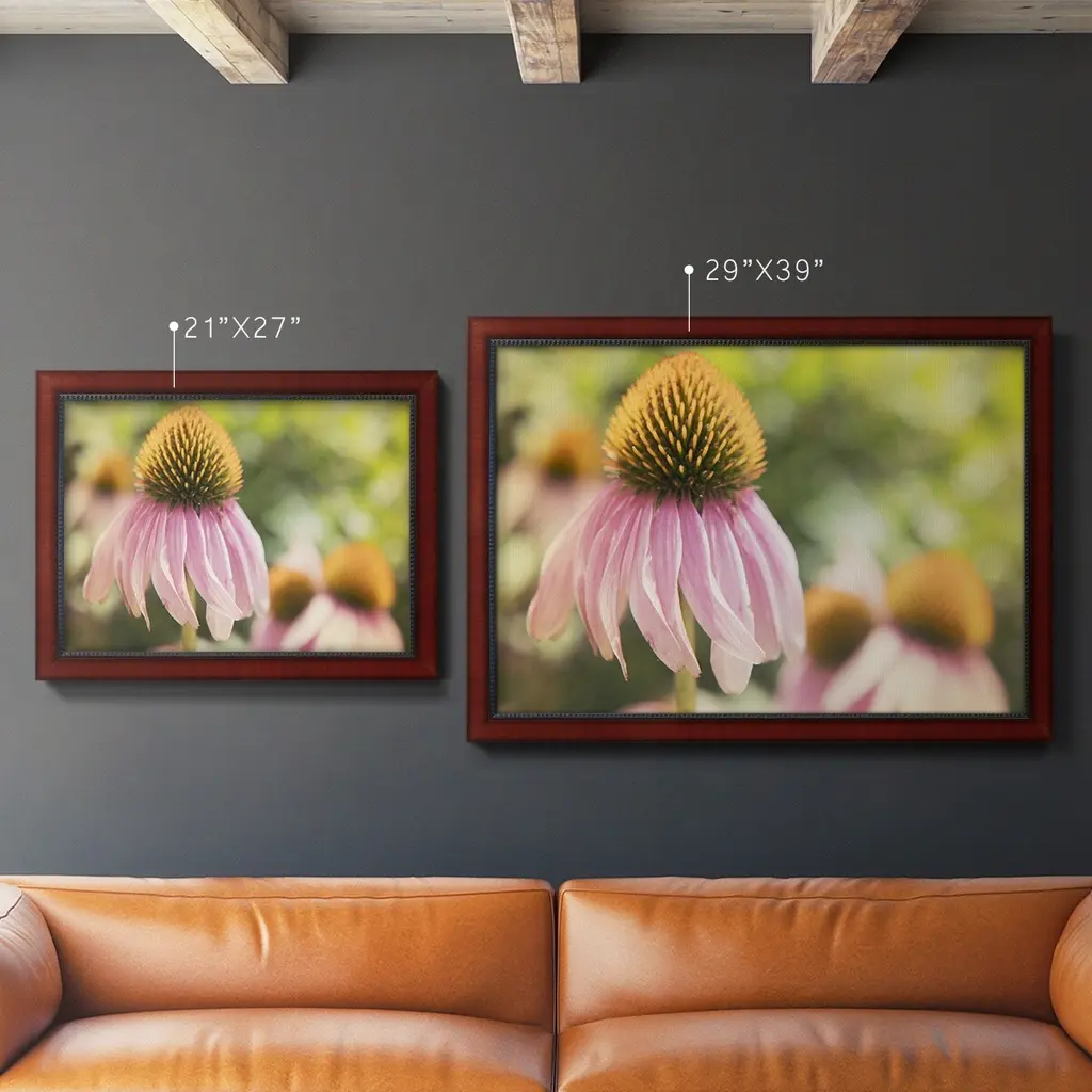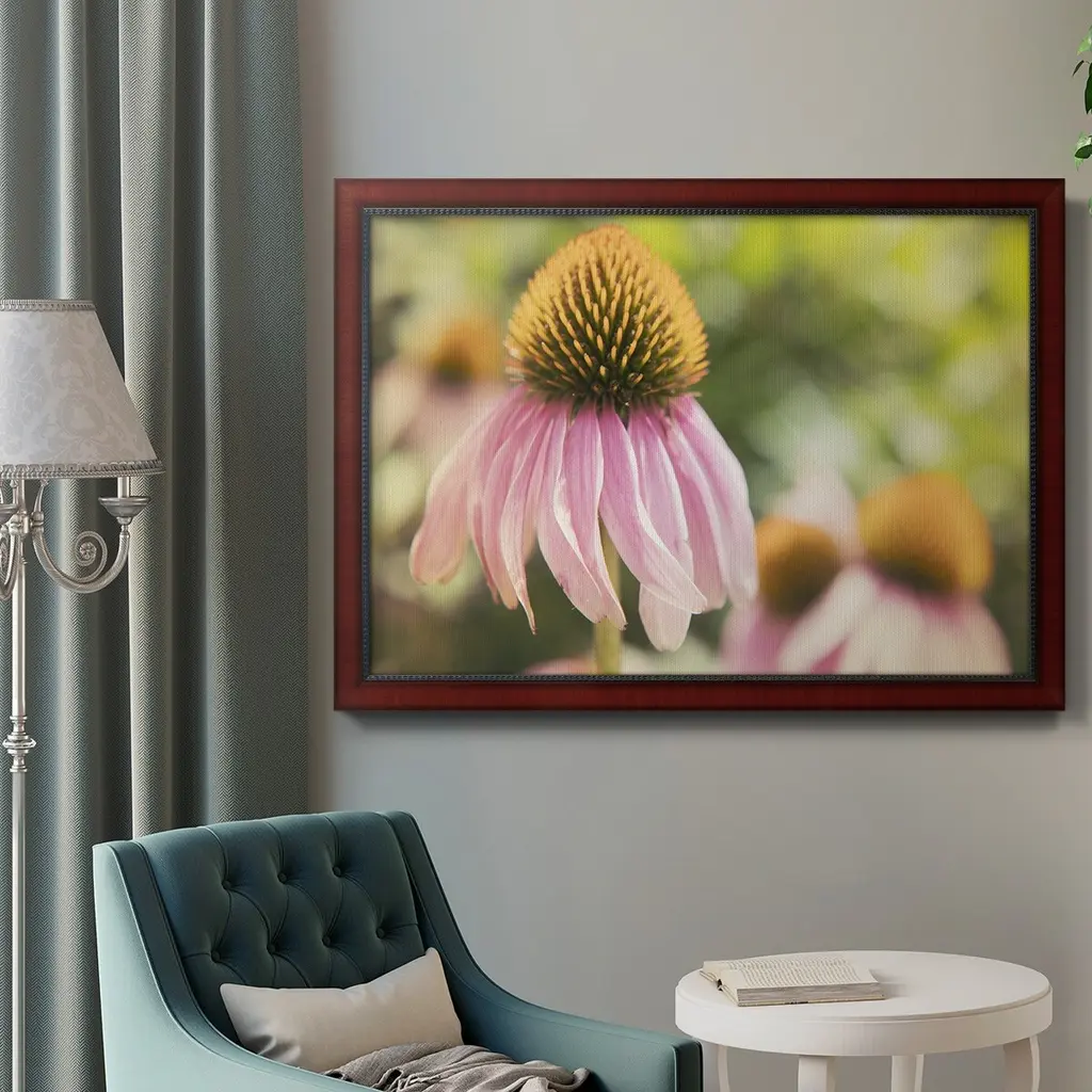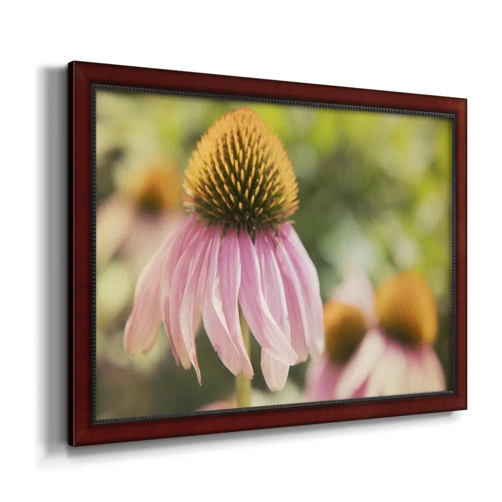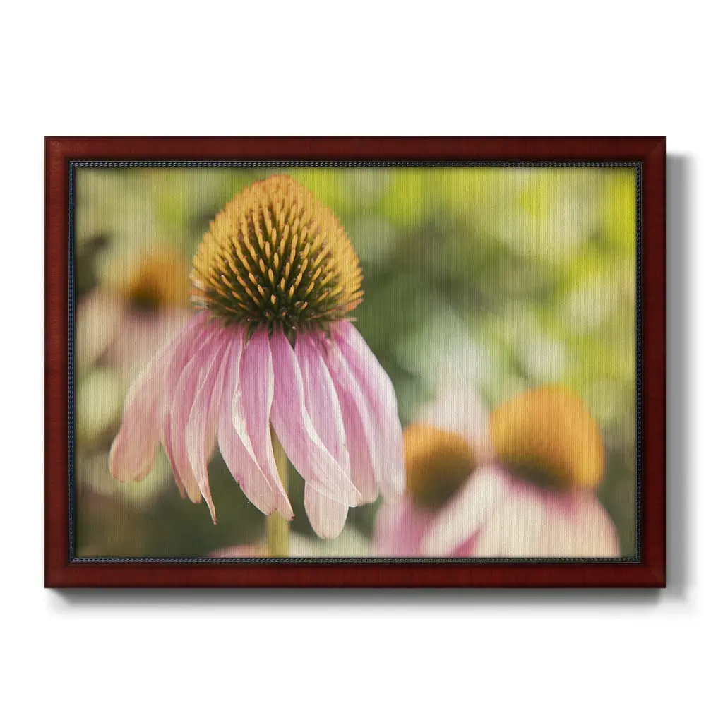 Echinacea Study II Premium Framed Canvas- Ready to Hang A Premium Framed Canvas created to last. Framed in distressed wood and available in an array of sizes and colors Featuring a beveled a solid wood stretcher bar, each piece comes ready to hand 3 SIZES AVAILABLE 16''X20'' - Overall Size 18'X27'' - Overall Size 24''x36'' - Overall Size Each piece is made to order. Each piece comes with hanging hardware. Made in the USA Ready to Hang Giclee Paper Print Acrylic Glass Beveled Matt Board