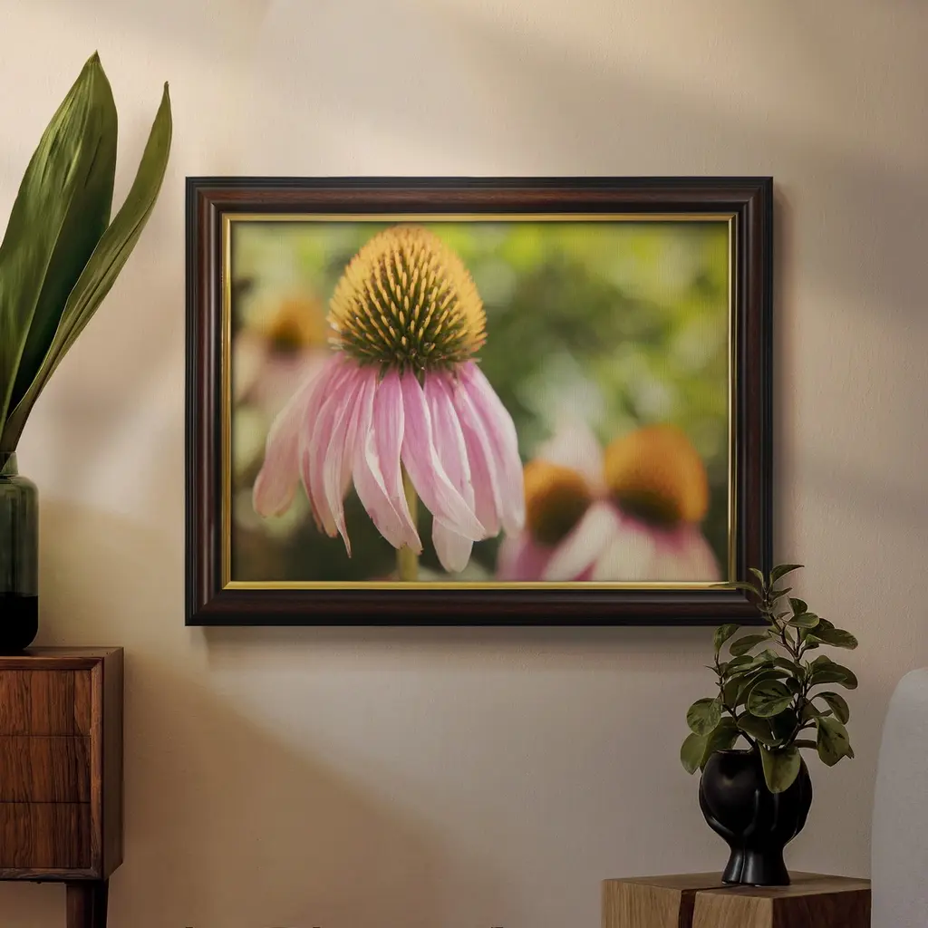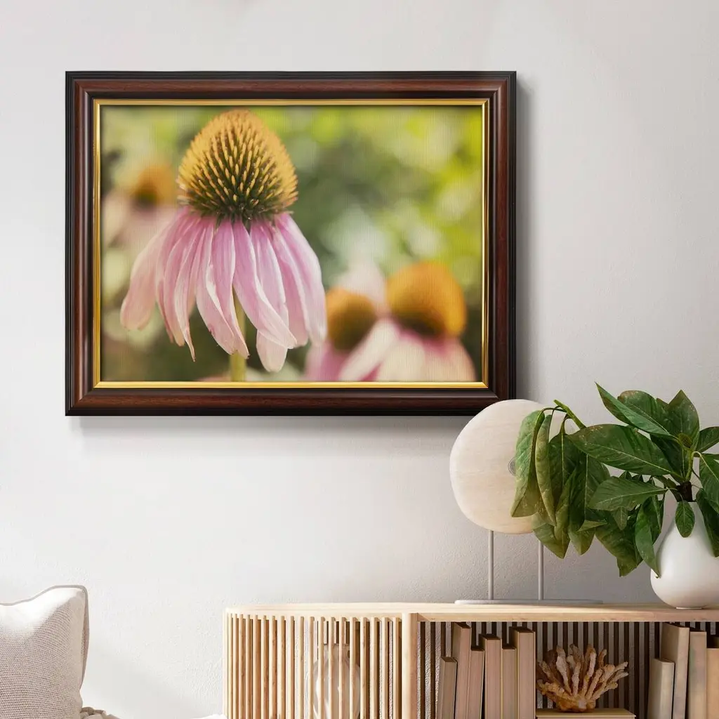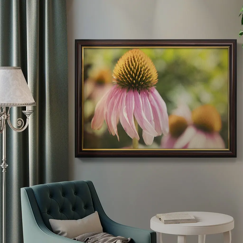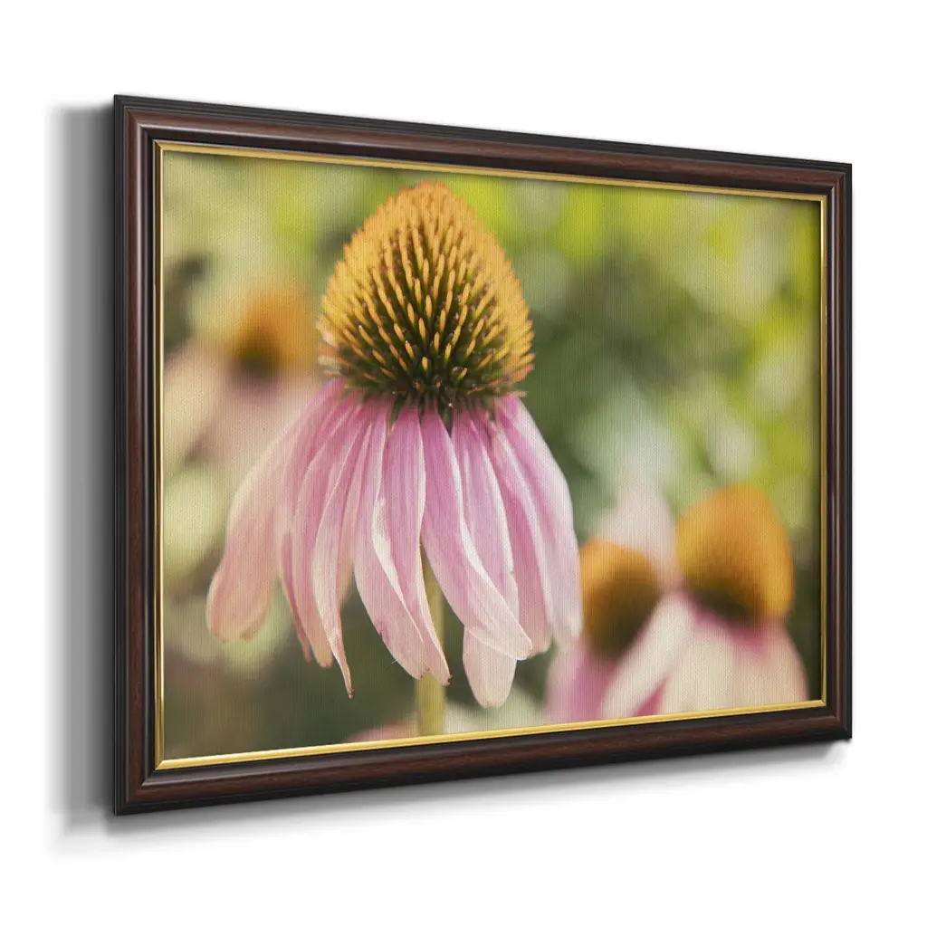 Echinacea Study II Premium Framed Canvas- Ready to Hang A Premium Framed Canvas created to last. Framed in distressed wood and available in an array of sizes and colors Featuring a beveled a solid wood stretcher bar, each piece comes ready to hand 3 SIZES AVAILABLE 16''X20'' - Overall Size 18'X27'' - Overall Size 24''x36'' - Overall Size Each piece is made to order. Each piece comes with hanging hardware. Made in the USA Ready to Hang Giclee Paper Print Acrylic Glass Beveled Matt Board