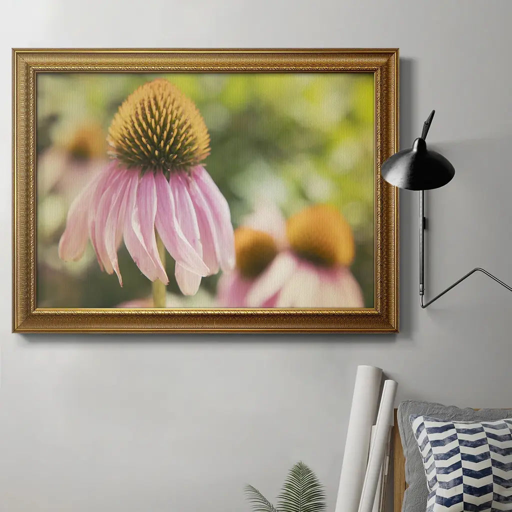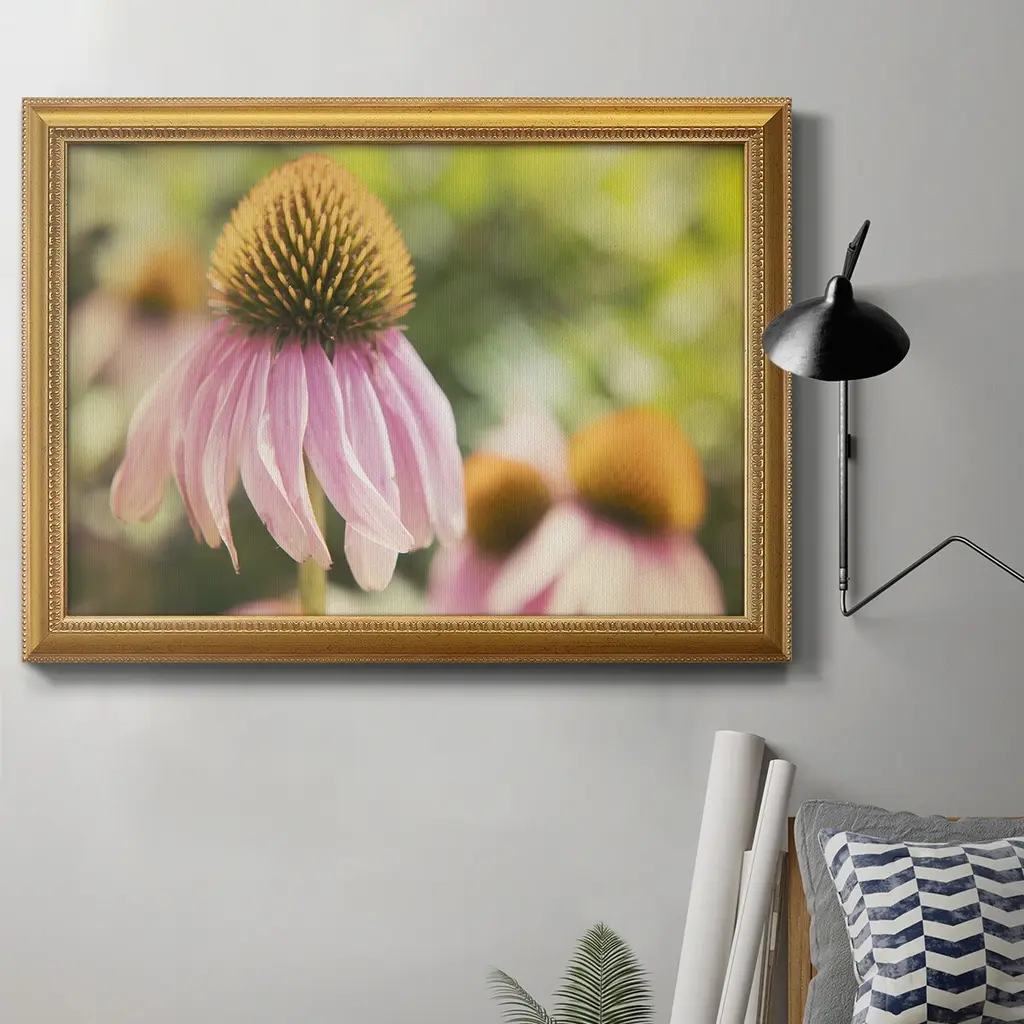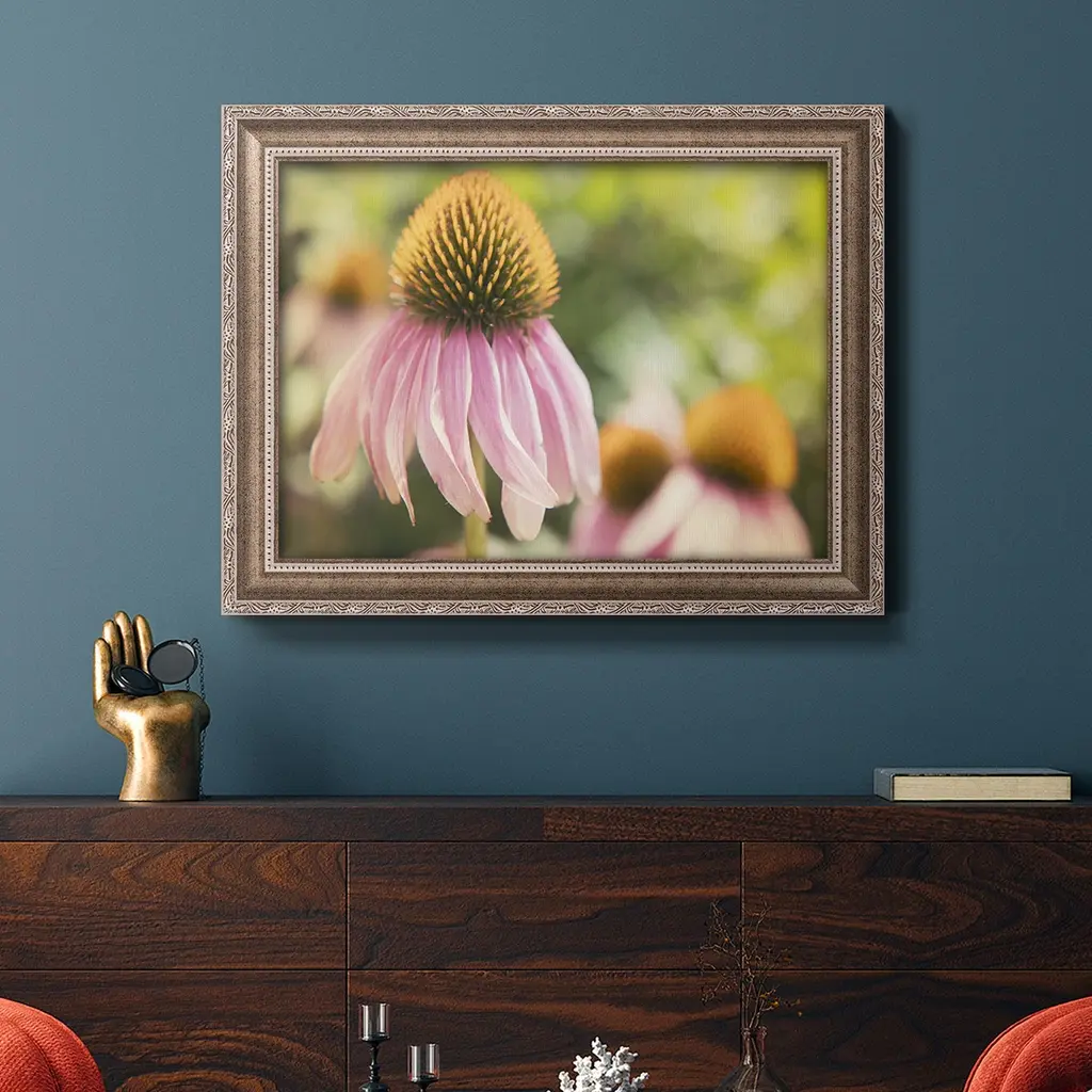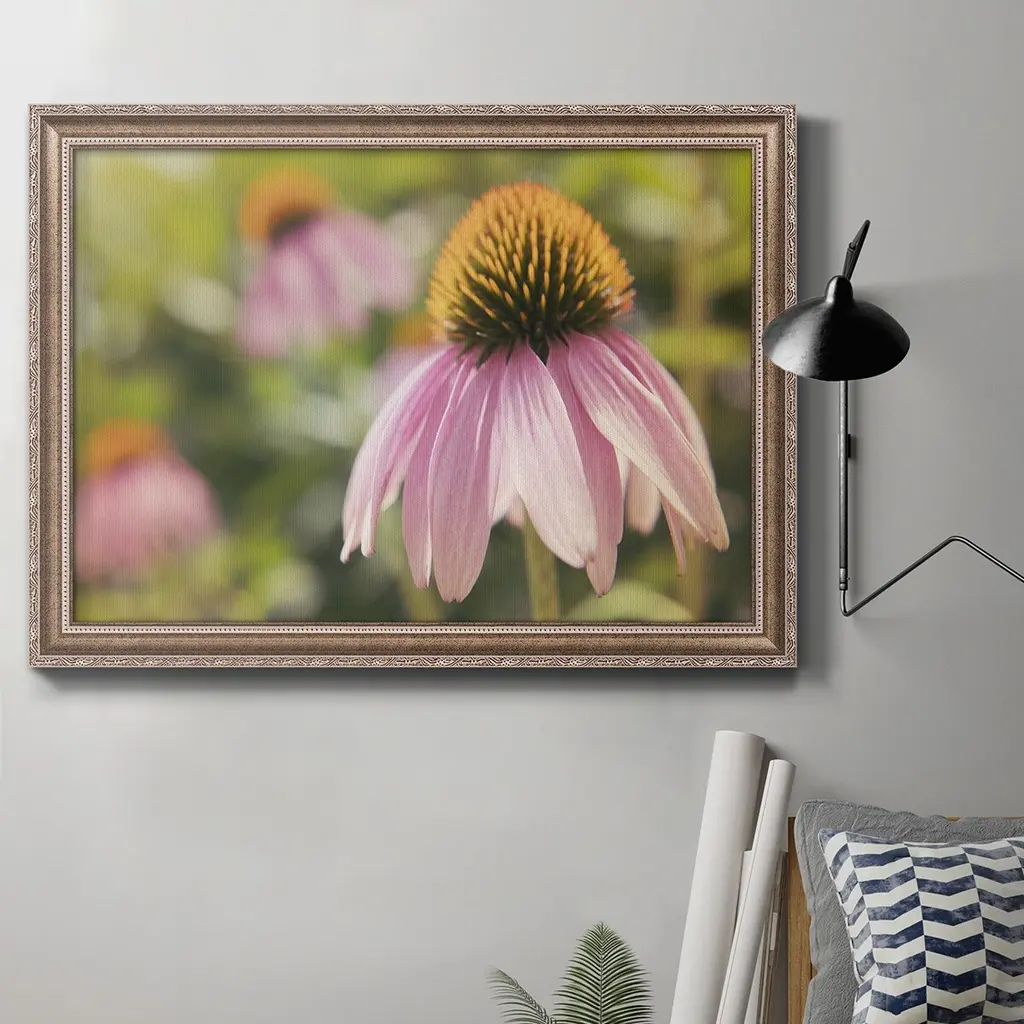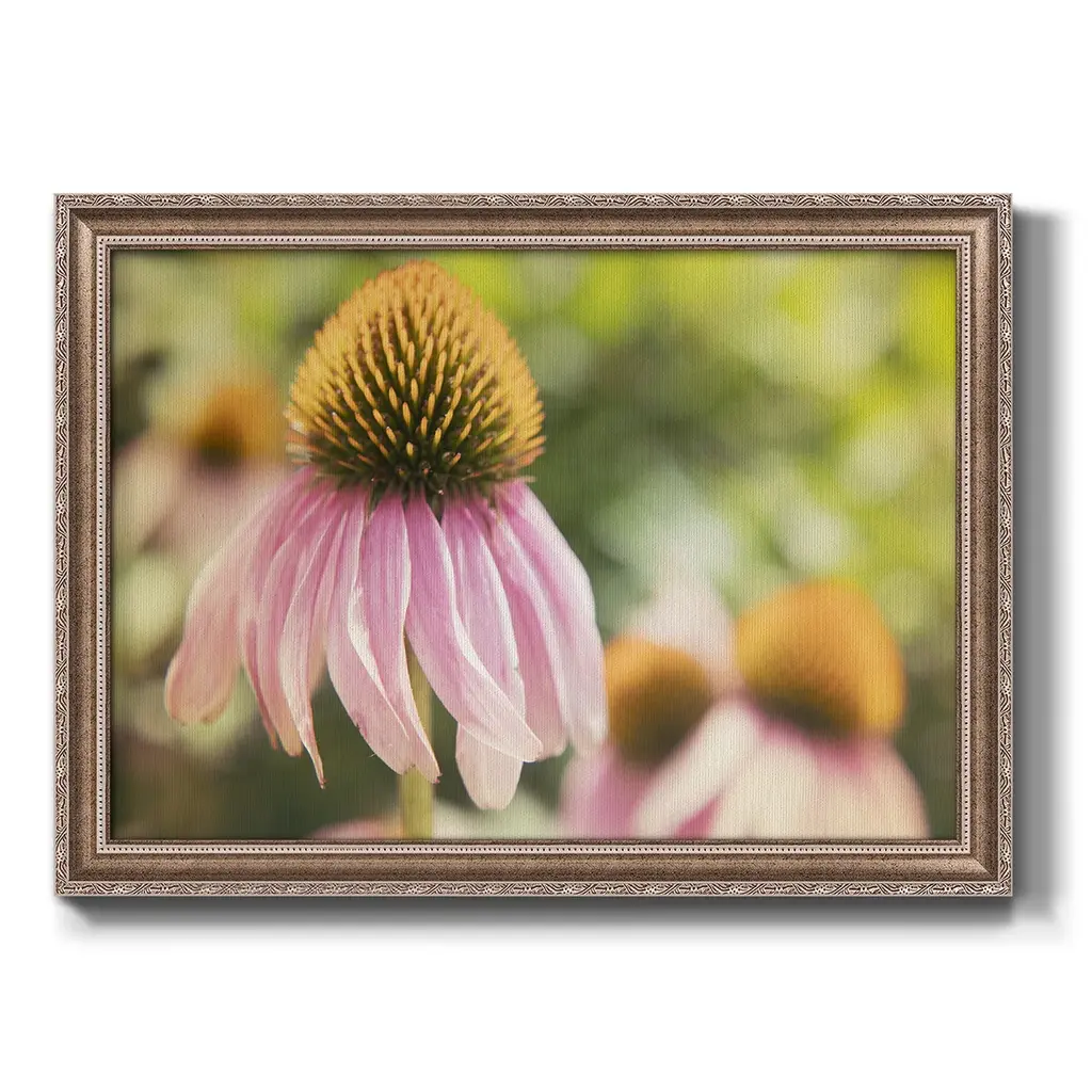 Echinacea Study II Premium Framed Canvas- Ready to Hang A Premium Framed Canvas created to last. Framed in distressed wood and available in an array of sizes and colors Featuring a beveled a solid wood stretcher bar, each piece comes ready to hand 3 SIZES AVAILABLE 16''X20'' - Overall Size 18'X27'' - Overall Size 24''x36'' - Overall Size Each piece is made to order. Each piece comes with hanging hardware. Made in the USA Ready to Hang Giclee Paper Print Acrylic Glass Beveled Matt Board