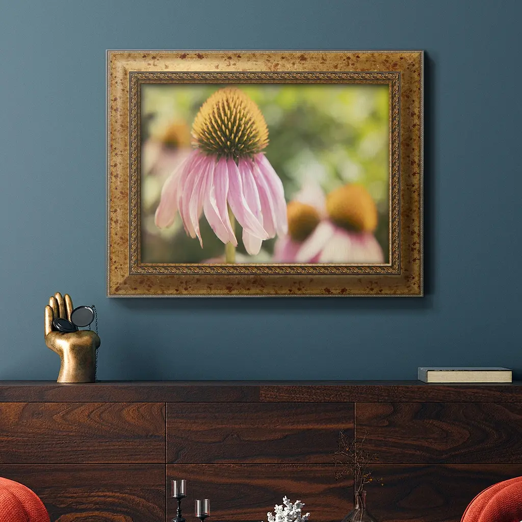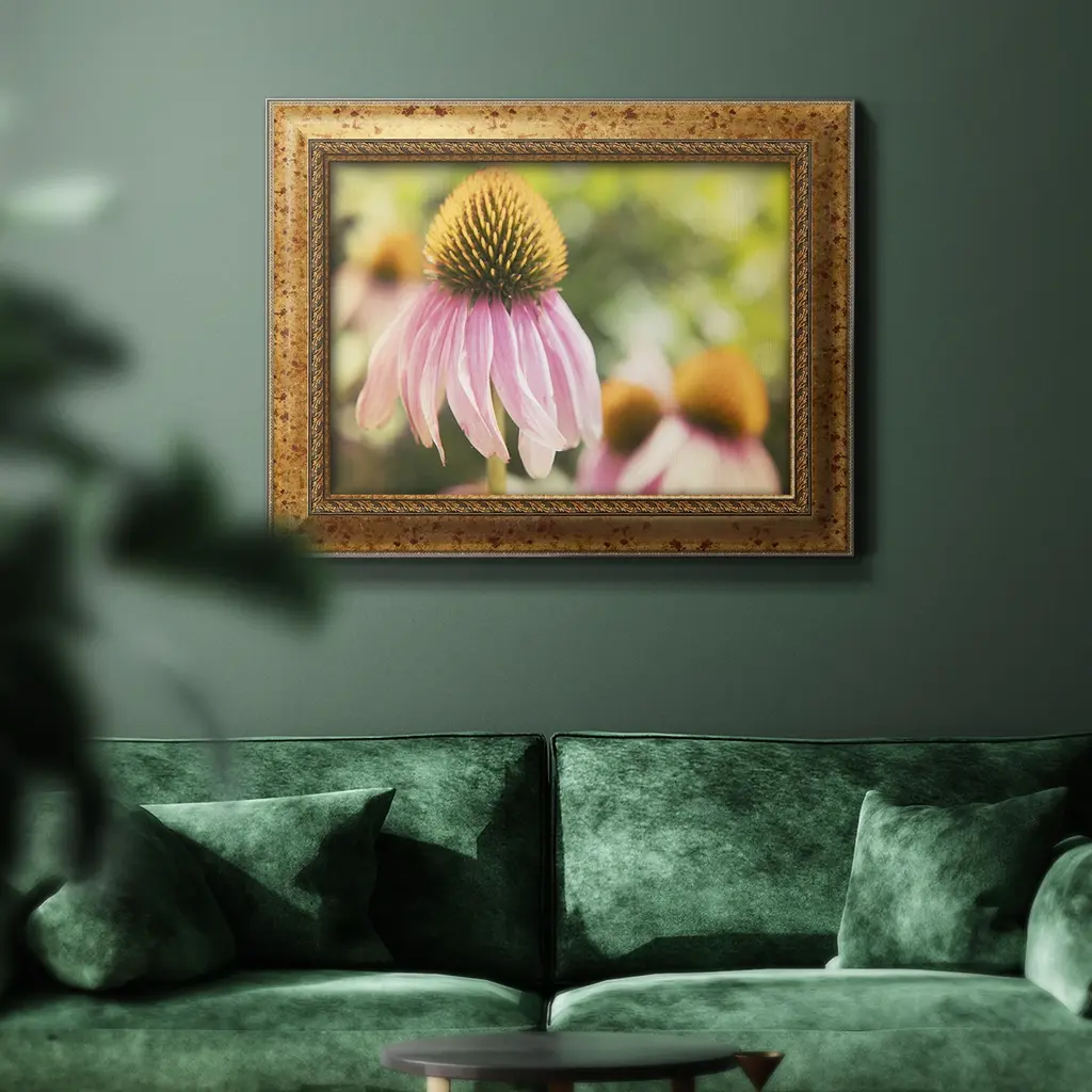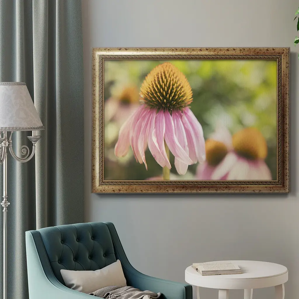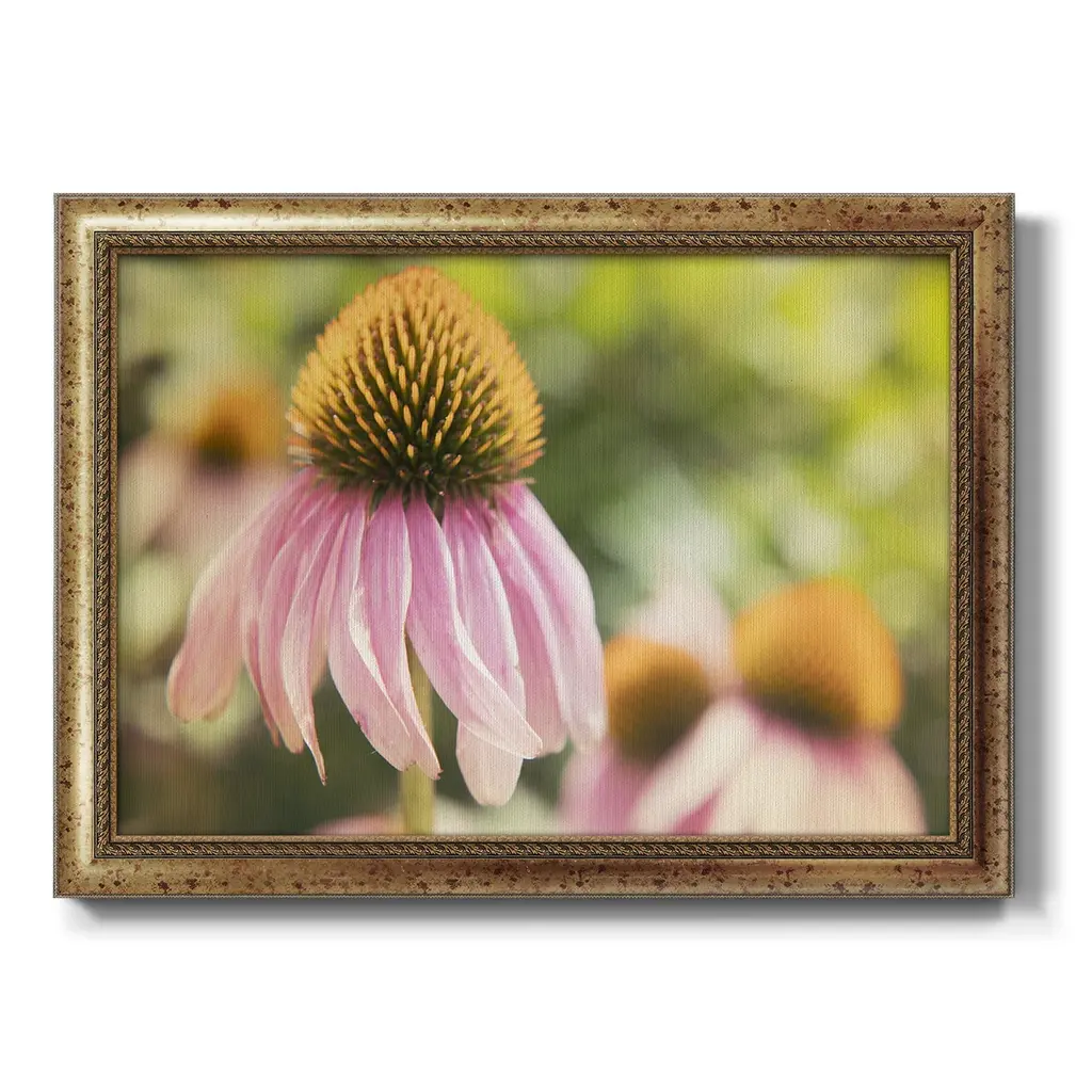 Echinacea Study II Premium Framed Canvas- Ready to Hang A Premium Framed Canvas created to last. Framed in distressed wood and available in an array of sizes and colors Featuring a beveled a solid wood stretcher bar, each piece comes ready to hand 3 SIZES AVAILABLE 16''X20'' - Overall Size 18'X27'' - Overall Size 24''x36'' - Overall Size Each piece is made to order. Each piece comes with hanging hardware. Made in the USA Ready to Hang Giclee Paper Print Acrylic Glass Beveled Matt Board