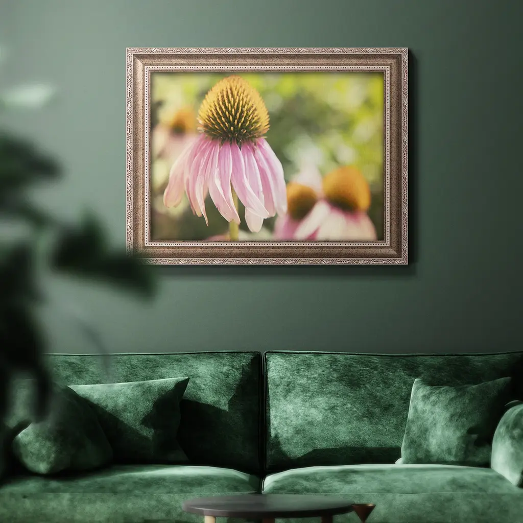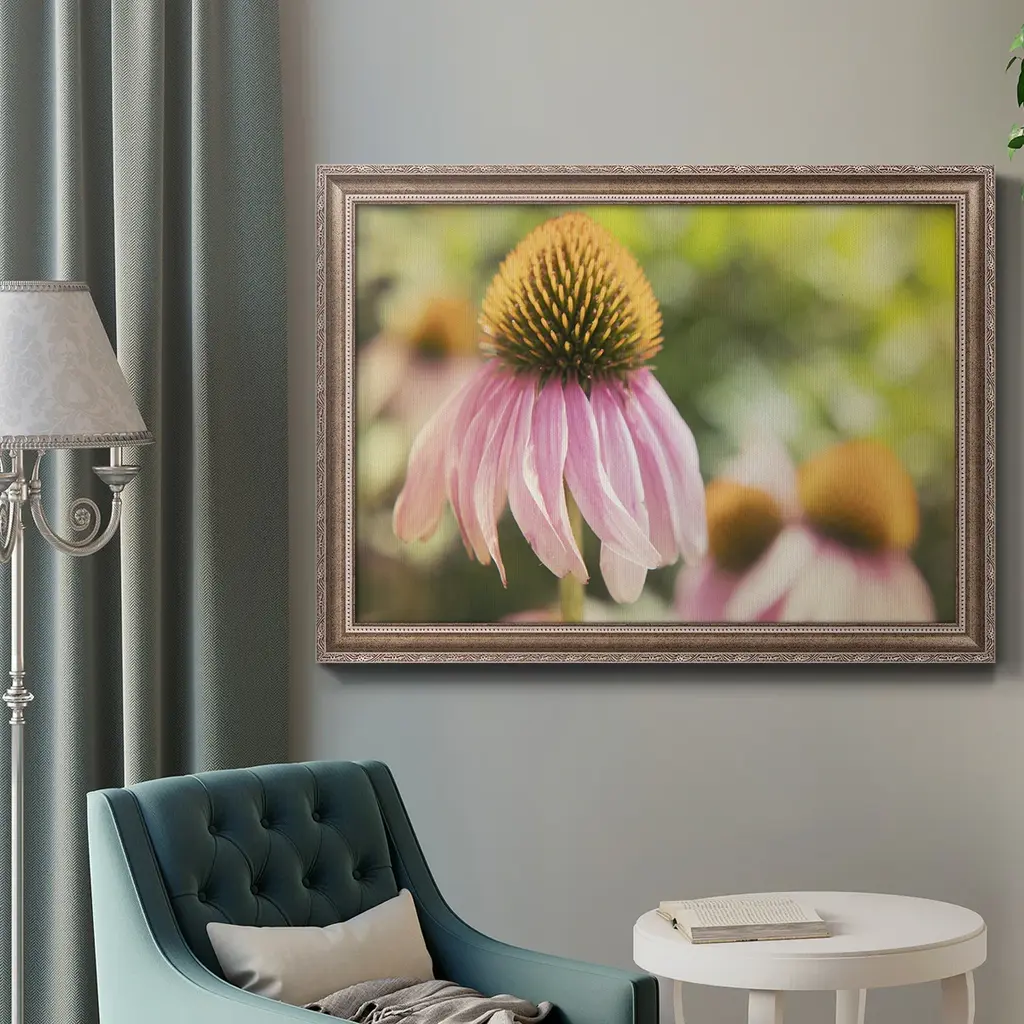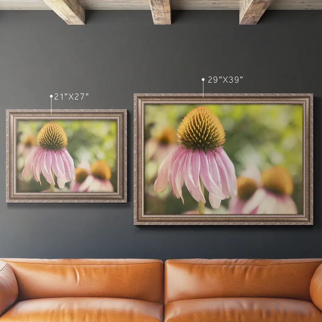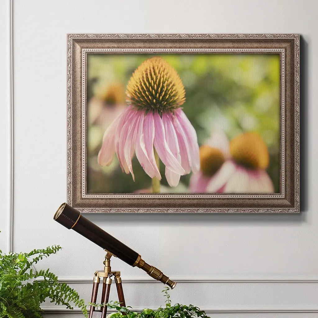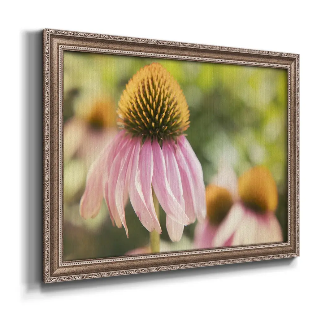Echinacea Study II Premium Framed Canvas- Ready to Hang A Premium Framed Canvas created to last. Framed in distressed wood and available in an array of sizes and colors Featuring a beveled a solid wood stretcher bar, each piece comes ready to hand 3 SIZES AVAILABLE 16''X20'' - Overall Size 18'X27'' - Overall Size 24''x36'' - Overall Size Each piece is made to order. Each piece comes with hanging hardware. Made in the USA Ready to Hang Giclee Paper Print Acrylic Glass Beveled Matt Board