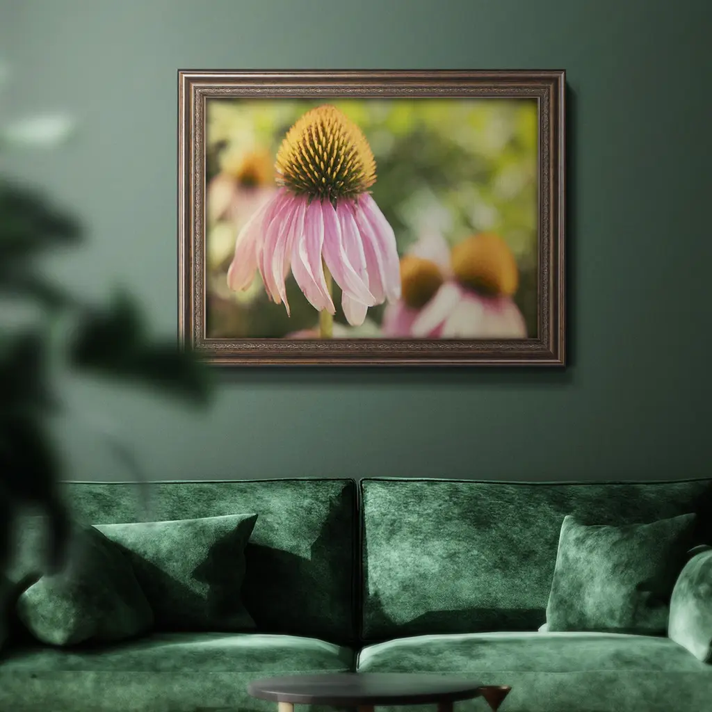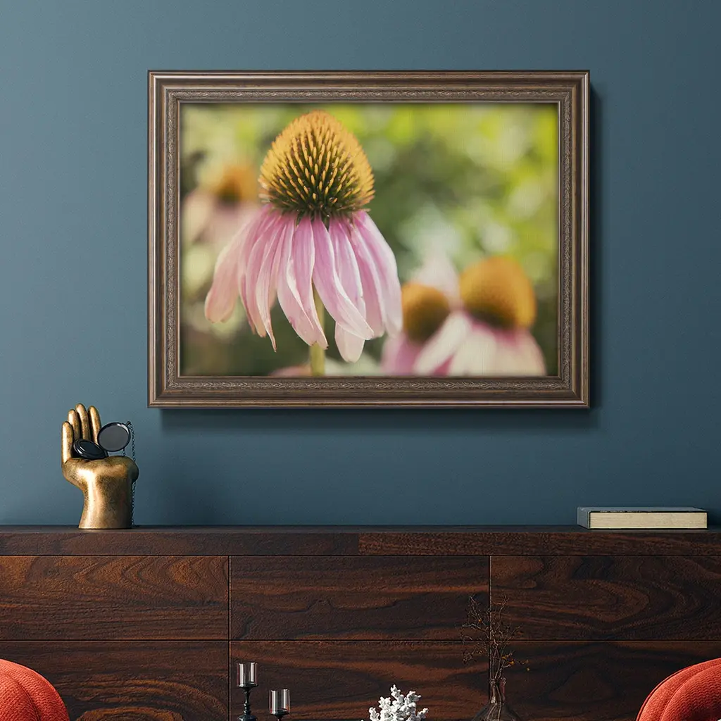 Echinacea Study II Premium Framed Canvas- Ready to Hang A Premium Framed Canvas created to last. Framed in distressed wood and available in an array of sizes and colors Featuring a beveled a solid wood stretcher bar, each piece comes ready to hand 3 SIZES AVAILABLE 16''X20'' - Overall Size 18'X27'' - Overall Size 24''x36'' - Overall Size Each piece is made to order. Each piece comes with hanging hardware. Made in the USA Ready to Hang Giclee Paper Print Acrylic Glass Beveled Matt Board