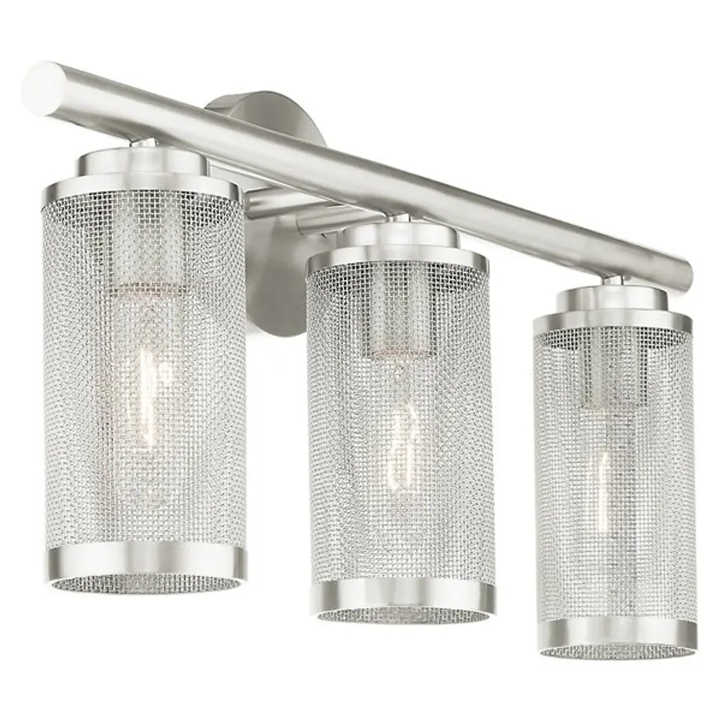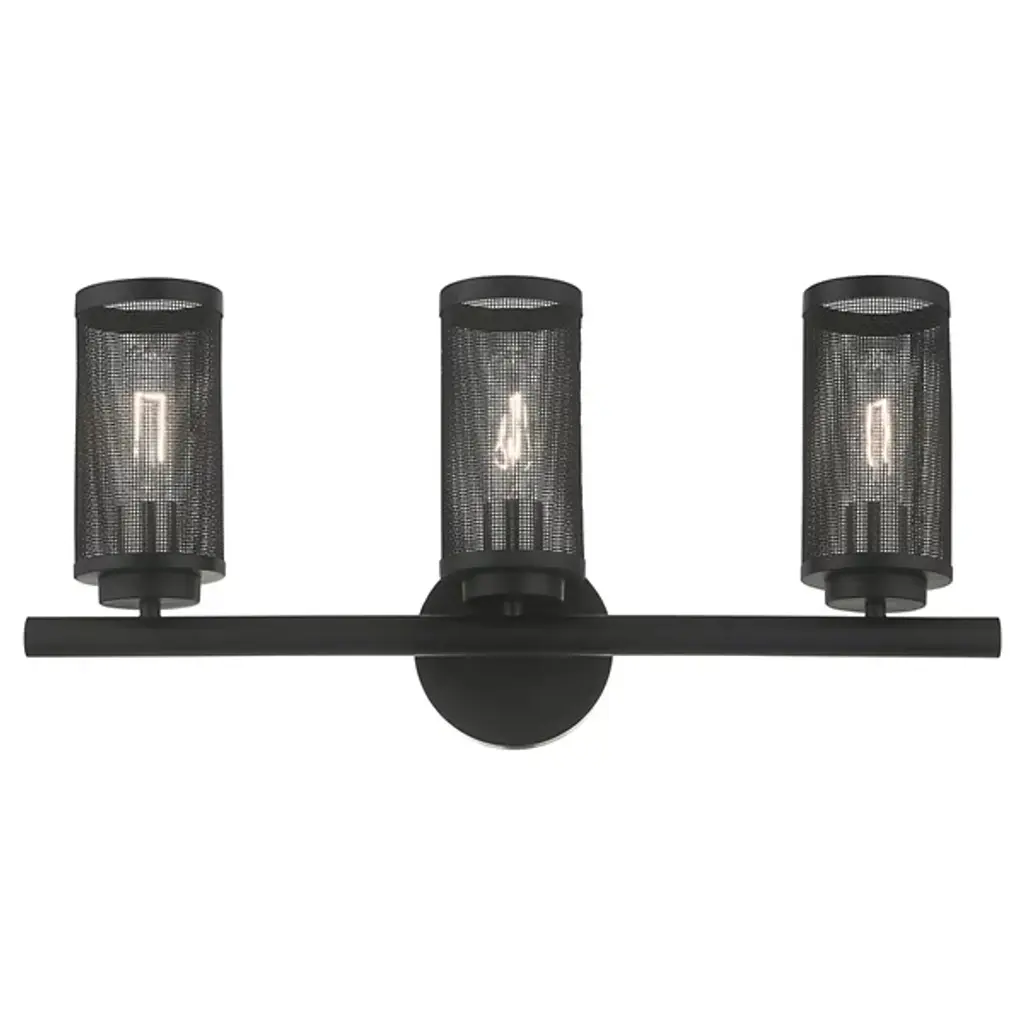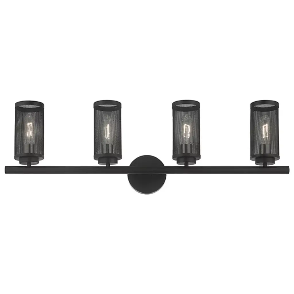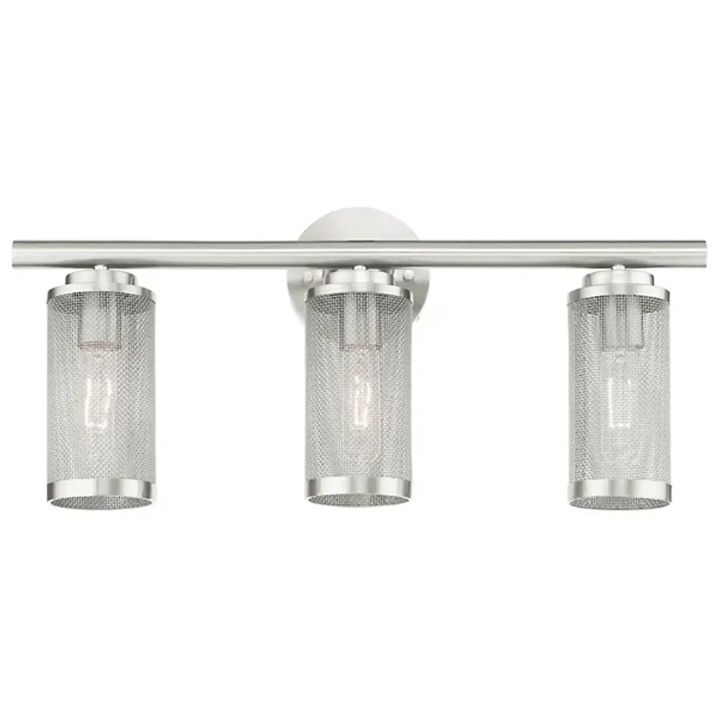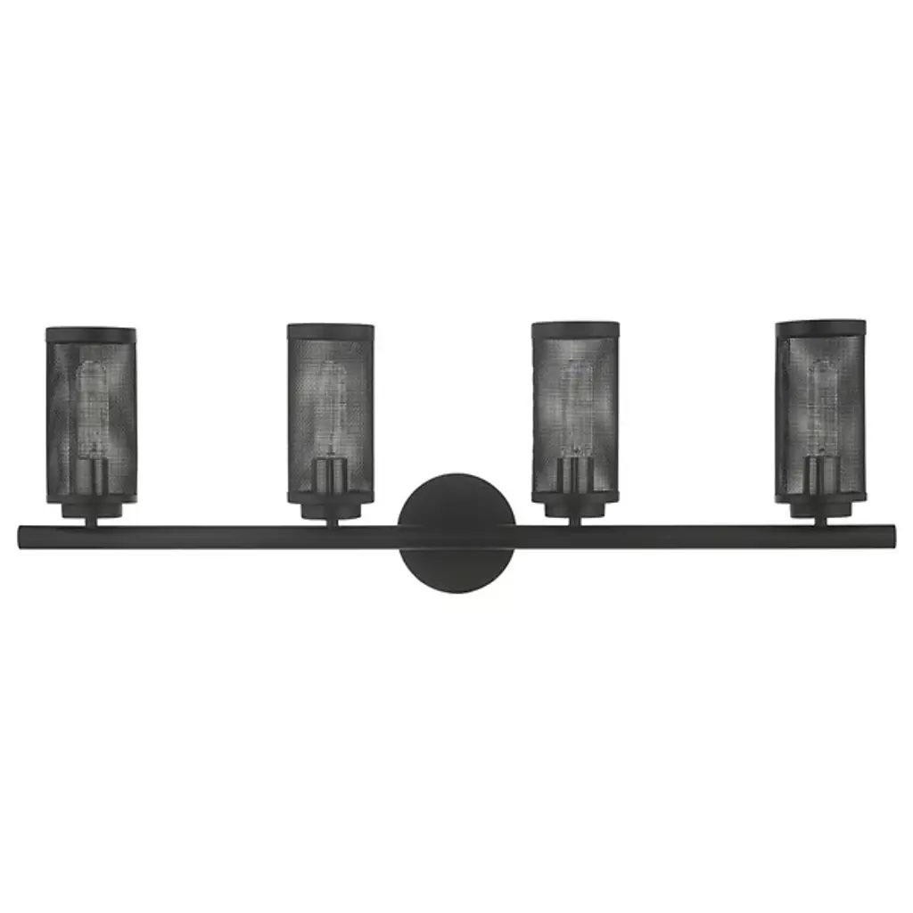 Echoes of industrial design. The Echo Vanity Light from Alder & Ore complements the bold styles one displays in front of the mirror with warm light and a striking mesh pattern. It crowns the mirror with a compact circular backplate, following its edge with a sleek crossbar. Short geometric elements atop the crossbar help set the piece’s cylindrical silhouette. Fine metal mesh shades invite one closer to inspect its wrapping grid pattern. This pattern receives warm highlights from the bulbs behind. The airy shade presents the bathroom with a glare-free, evenly diffused light.