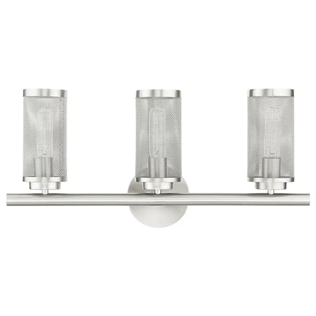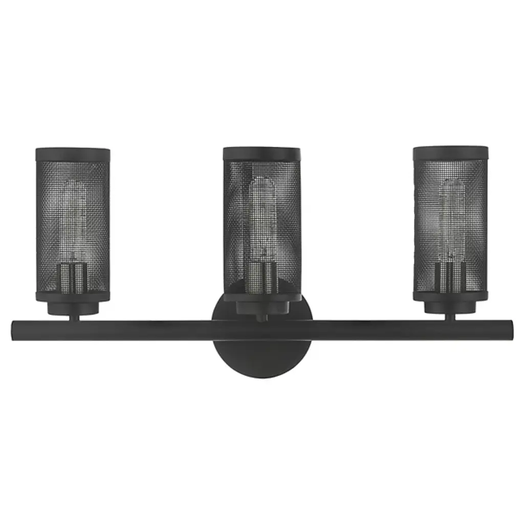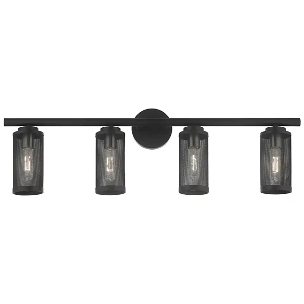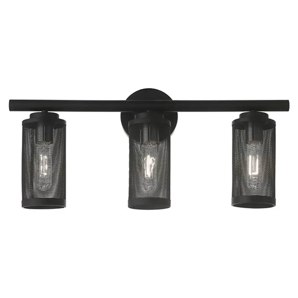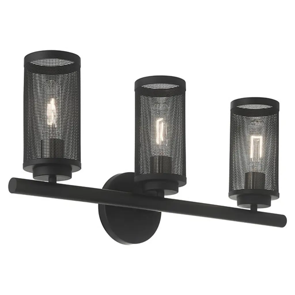 Echoes of industrial design. The Echo Vanity Light from Alder & Ore complements the bold styles one displays in front of the mirror with warm light and a striking mesh pattern. It crowns the mirror with a compact circular backplate, following its edge with a sleek crossbar. Short geometric elements atop the crossbar help set the piece’s cylindrical silhouette. Fine metal mesh shades invite one closer to inspect its wrapping grid pattern. This pattern receives warm highlights from the bulbs behind. The airy shade presents the bathroom with a glare-free, evenly diffused light.