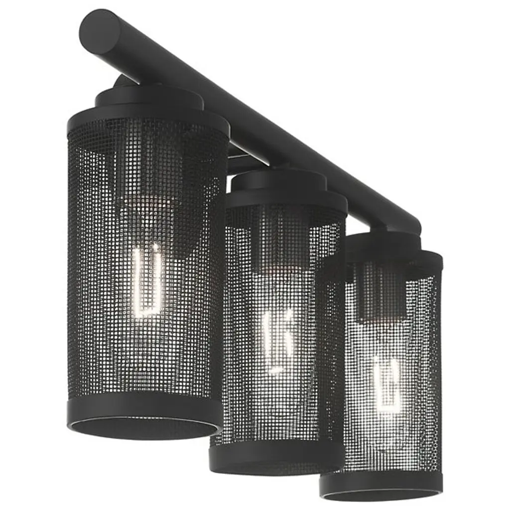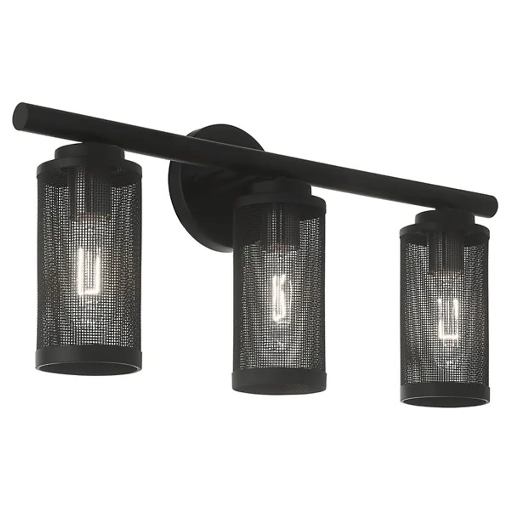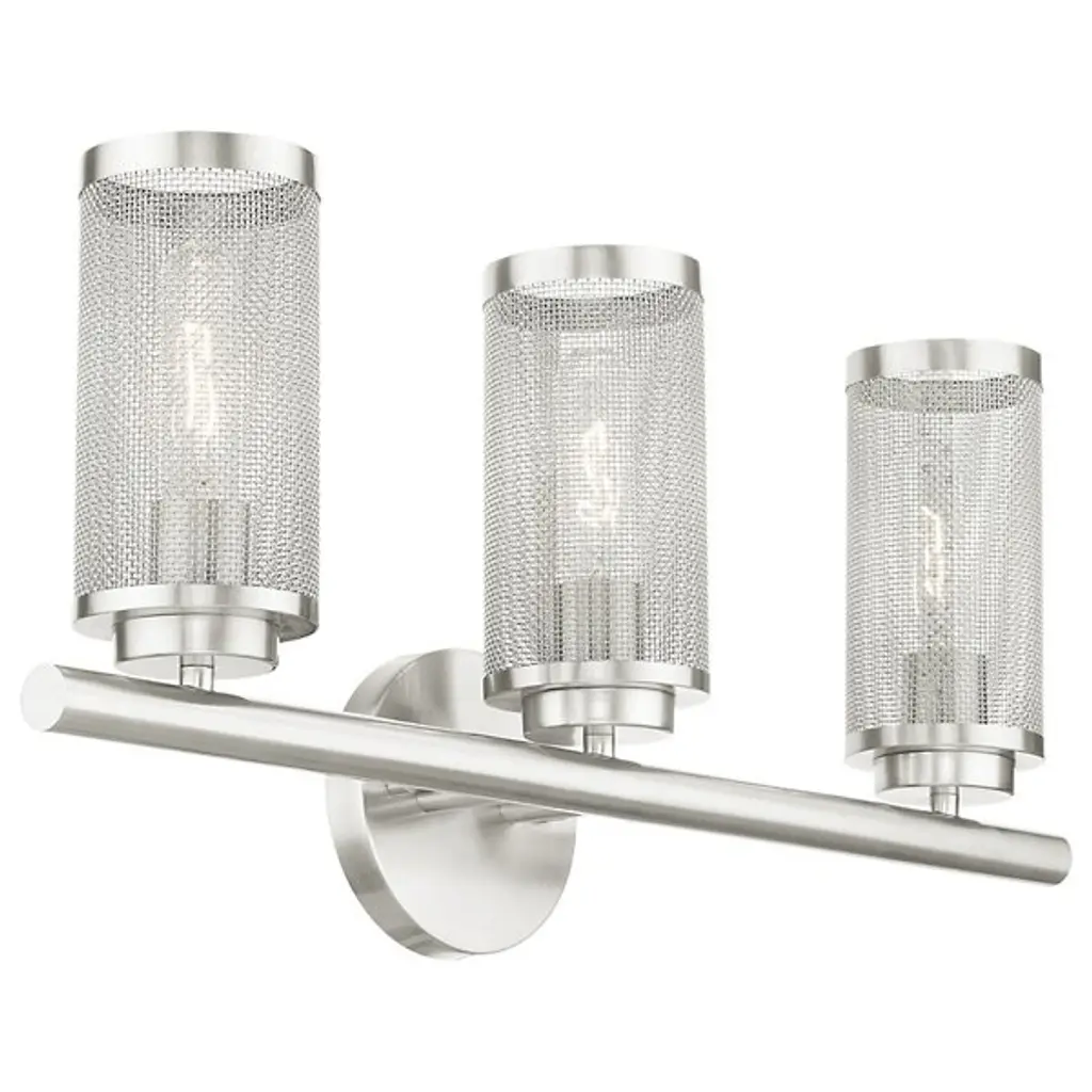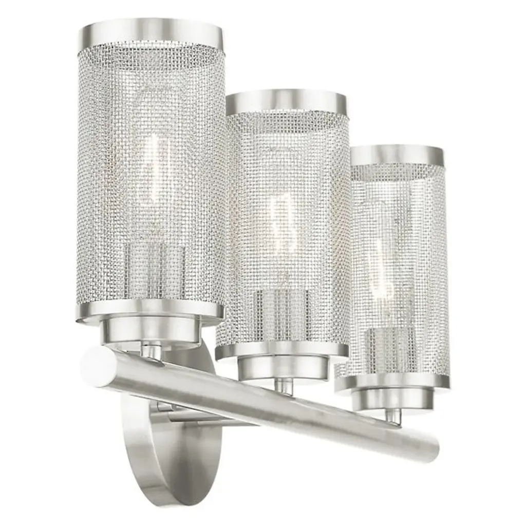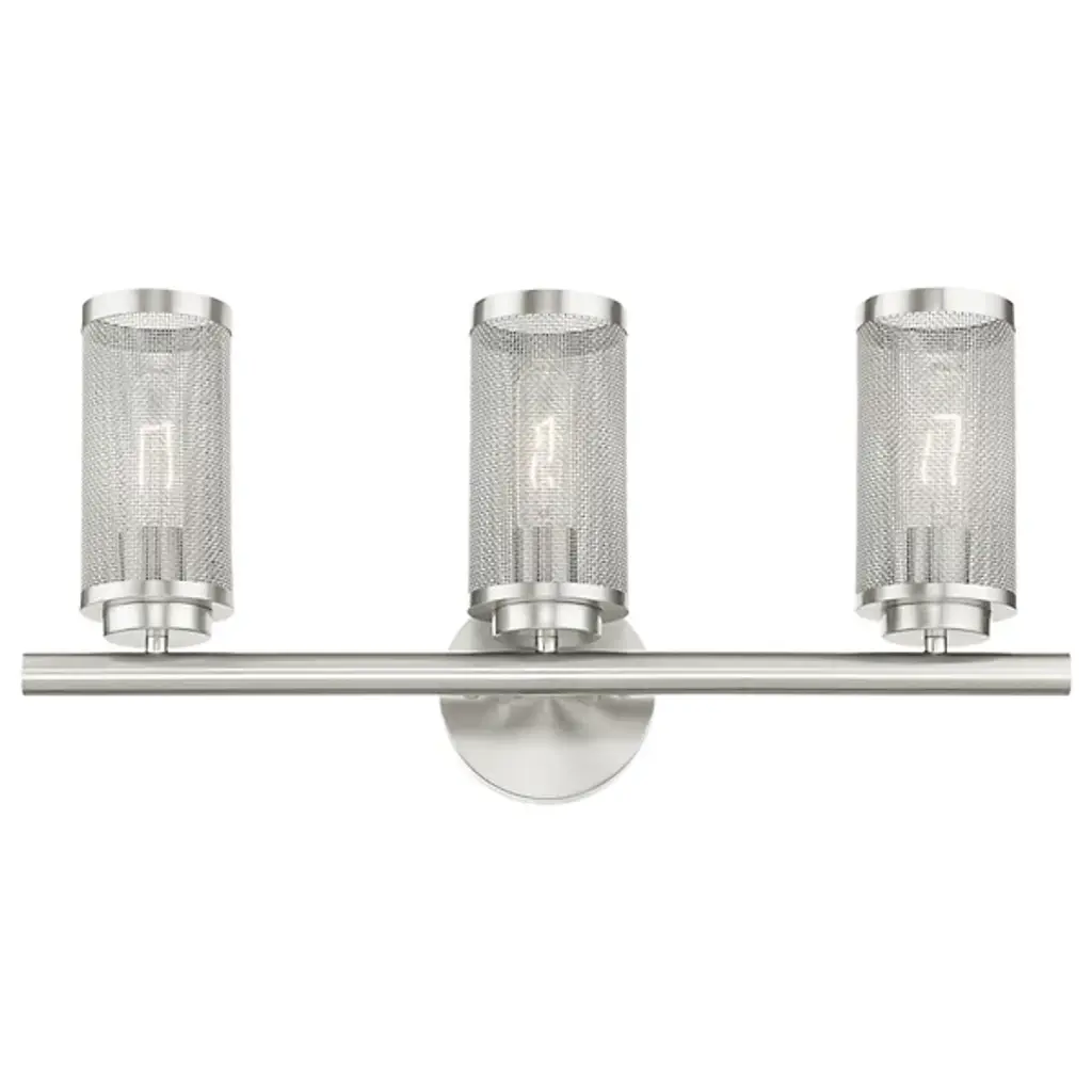 Echoes of industrial design. The Echo Vanity Light from Alder & Ore complements the bold styles one displays in front of the mirror with warm light and a striking mesh pattern. It crowns the mirror with a compact circular backplate, following its edge with a sleek crossbar. Short geometric elements atop the crossbar help set the piece’s cylindrical silhouette. Fine metal mesh shades invite one closer to inspect its wrapping grid pattern. This pattern receives warm highlights from the bulbs behind. The airy shade presents the bathroom with a glare-free, evenly diffused light.