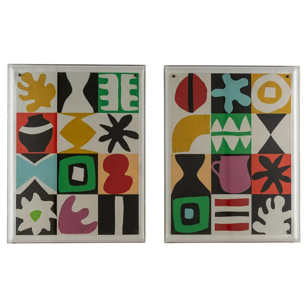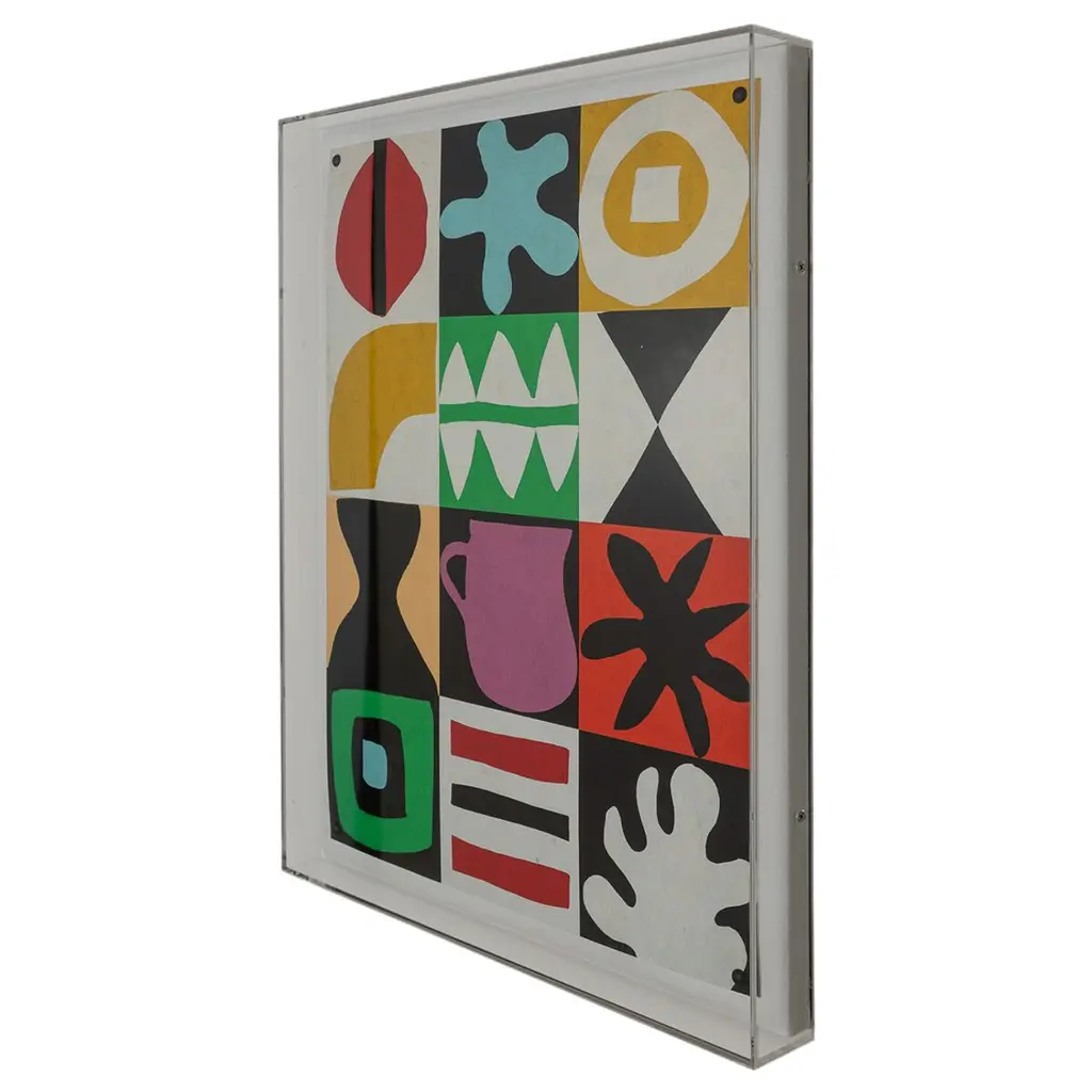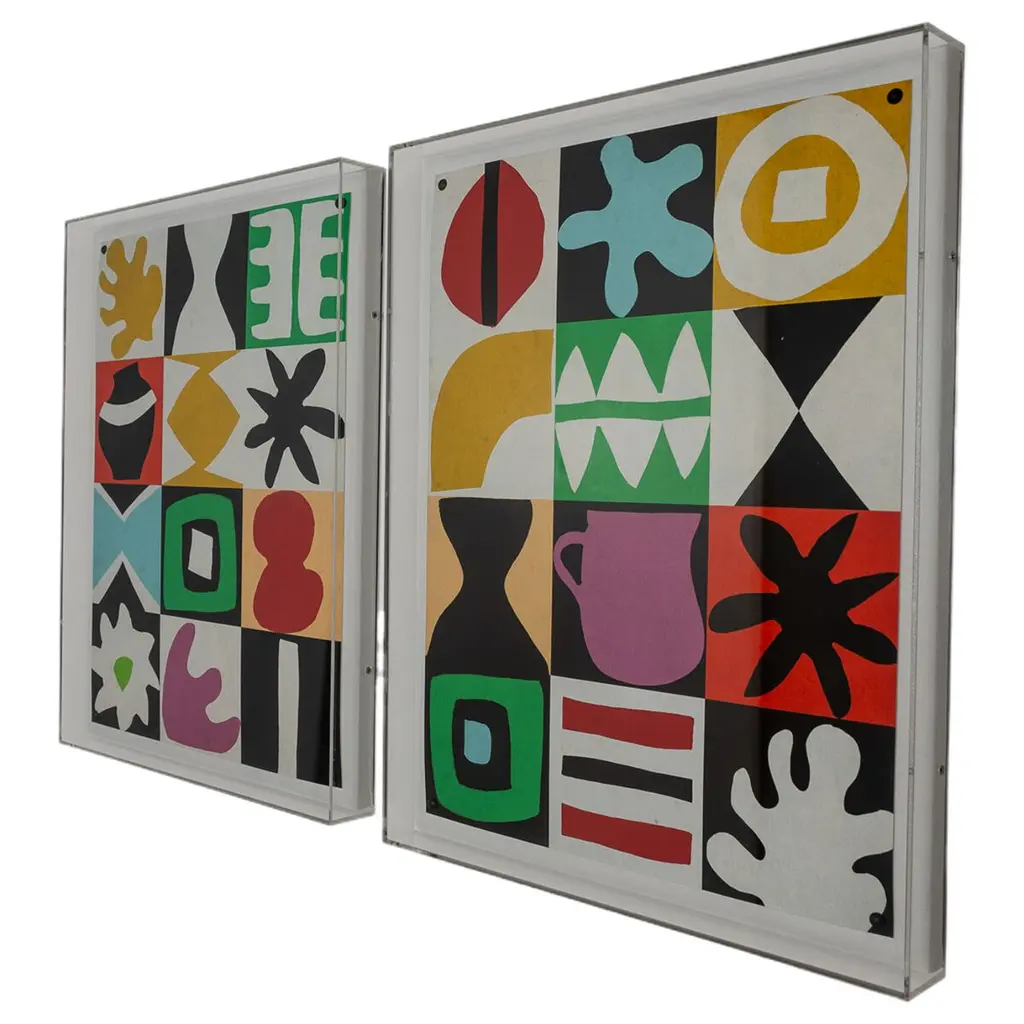 Eclectic is a colorful pair of graphic symbols of shapes, urns, starburst, and lines all stacked into a bold art statement. Featuring a giclee print mounted under a 2.5" deep lucite shadow box, the artwork print is attached to a linen wrapped interior panel and finished with black nail head in each corner. Each panel is sold individually. Artwork may be hung individually or as a pair. Measurements: 26"H x 20"W x 2.5"D. Materials: acrylic frame, interior board mount, giclee paper print.
