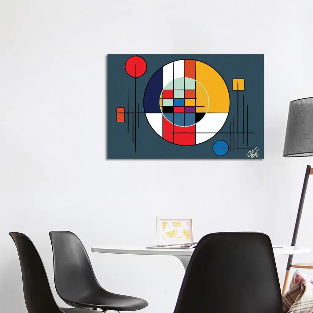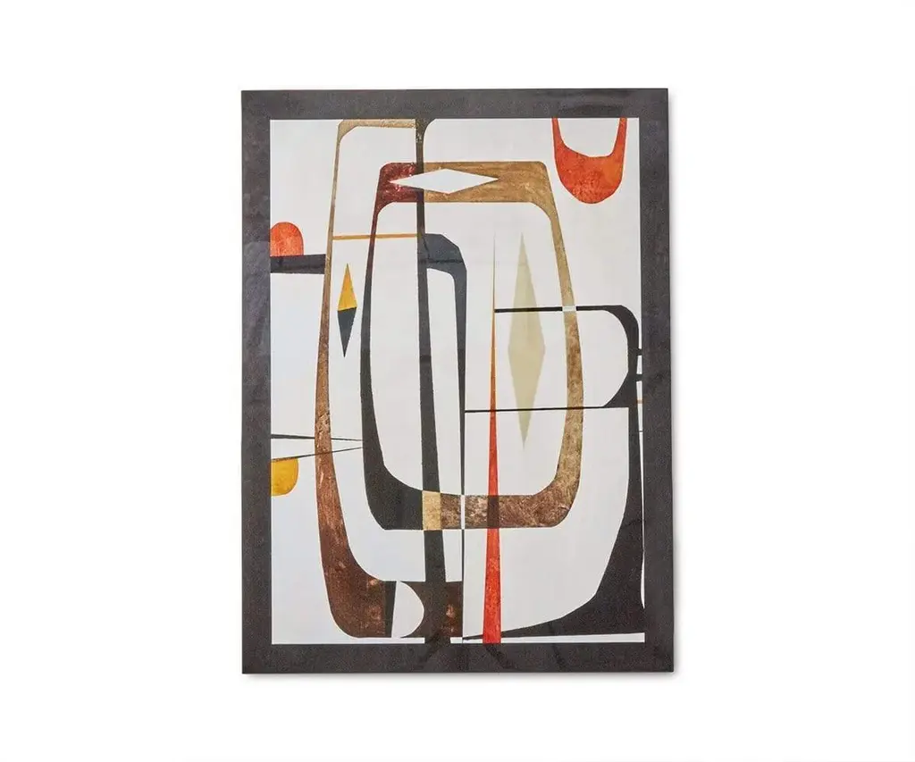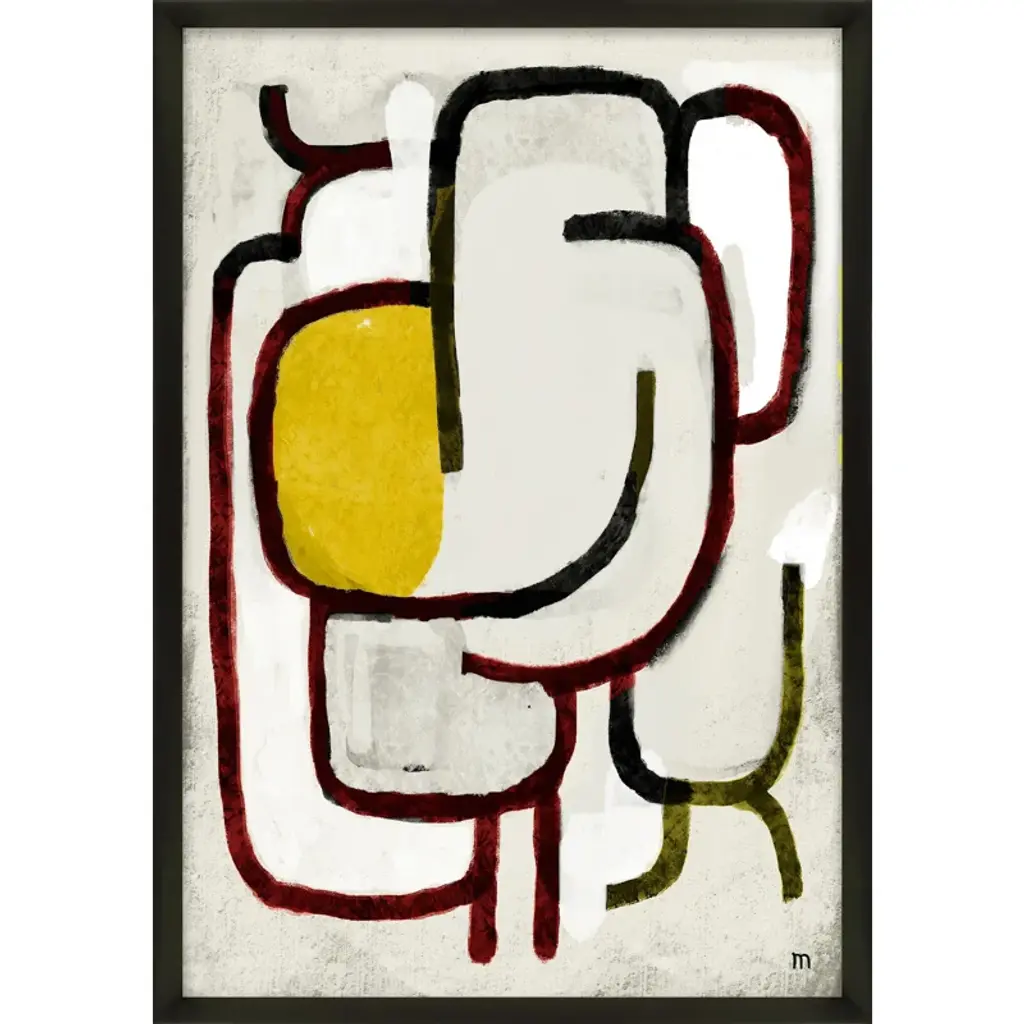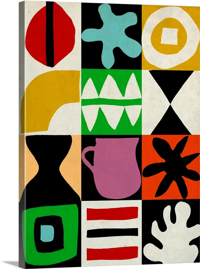 Eclectic is a colorful pair of graphic symbols of shapes, urns, starburst, and lines all stacked into a bold art statement. Featuring a giclee print mounted under a 2.5" deep lucite shadow box, the artwork print is attached to a linen wrapped interior panel and finished with black nail head in each corner. Each panel is sold individually. Artwork may be hung individually or as a pair. Measurements: 26"H x 20"W x 2.5"D. Materials: acrylic frame, interior board mount, giclee paper print.