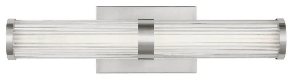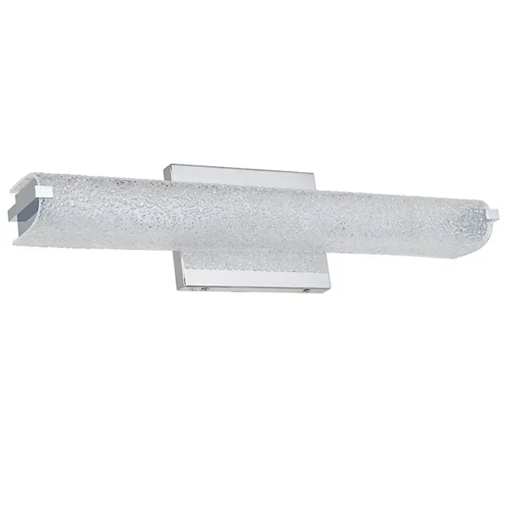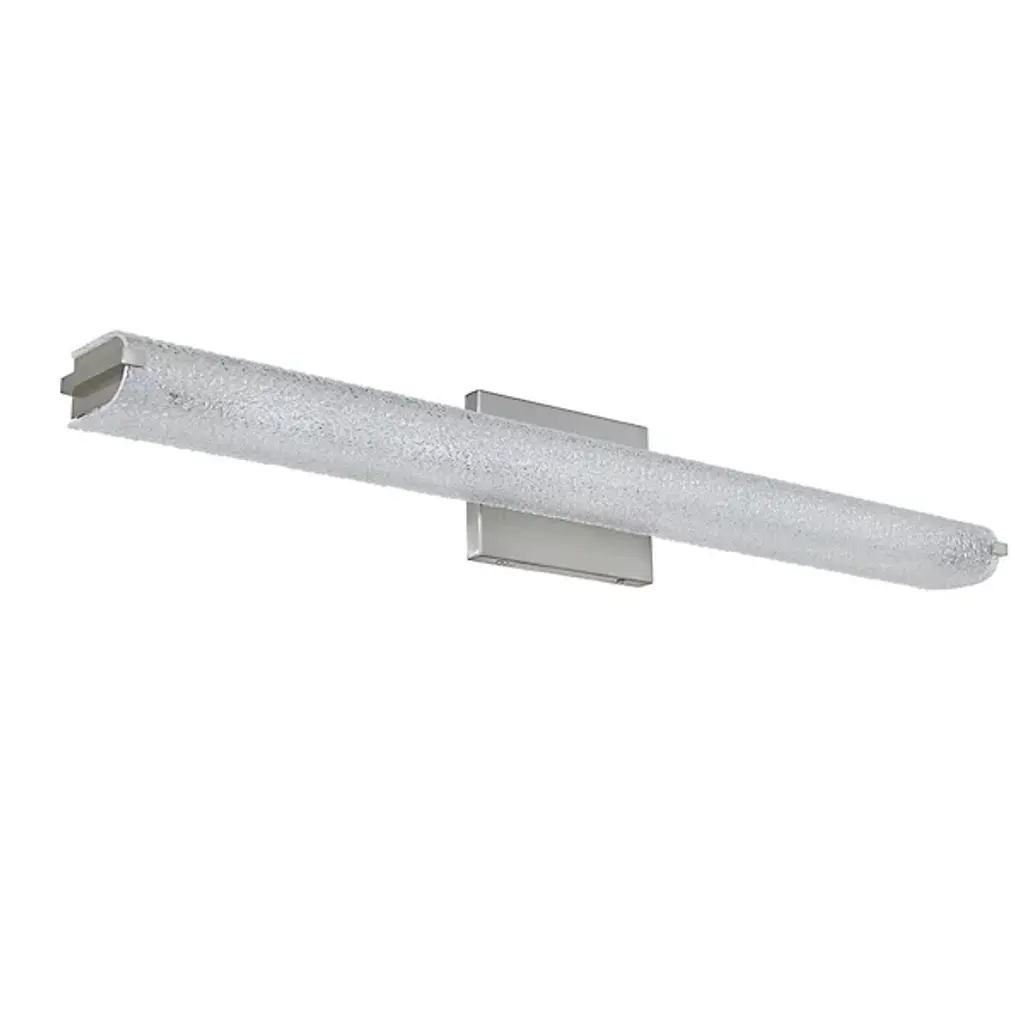 The Eco LED Vanity Light by Abra Lighting adds the ideal amount of glamor to bathrooms and vanities. A lustrous metal backplate mirrors and enhances the fixture’s light while supporting a curved shade made of water glass that extends widely, diffusing the light from its integrated LED lamping. The textured glass creates a dazzling effect that comes alive when illuminated, while steel accents support the shade and offer an added decorative touch.