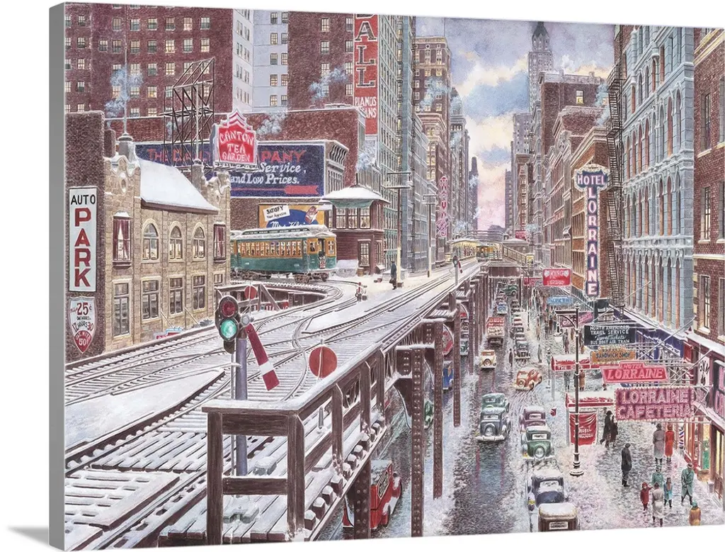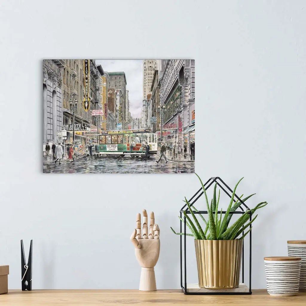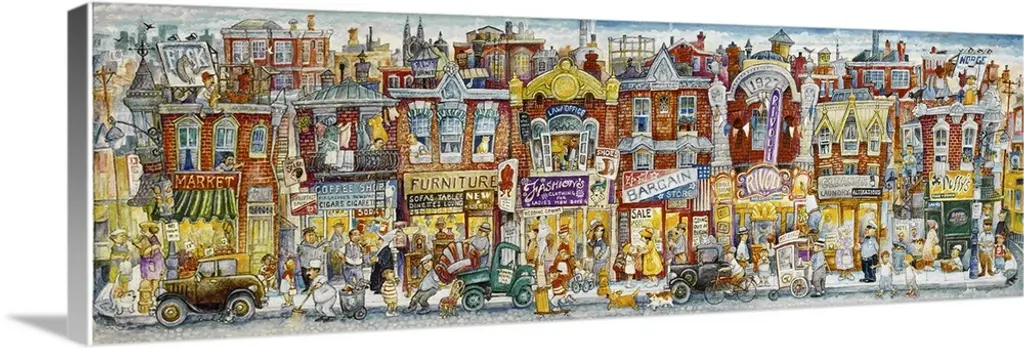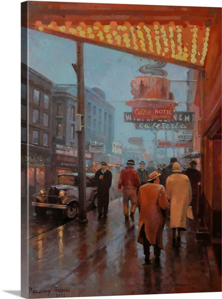 Contemporary painting of a bustling city street.