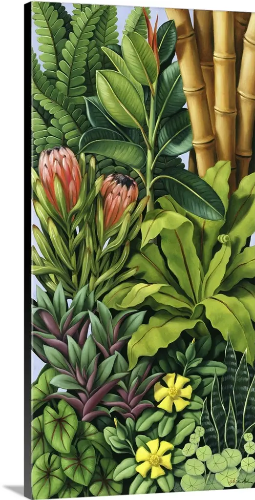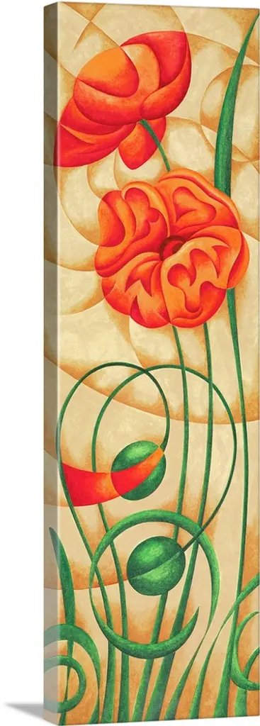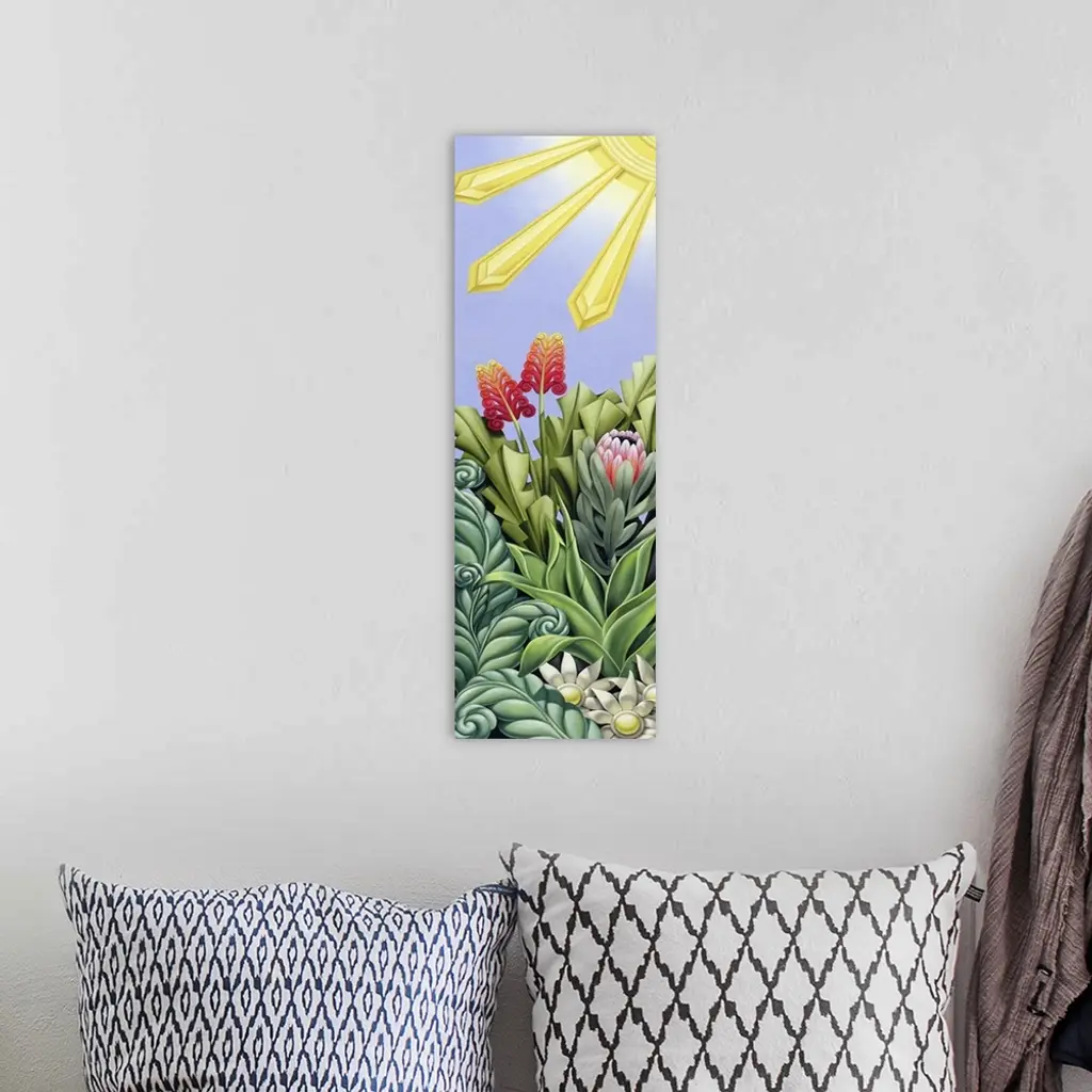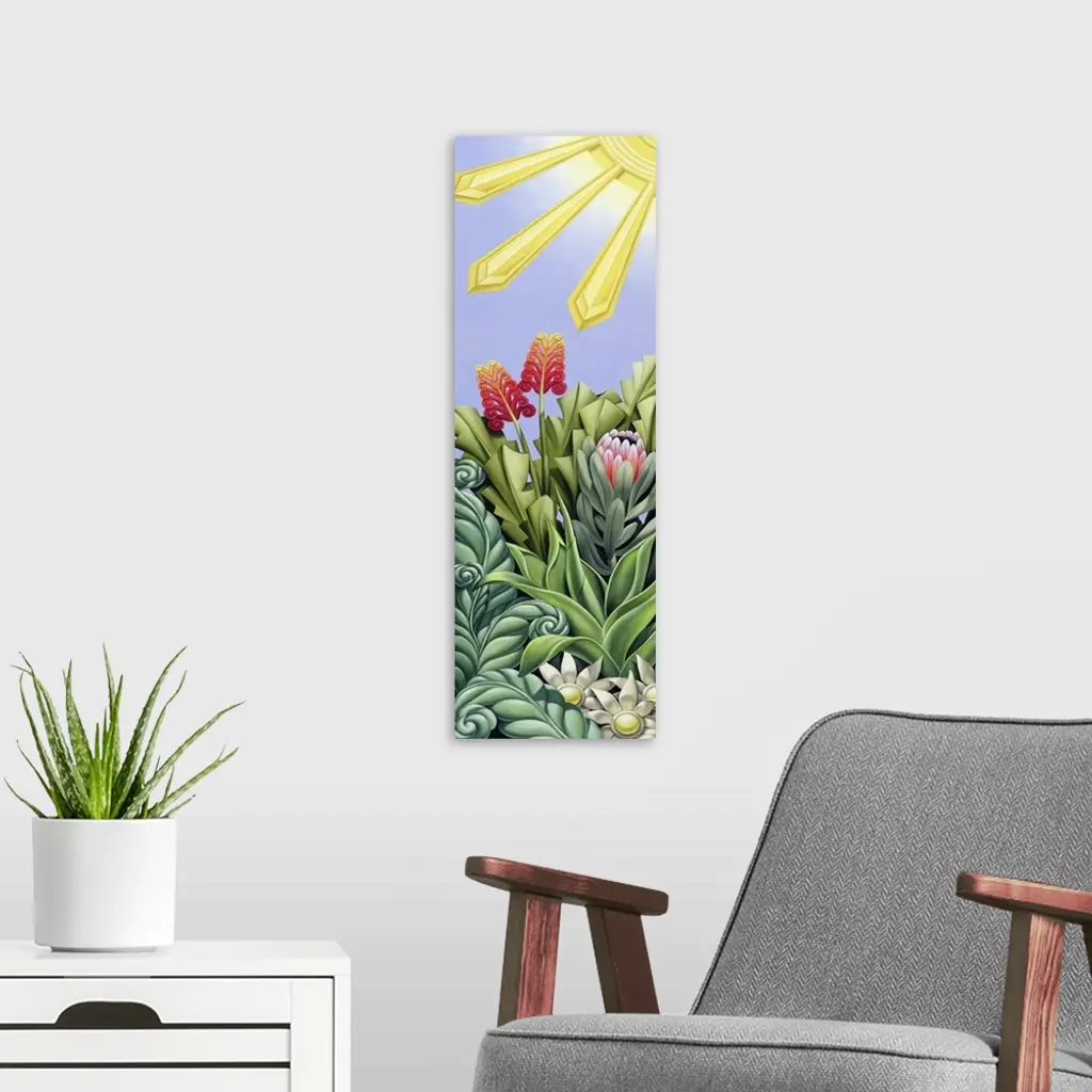 Contemporary art deco-style painting of sunlight shining down on a garden.