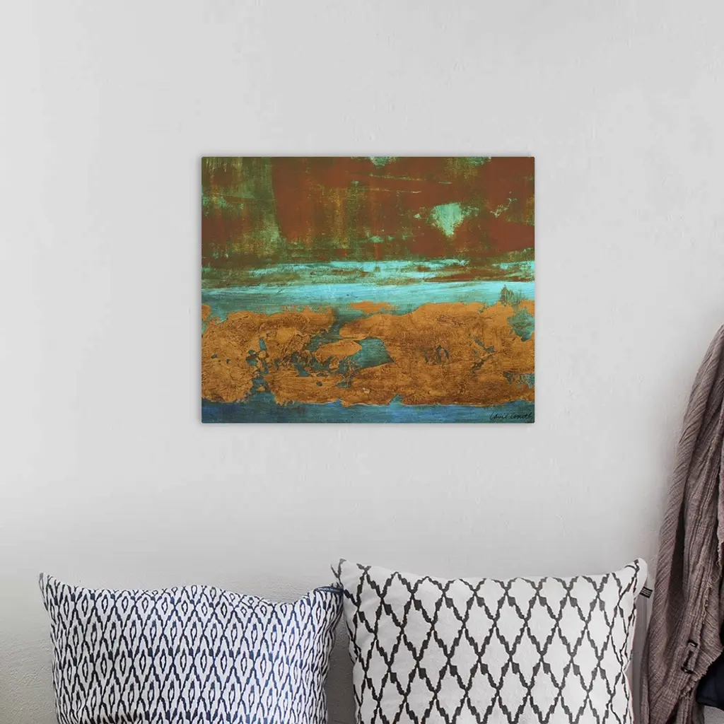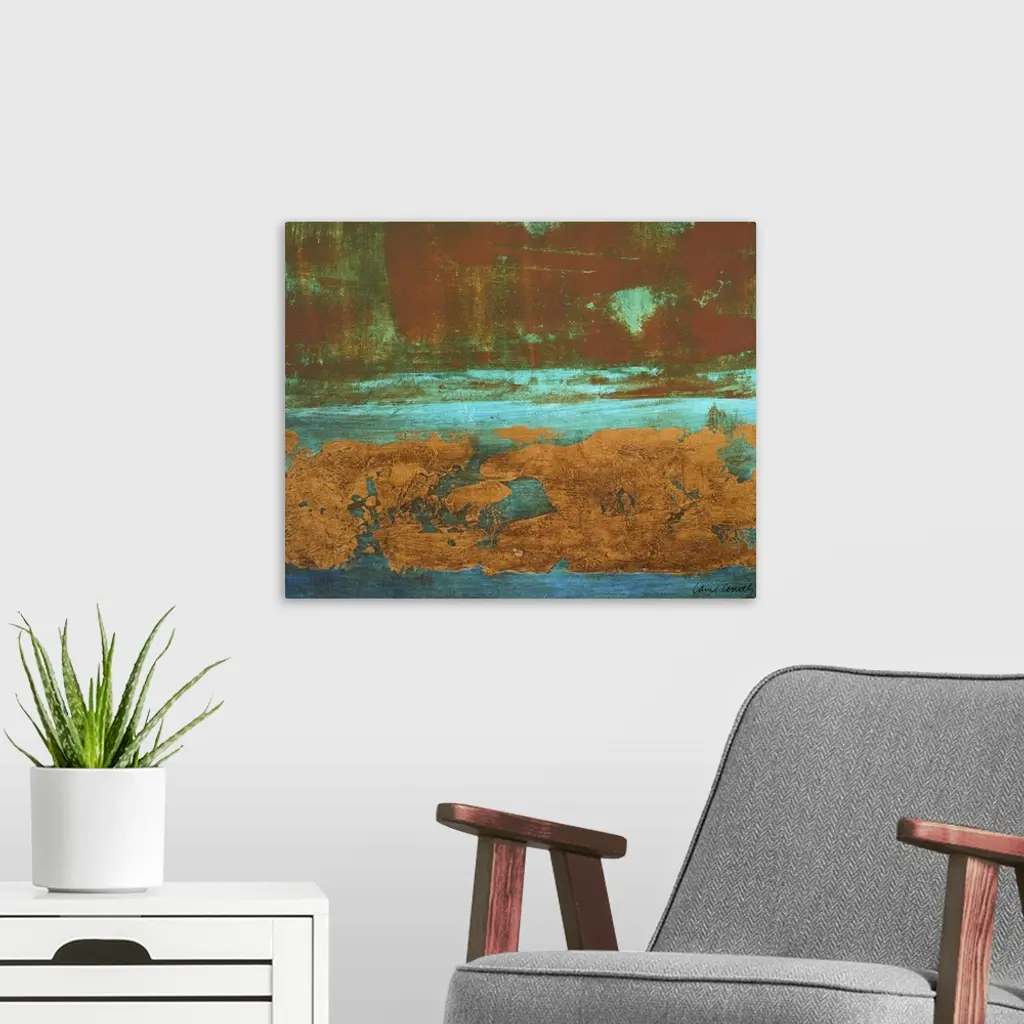 Contemporary abstract artwork in rusty copper shades on bright teal.