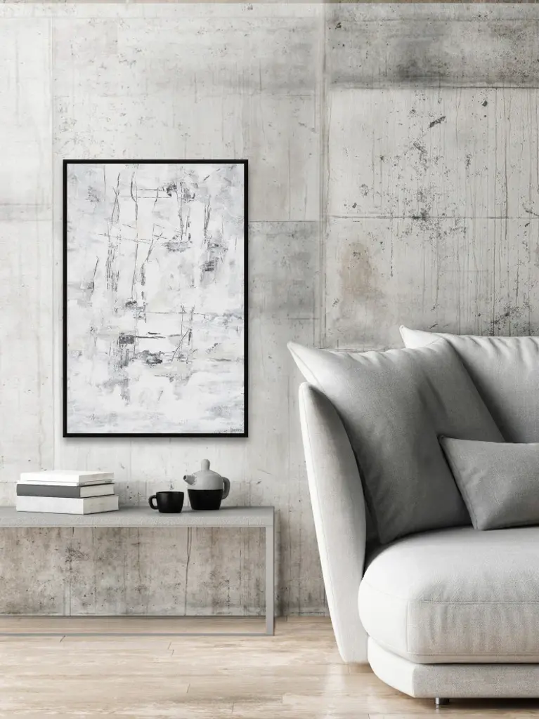 This cool, icy acrylic painting print features a snowy white abstract design with hints of gray and black. Proudly printed in the USA, this piece is printed on canvas before it''s stretched, and framed and mounted in a non-warping floater frame thereafter. With wall-mounting hooks included, this artful accent is ready to hang up as soon as it reaches your front door.Canadian artist, Parvez Taj uses water paints, photographs, software, and UV cured inks to create his wall art. His artwork connects the out-of-reach luxury art world with the modern, fashion-conscious home decorator by delivering high quality artwork that is both affordable and hip.Durable art print on high quality canvas by Parvez TajProfessionally hand stretchedFramed and mounted in non-warping floater frameArrives ready to hangIncludes a certificate of authenticityArtist signature on the front
