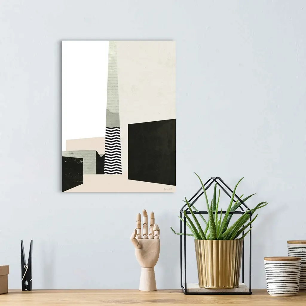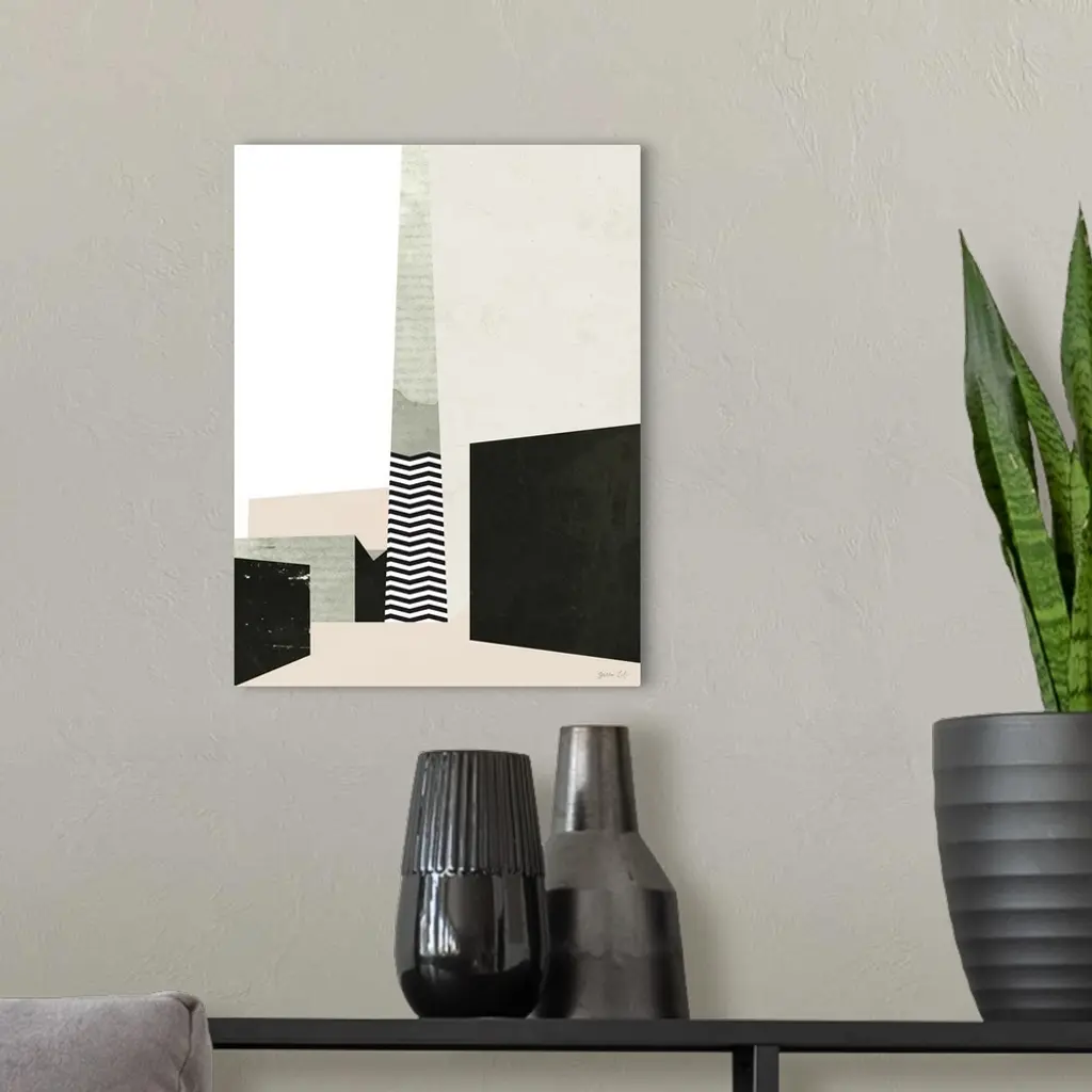 Geometric abstract painting of shapes in black, beige, and pale pink.