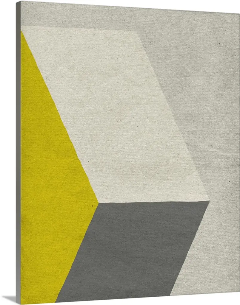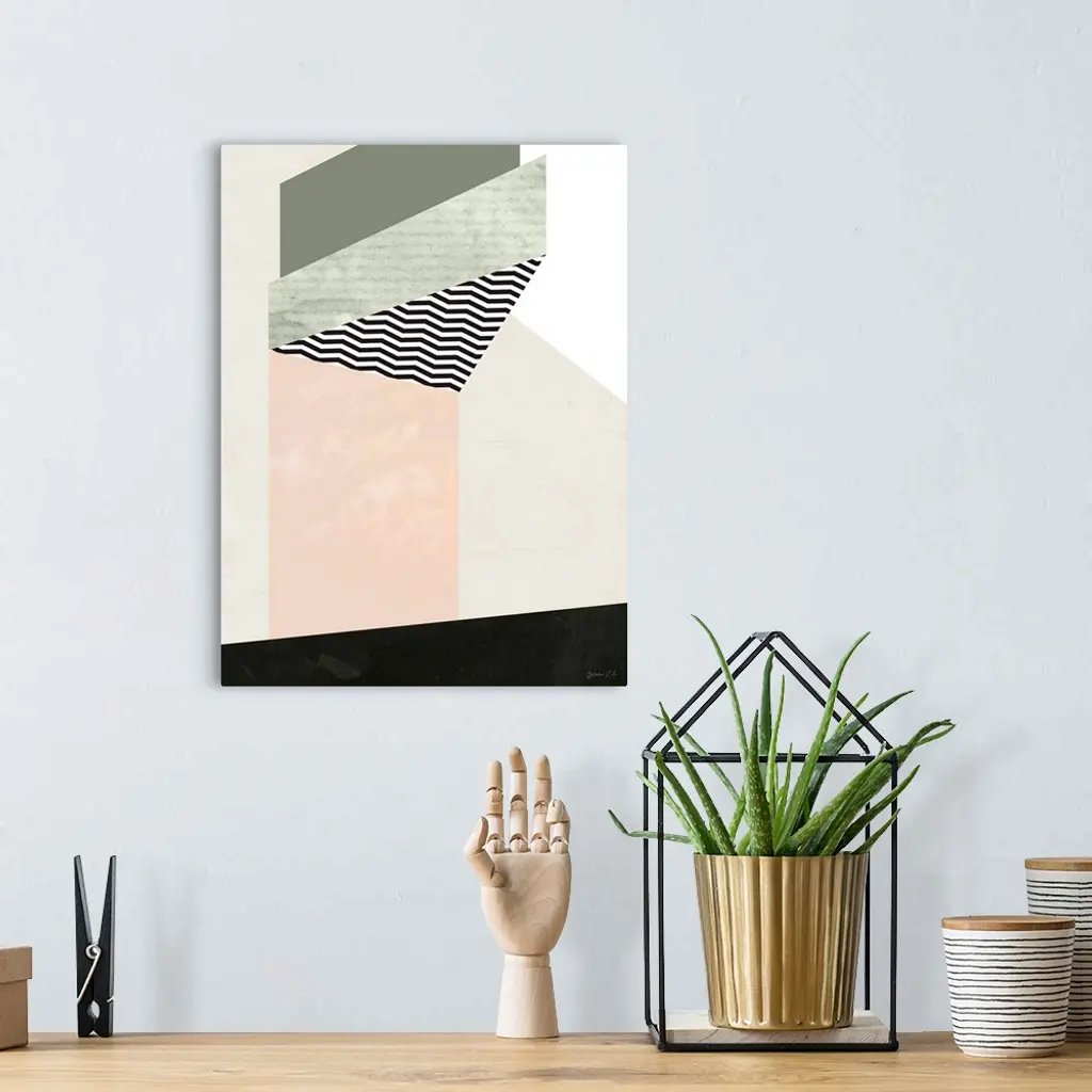 Geometric abstract painting of shapes in black, beige, and pale pink.